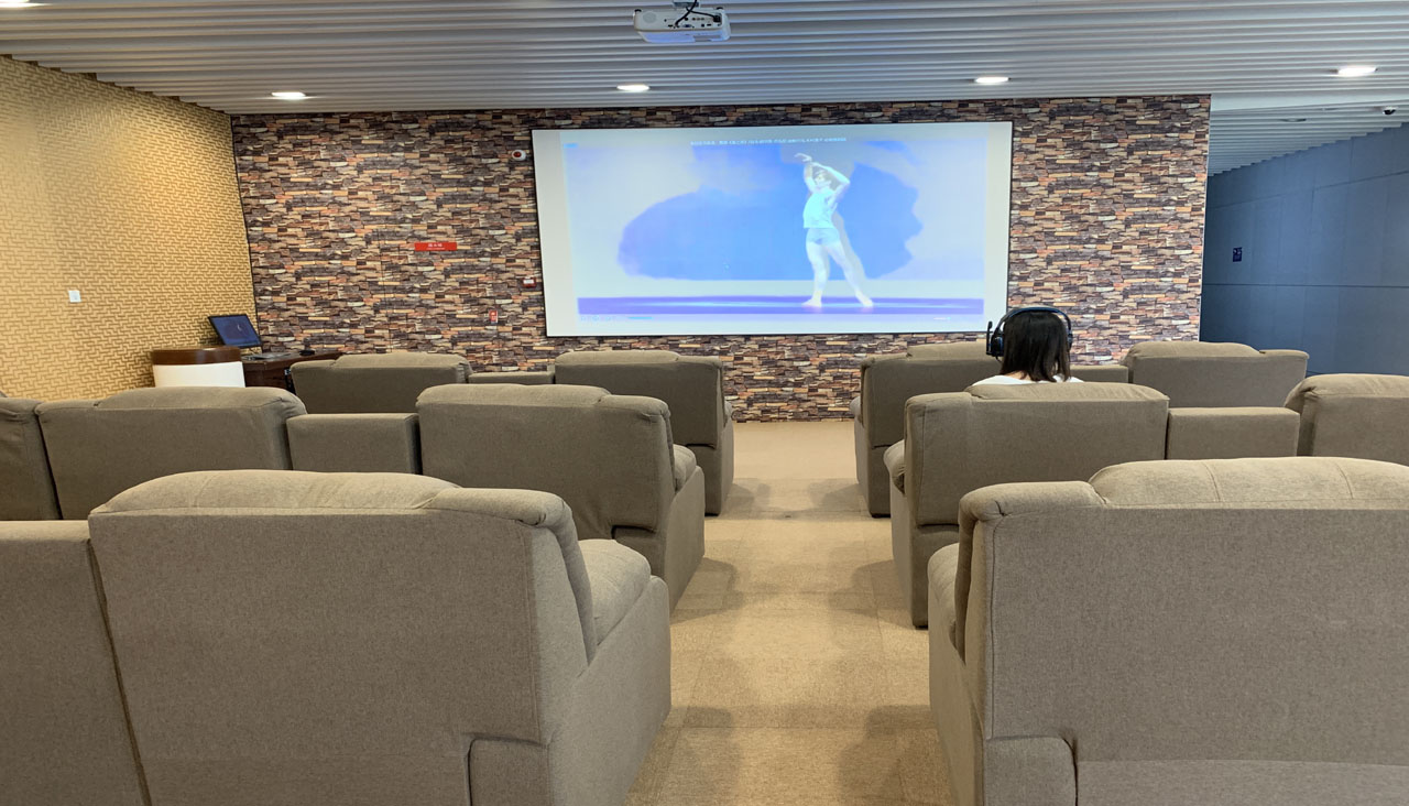 数字音乐剧场为整个区域的左上角,配备有投影仪,沙发座椅,每个座椅配置一个耳机,由工作人员安排视频的播放,场次时间暂定安排为: