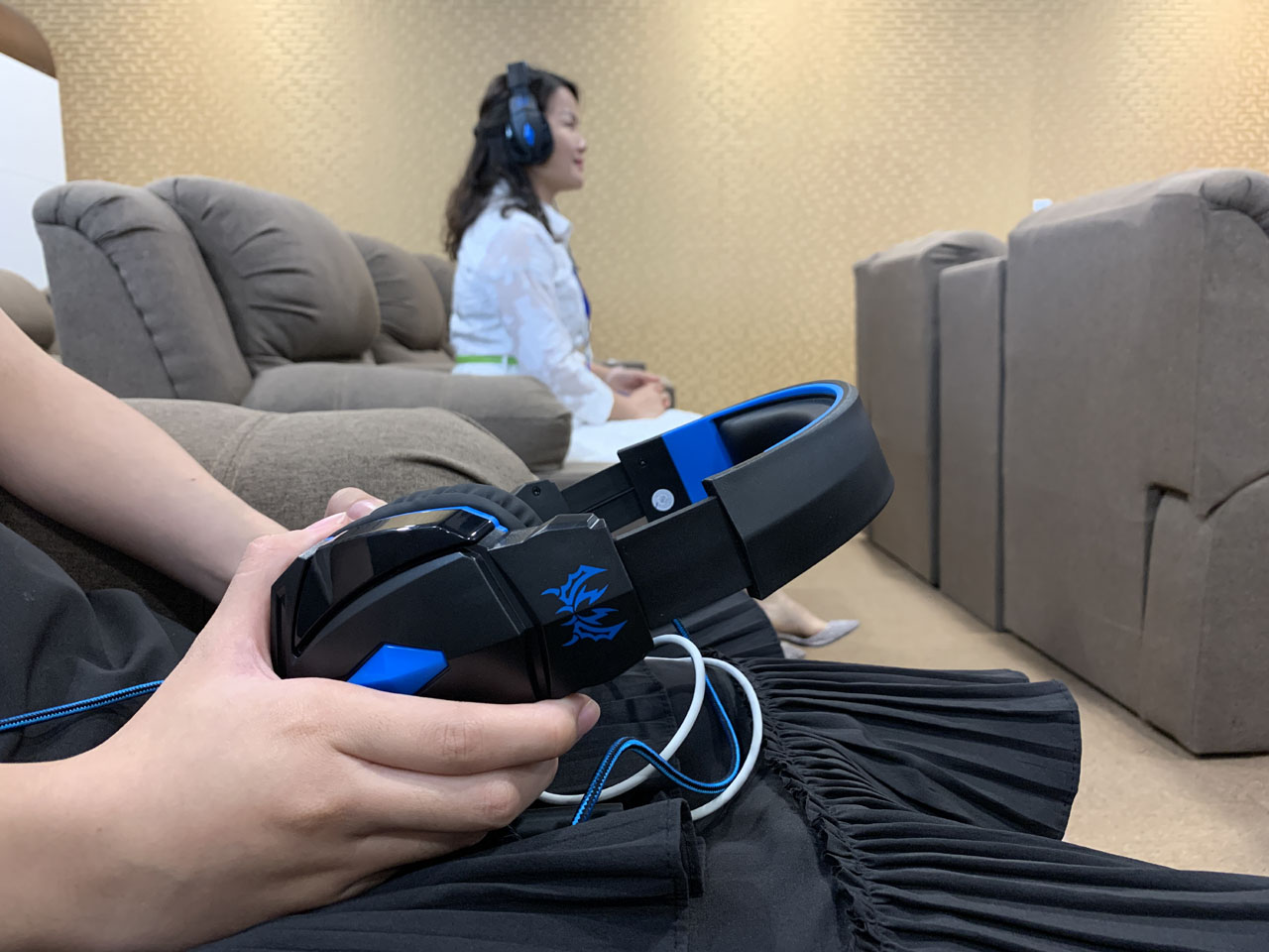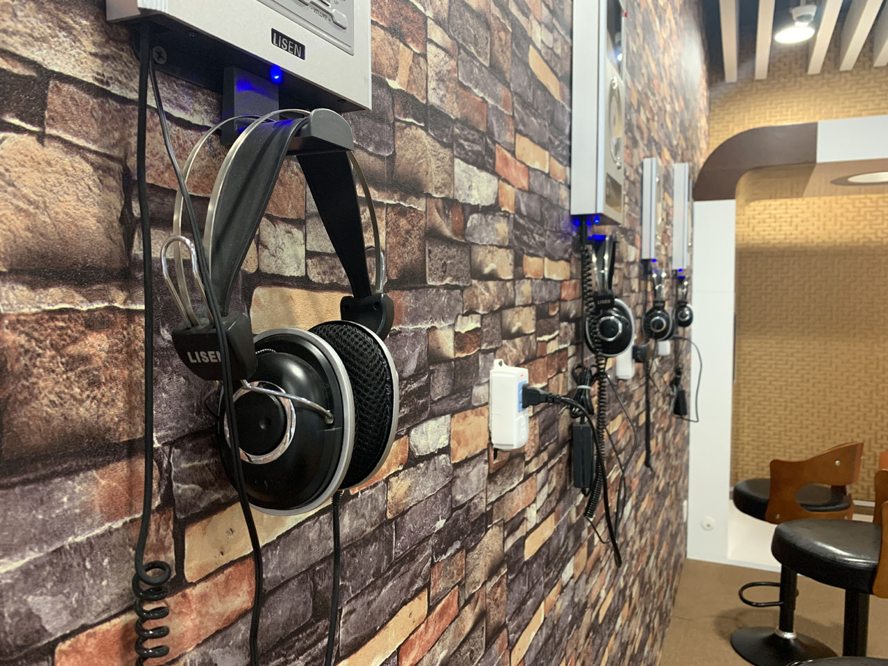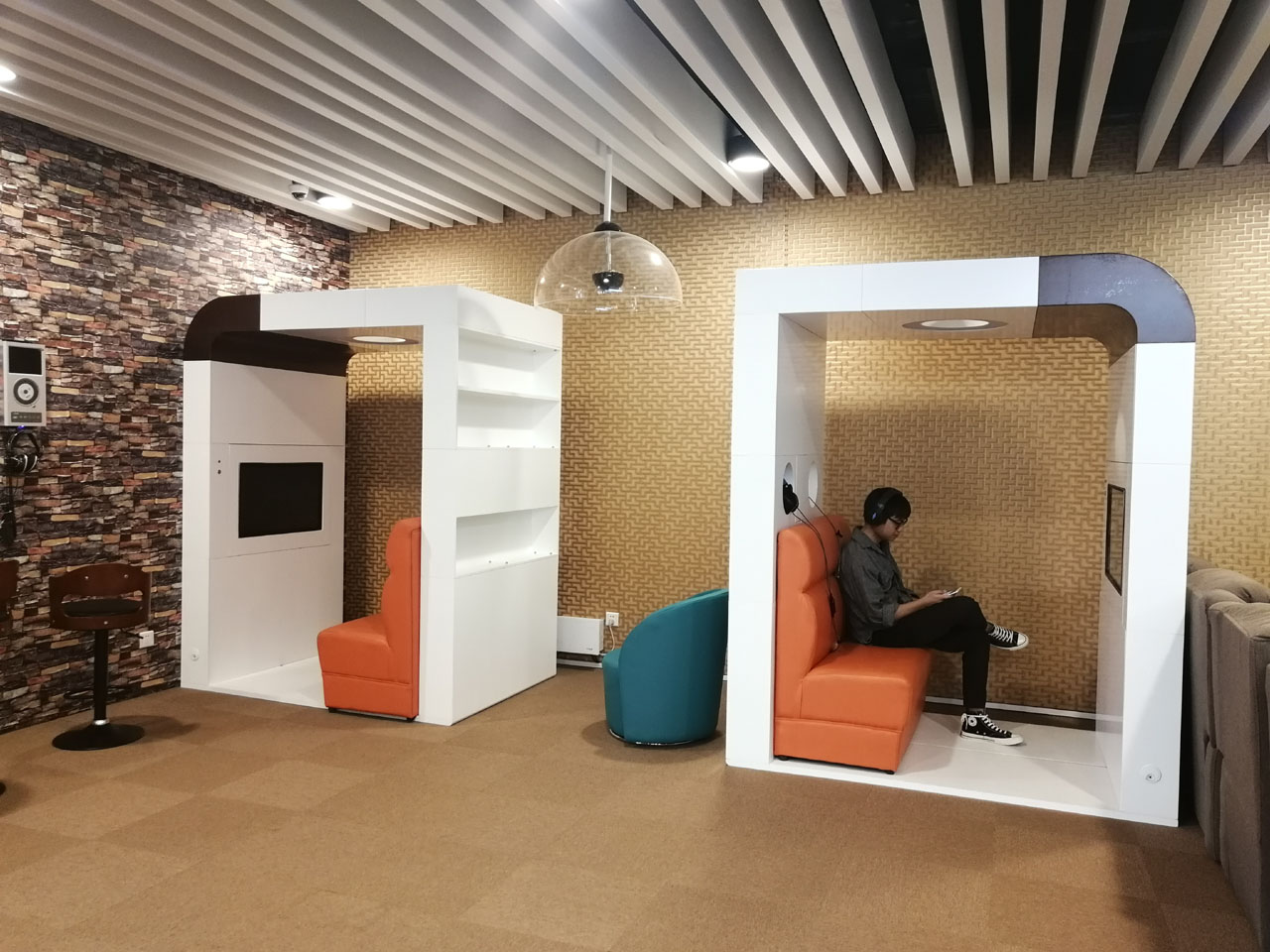 在数字音乐剧场后方设置了两套创意微型音乐厅,类似于双人卡座间,里面配置有显示器,读者可选择里面的内容进行播放。两个微型音乐厅之间有个红外自动音乐播放聚音罩,当人坐到椅子上,头顶上的播放器就会自动感应播放音乐。