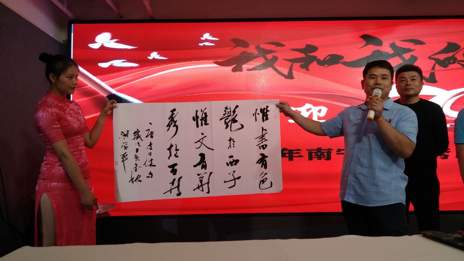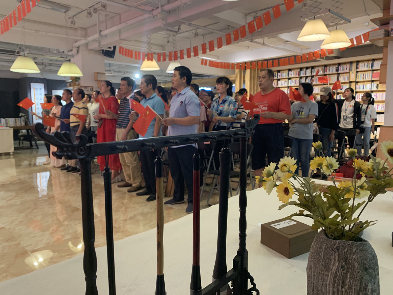 活动开场时,现场观众和参赛者手举国旗,一同起立高唱歌曲《我和我的祖国》,为祖国生日献礼,唱歌过程中观众们热情高涨,爱国之情溢于言表。活动现场,著名书法家洪学平和仇文峰笔走龙蛇、挥斥方遒,把本次展评大赛推向了高潮。