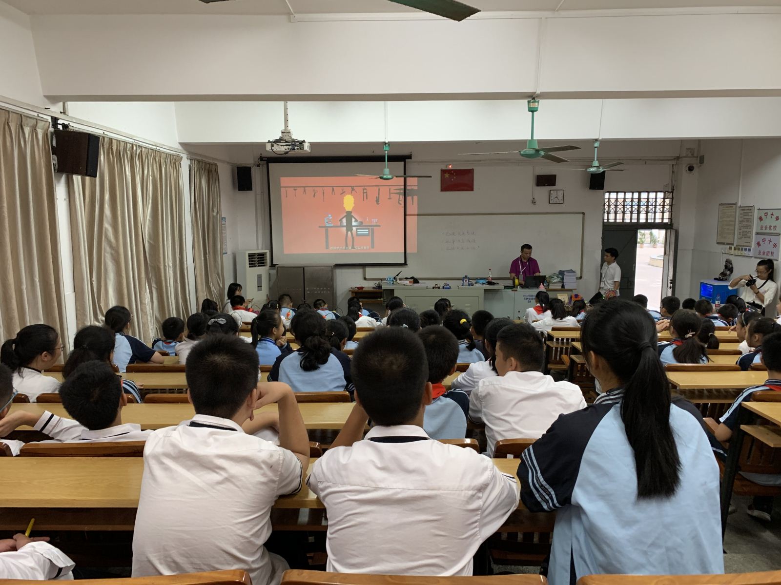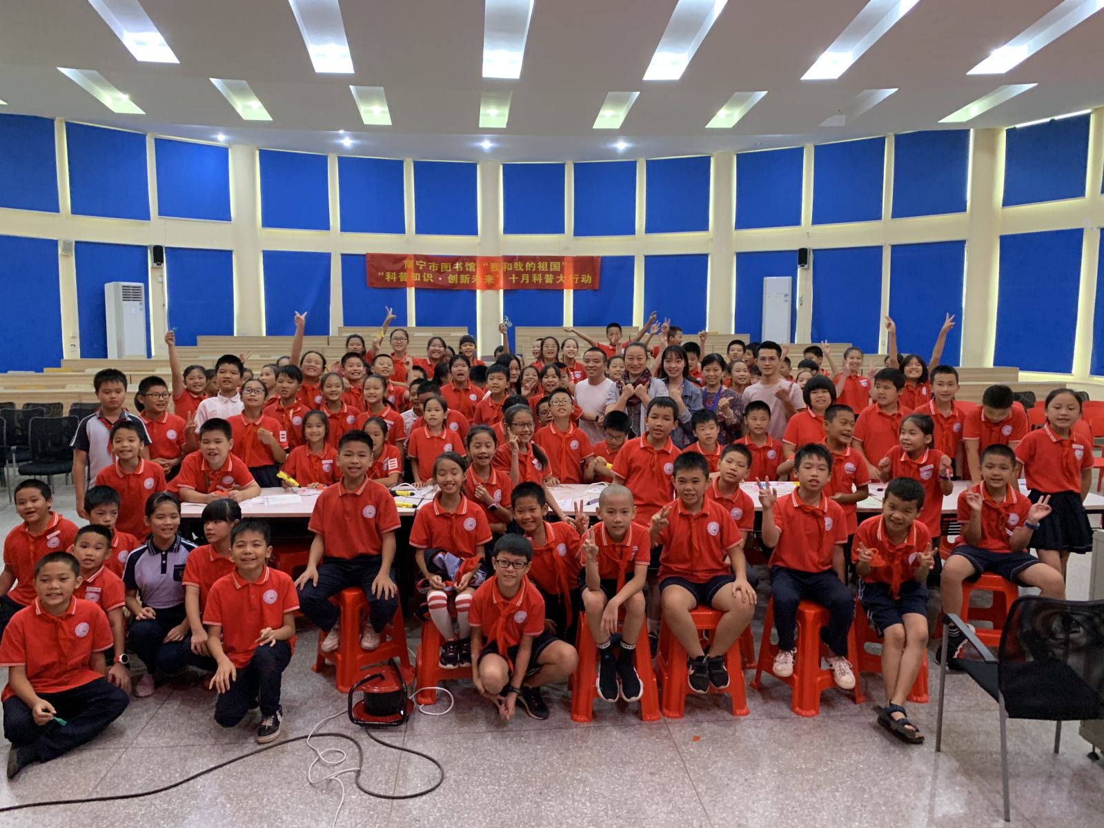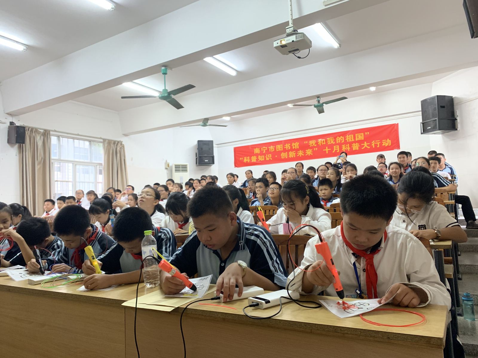 为贯彻落实《全民科学素质行动计划纲要》,使绿城青少年了解基本科学素质和必要的科学技术知识,掌握基本的科学方法,培养青少年读者树立科学思想,崇尚科学精神,并具有一定的应用它们处理实际问题、参与公共事务的能力,增强青少年获取和运用科技知识的能力、改善生活质量、实现全面发展;也为扩宽青少年读者的科技视野,激发和培养读者对创客教育、科技教育的兴趣,通过创客项目来强调基础学科的重要性,激发读者学习基础学科的兴趣;推动学校科技创新活动的开展,响应国家科教兴国的号召,南宁市图书馆在2019年10月17日下午和2019年10月22日下午分别走进南宁市五象小学和南宁市第十中学,为青少年读者们带来题为“我和我的祖国”——“科普知识·创新未来”的科普讲座。