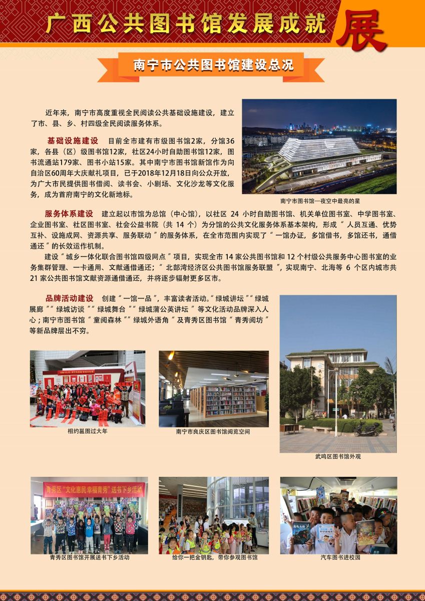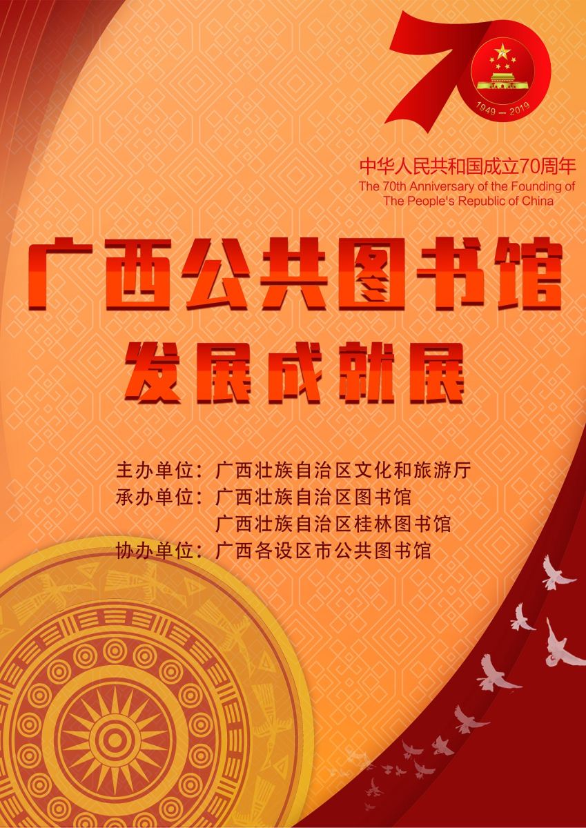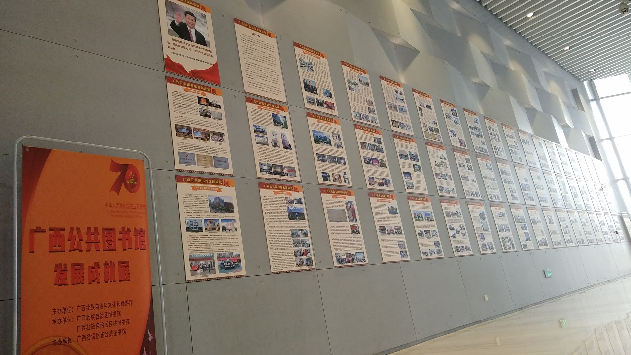 为庆祝中华人民共和国成立70周年,大力弘扬以爱国主义为核心的伟大民族精神,反映新中国成立70年来,广西公共图书馆在满足全区人民群众不断增长的精神文化需求,提升群众文化获得感,促进公共文化服务体系建设方面所起的作用,在广西壮族自治区文化和旅游厅的领导下,南宁市图书馆在2019年10月1日起举办了“我和我的祖国·广西公共图书馆成就图片展”。
