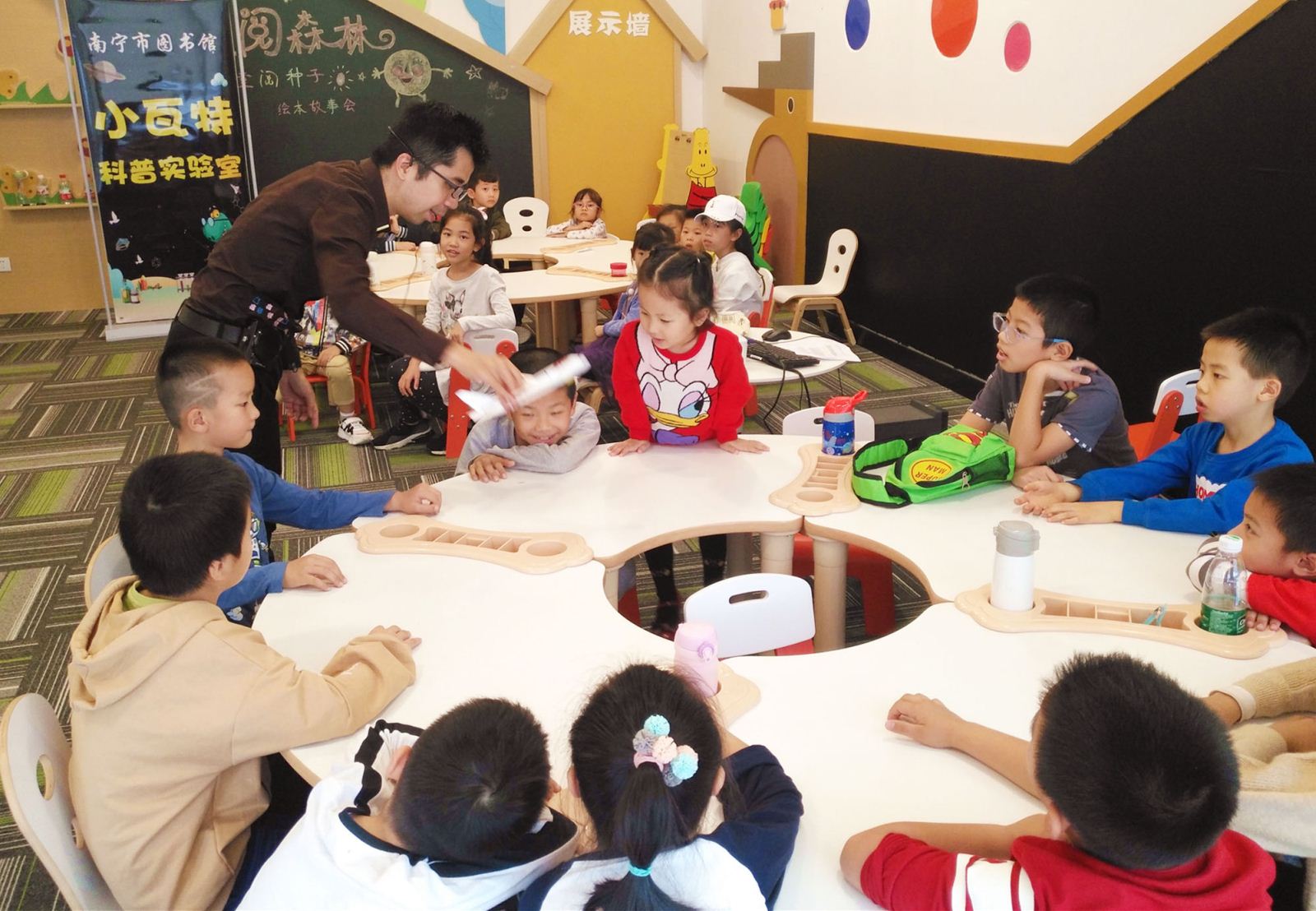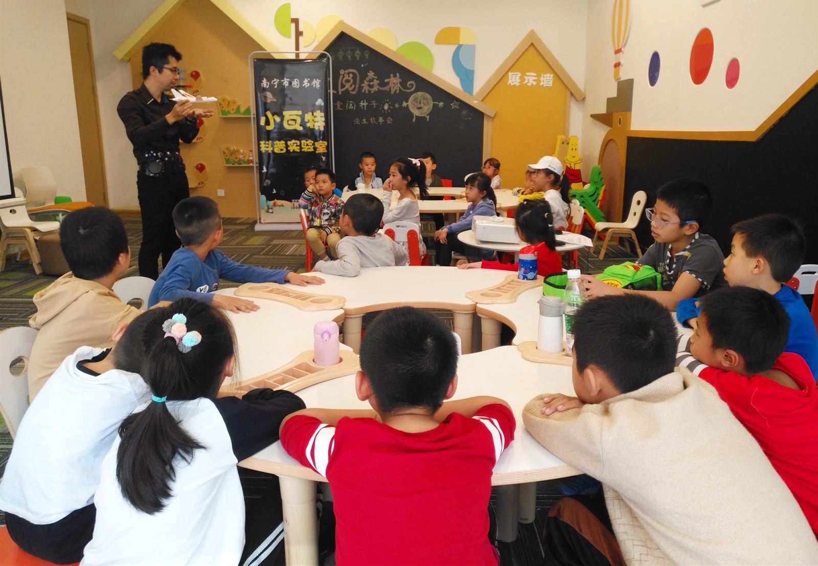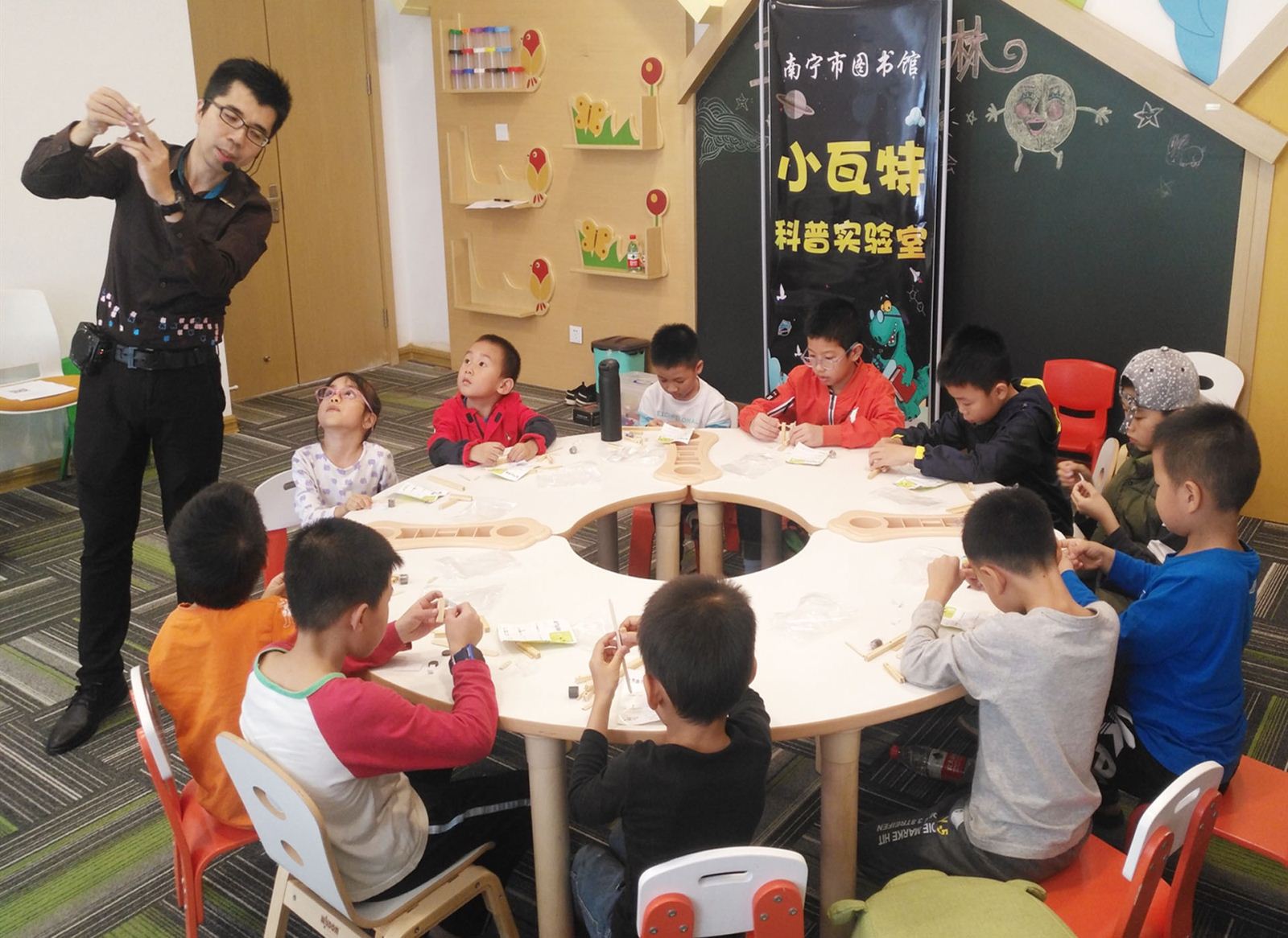 11月24日下午,40名小朋友在南宁市图书馆手工活动教室里分为两组,分别参加了“小瓦特科普实验室”科普课堂活动。