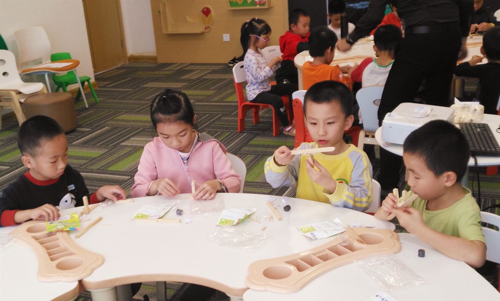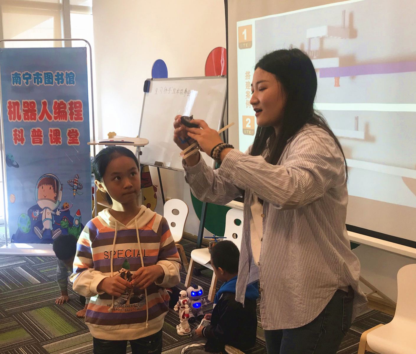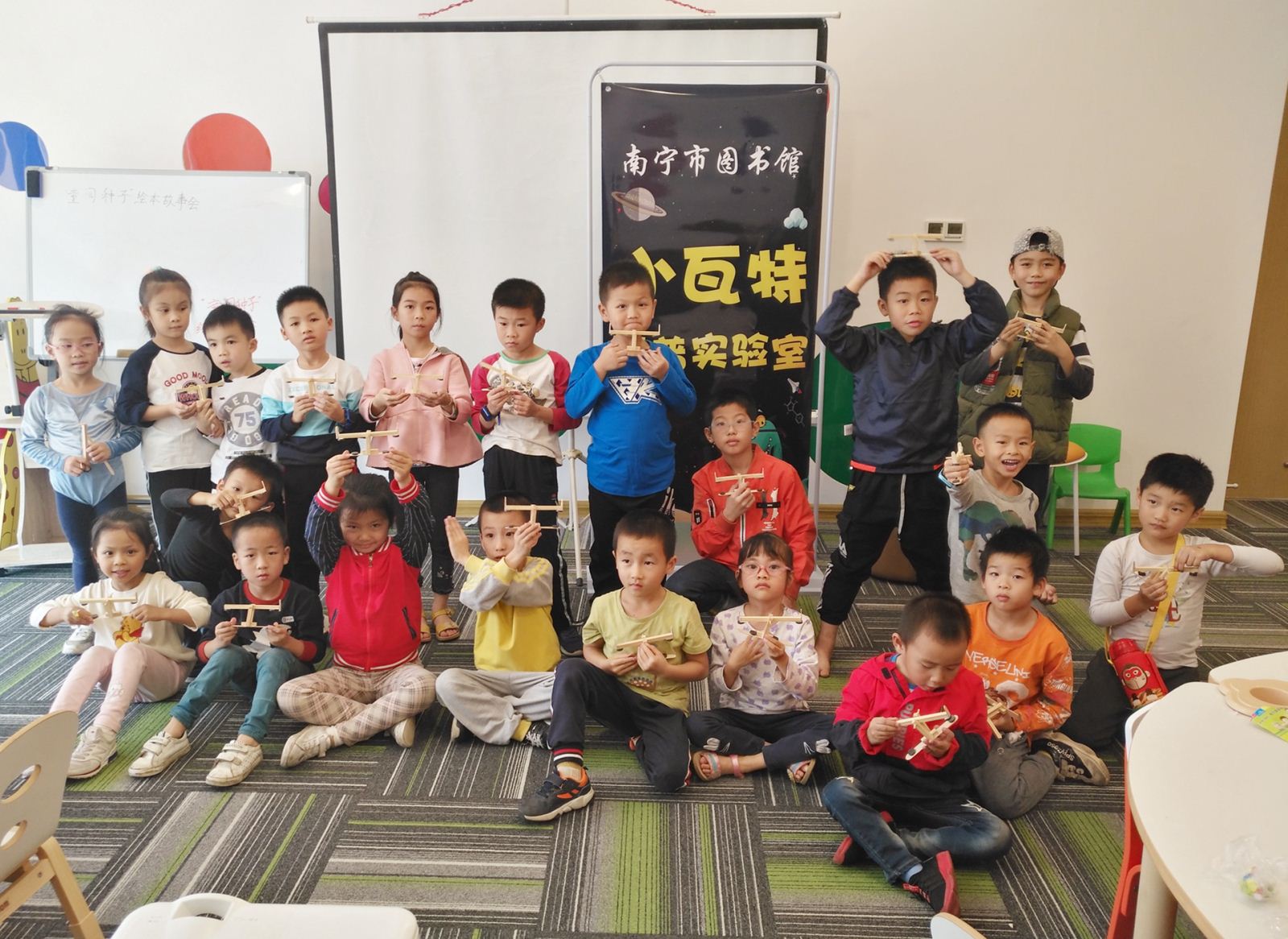 11月24日下午,40名小朋友在南宁市图书馆手工活动教室里分为两组,分别参加了“小瓦特科普实验室”科普课堂活动。