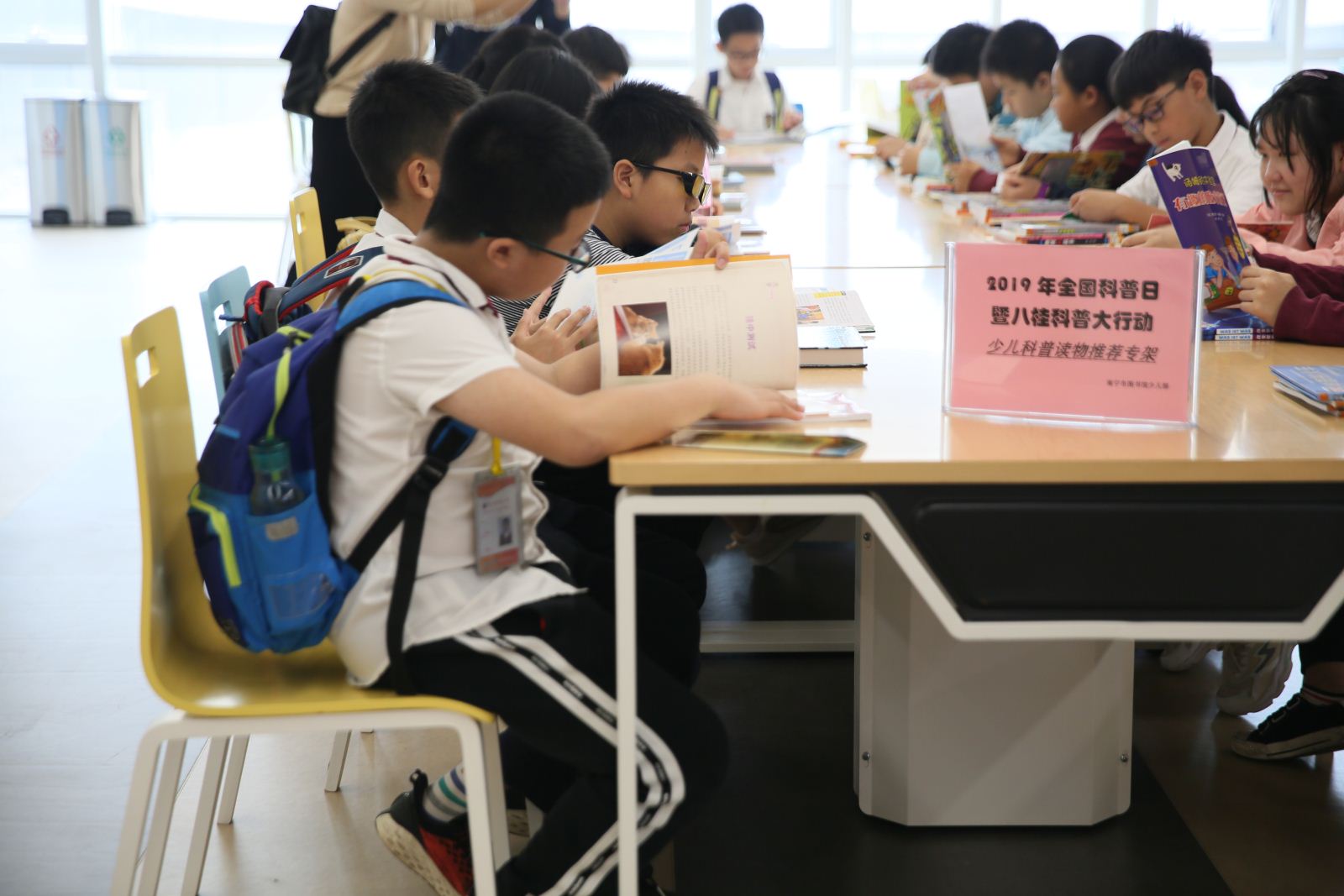 市图书馆老师为学生们精选了科普新书。瞧,孩子们看得津津有味呢!