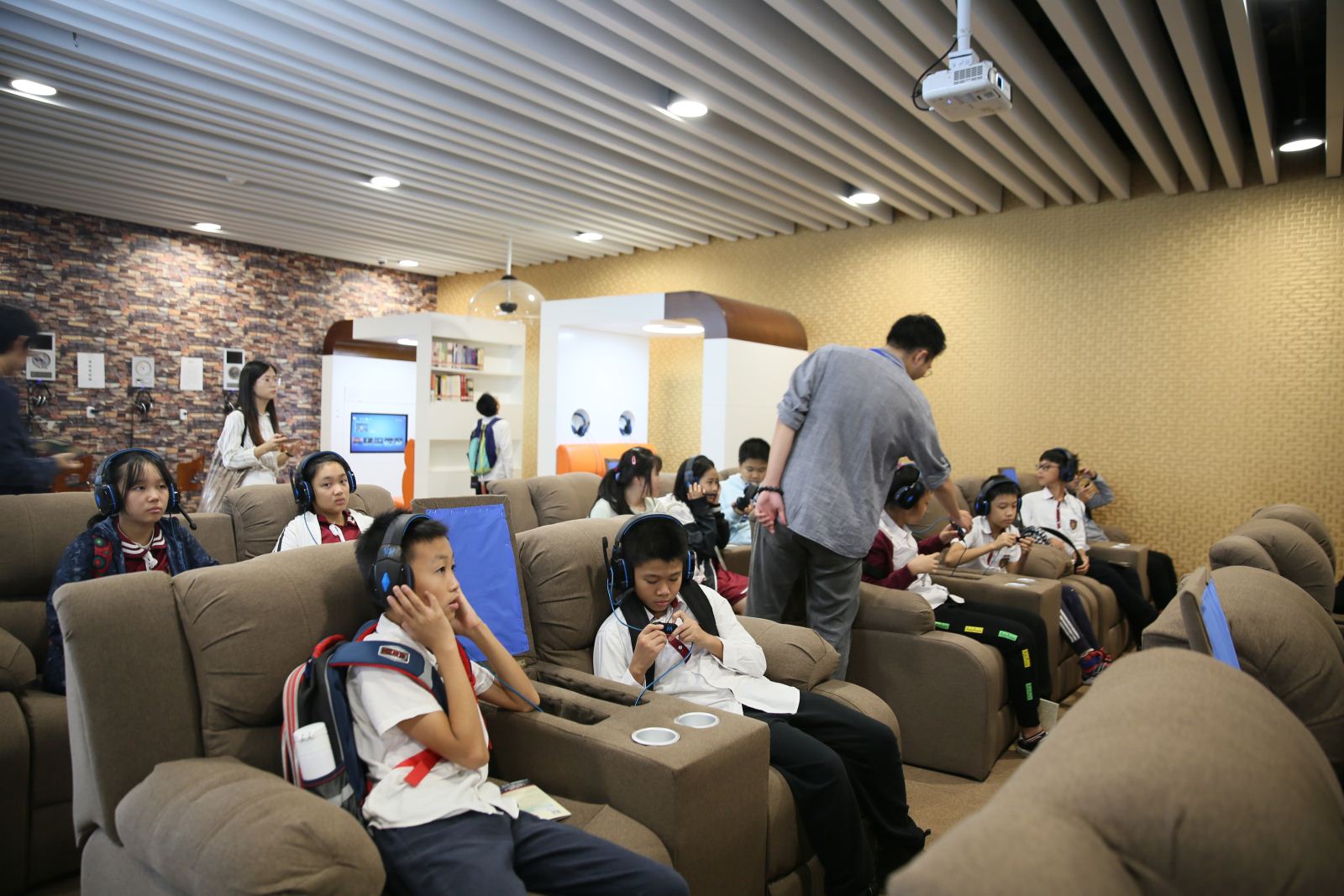 孩子们带上耳机,欣赏一段歌剧放松一会儿。