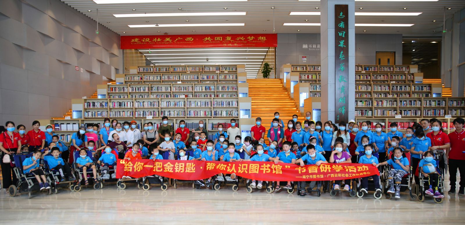 7月17日上午,广西云彩社会工作服务中心的部分残障儿童和他们的老师、家长及志愿者们一行96人来到南宁市图书馆,共同开展“给你一把金钥匙,带你认识图书馆”活动,共沐文化阳光,感受阅读的魅力。图书馆的老师带领残障人士小读者参观了图书馆视障阅览区、服务大厅、少儿阅览室、多媒体体验区、音乐图书馆和创客空间等,向他们介绍了图书馆不同区域的功能、服务项目及使用方法,引导鼓励残障读者们多读书、读好书,不断学习新知识、拓宽新视野。