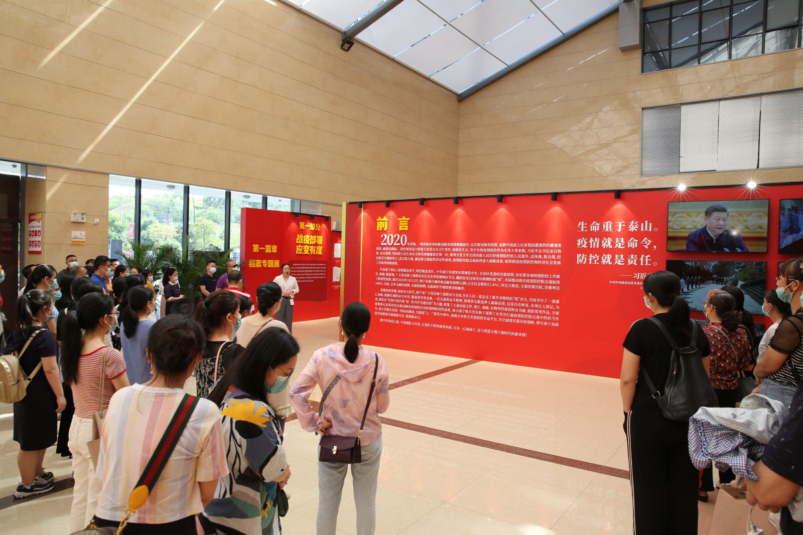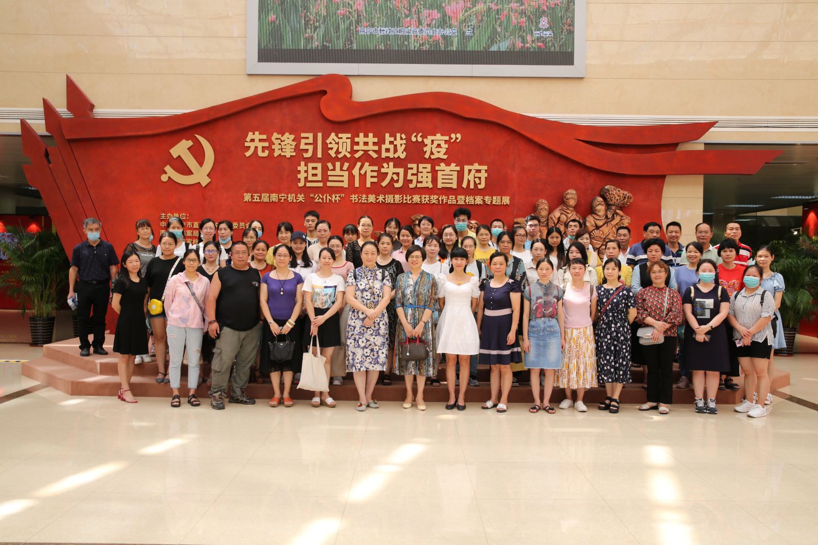 2020年伊始,新冠肺炎疫情突如其来,中共南宁市委坚决贯彻党中央、自治区党委的决策部署,切实把各项工作抓实、抓细、抓落地,坚决打赢疫情防控的人民战争、总体战、阻击战。为了生动记录和展现我市上下与全区、全国人民一道奋力抗击新冠肺炎疫情的历史时刻,市直机关工委、市档案局、市国家档案馆联合主办“先锋引领共战‘疫’·担当作为强首府”第五届南宁机关“公仆杯”书法美术摄影比赛获奖作品暨档案专题展览。7月24日,南宁市图书馆一行70人在蒋桂香副馆长的带领下前往南宁市国家档案馆参观本次抗疫专题展。