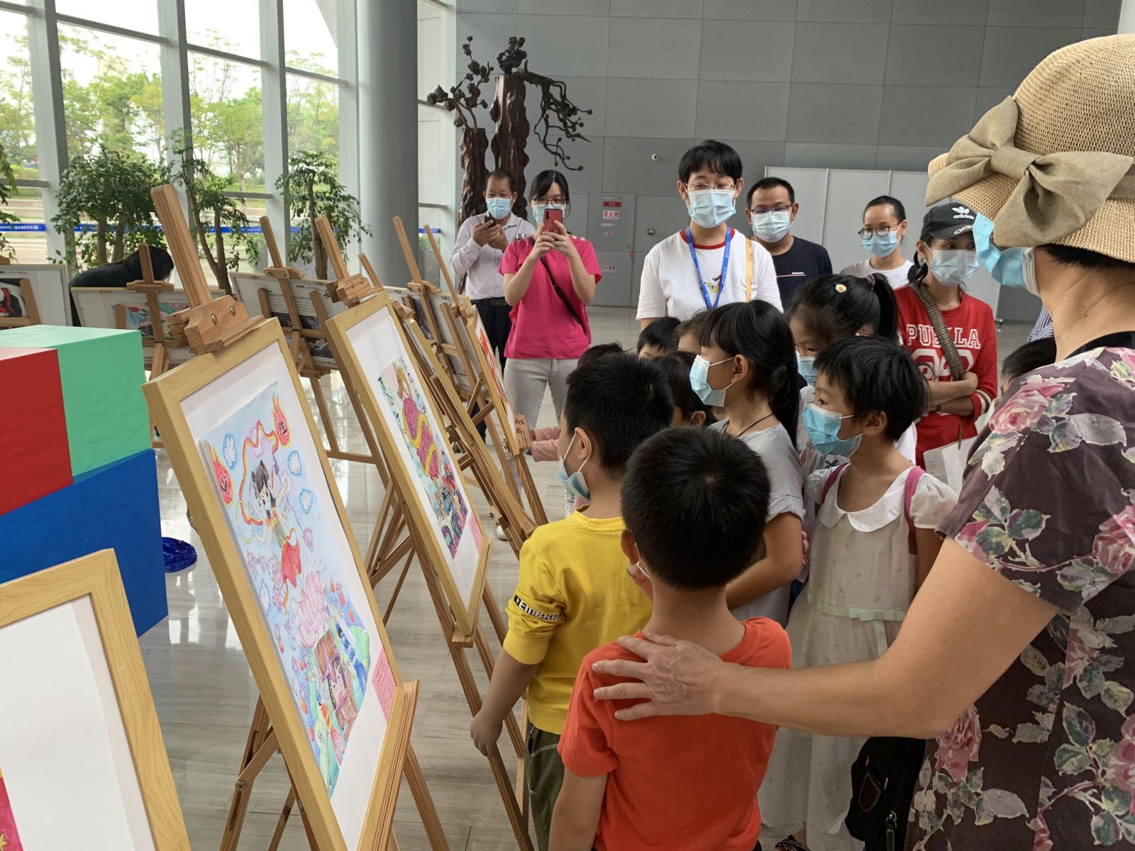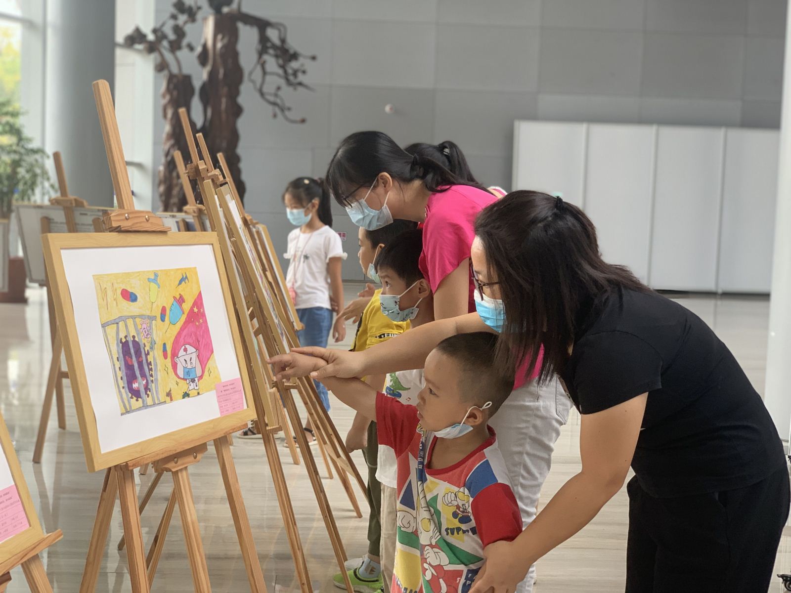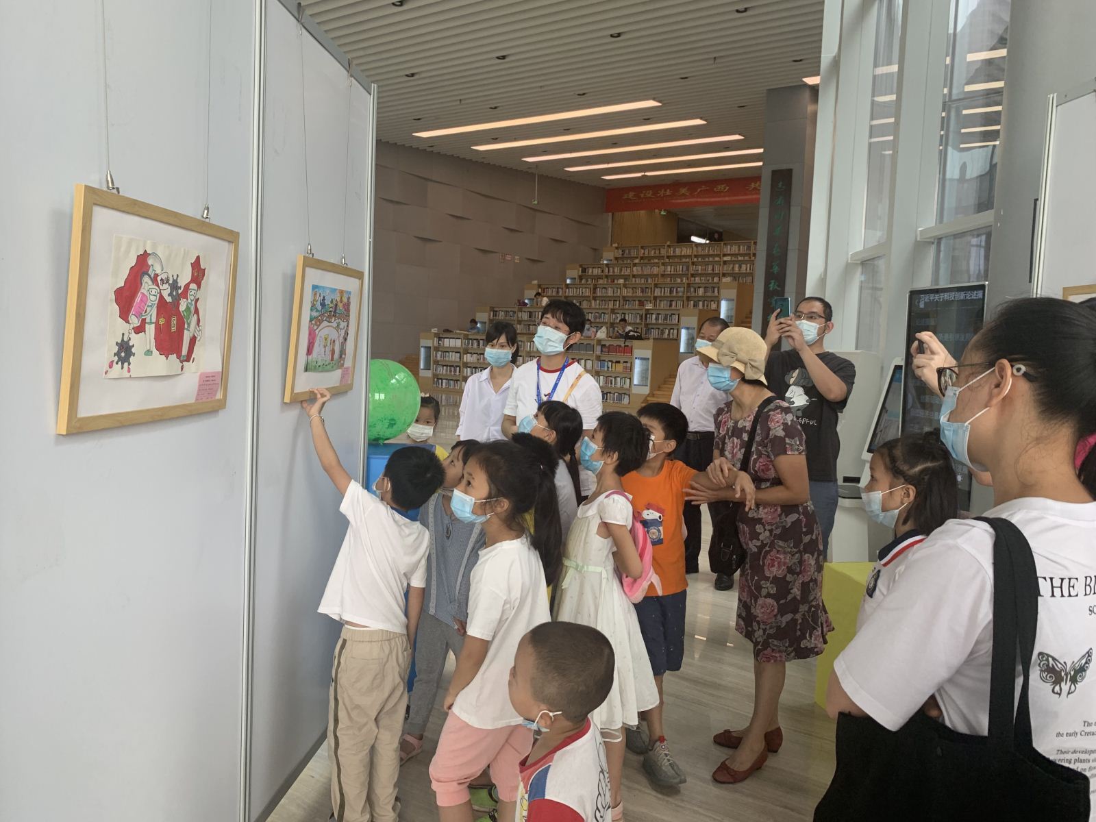 活动伊始,小读者们在城市客厅一起欣赏“童绘抗疫 欢庆国庆”暨“童画助力,同心抗疫”南宁市少年儿童公益绘画大赛获奖作品展。图书馆的老师邀请了六名自告奋勇的小读者向大家介绍和分享自己最喜欢的抗疫童画作品:有的说“我最喜欢《战疫之胜利归来》,因为里面有护士姐姐和美丽的鲜花”;有的说“我最喜欢《最美逆行者》,因为里面有医生奔赴医院去救治病人”;有的说“我最喜欢《万众一心 众志成城》,因为里面有中国的巨龙,还有各行各业的叔叔阿姨为抗疫而努力工作”;有的说“我最喜欢《坚守战疫》,因为里面有警察叔叔在站岗执勤,为医院和人民坚守大门”;有的说“我最喜欢《师徒降妖疫》,因为里面有唐僧、孙悟空、猪八戒和沙和尚都在用自己的武器和本领和病毒和怪兽斗!”……每当小读者在介绍的时候,大家都听得特别认真。当然,图书馆的老师们也不会放过鼓励更多小读者补充发言,大胆发表自己看法的机会呢。通过欣赏优秀儿童抗疫绘画作品,小读者们学习了科学防疫知识,树立了健康生活、珍爱生命、保护自然的观念,激发他们的爱国主义情感,大家通过观展和讨论,一起向英雄致敬,向祖国祝福!
