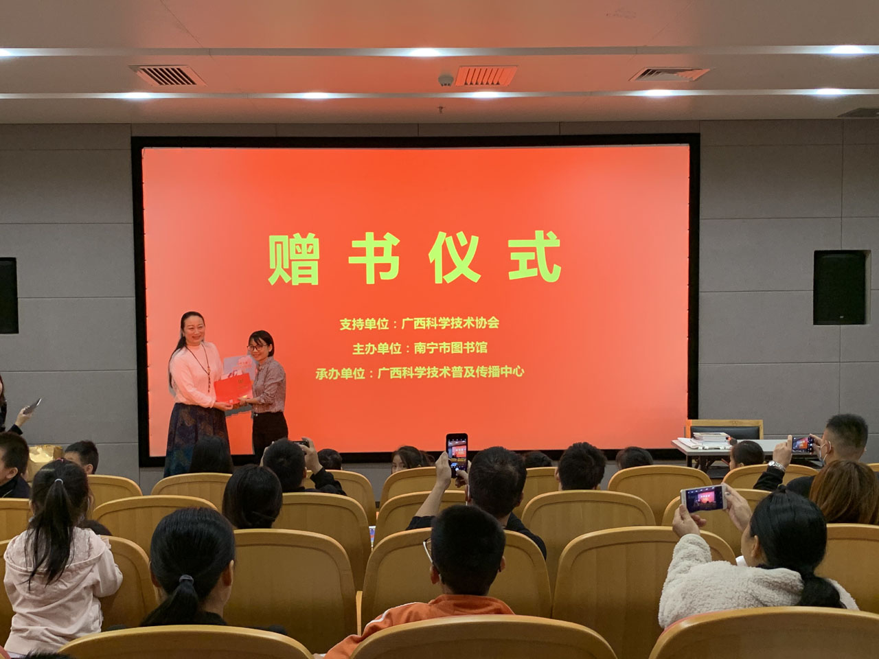 在讲座开始前,南宁市图书馆接受了广西科学技术普及传播中心赠与的《科普金童谣》《大开眼界》《歌谣绘广西》《话说成长》《我最闪亮》《我是小小创客》《小博士报》合订本等一批赠书,南宁书图书馆将把赠书作为永久收藏及时著录上架为广大读者提供科普阅读服务。现场的读者们表示,已经迫不及待的想要预约最新上架的科普读物,成为第一位阅读这批赠书的读者!