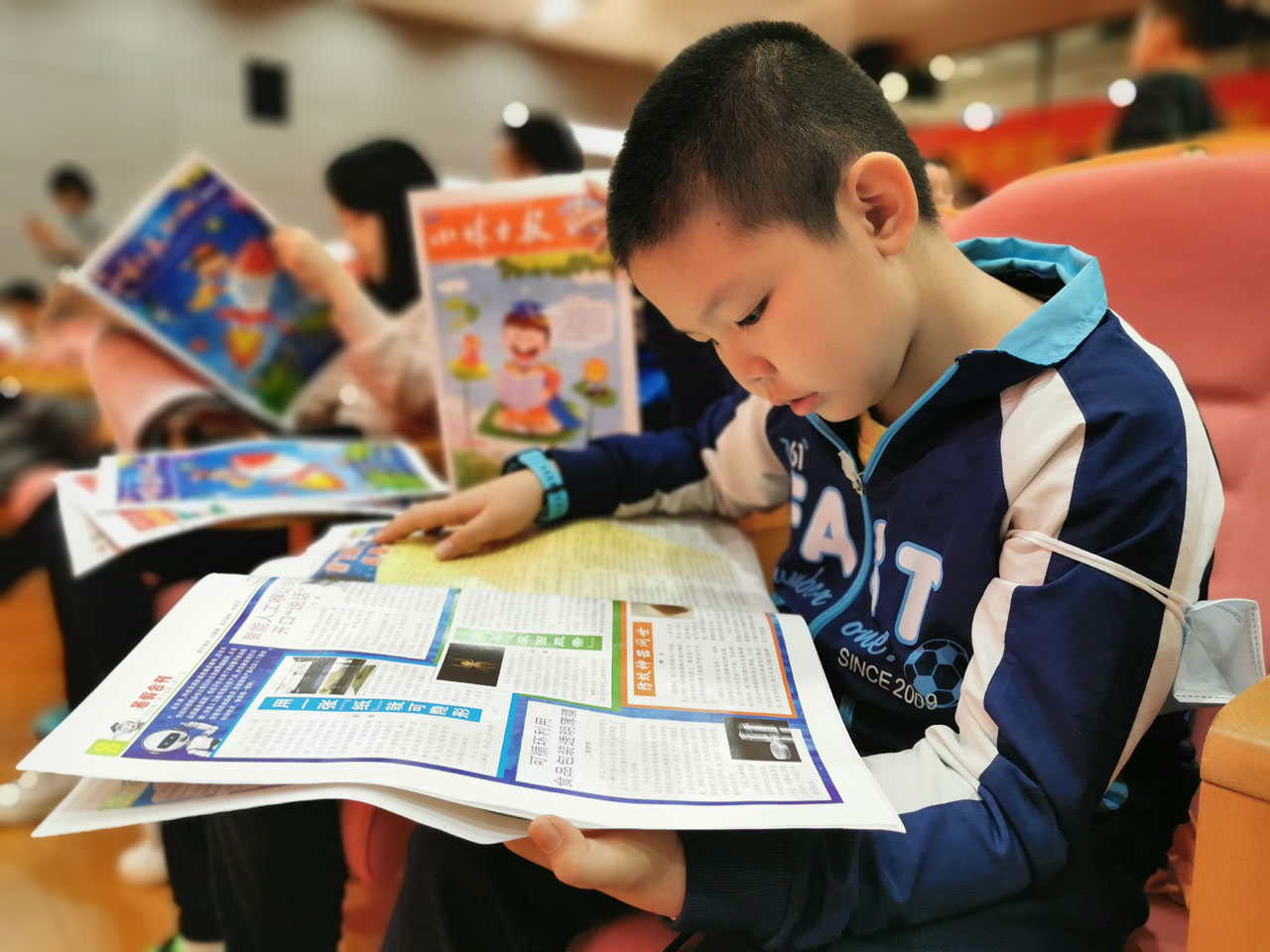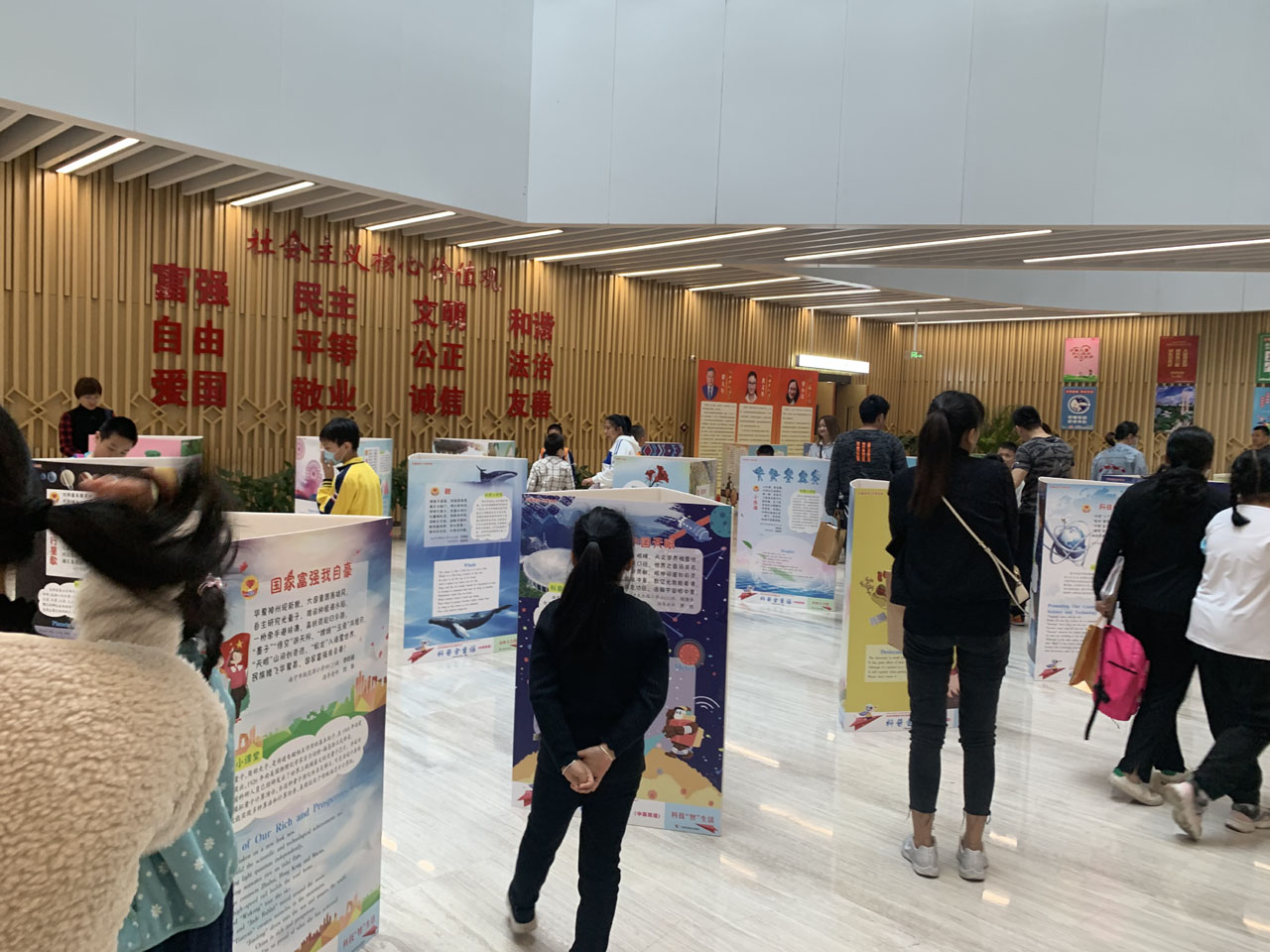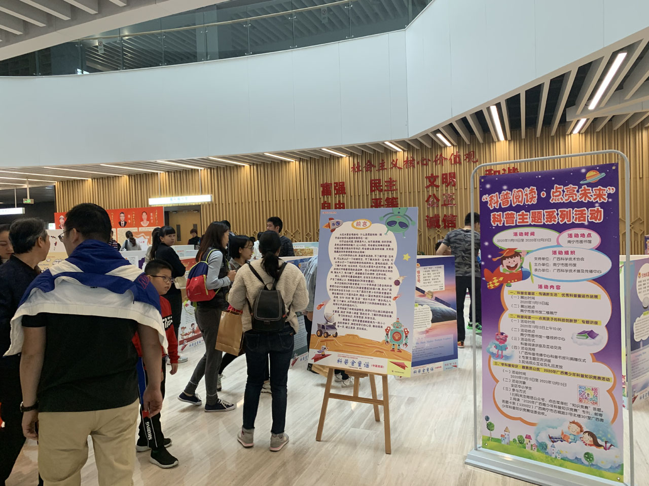 活动结束后,读者们还前往二楼大厅参观了“科普金童谣·传诵新生活”优秀科普童谣作品展,该展为广西区内首展。富有特色的展览布置让读者们赏心悦目,甚至还有读者们说这些展览布置就像一座“城堡”。展览的内容十分吸引人,分为“科技‘智’生活”“奇妙大自然”和“家乡风土人情”三个专题,许多读者都在展览现场驻足观看,久久不愿离去。