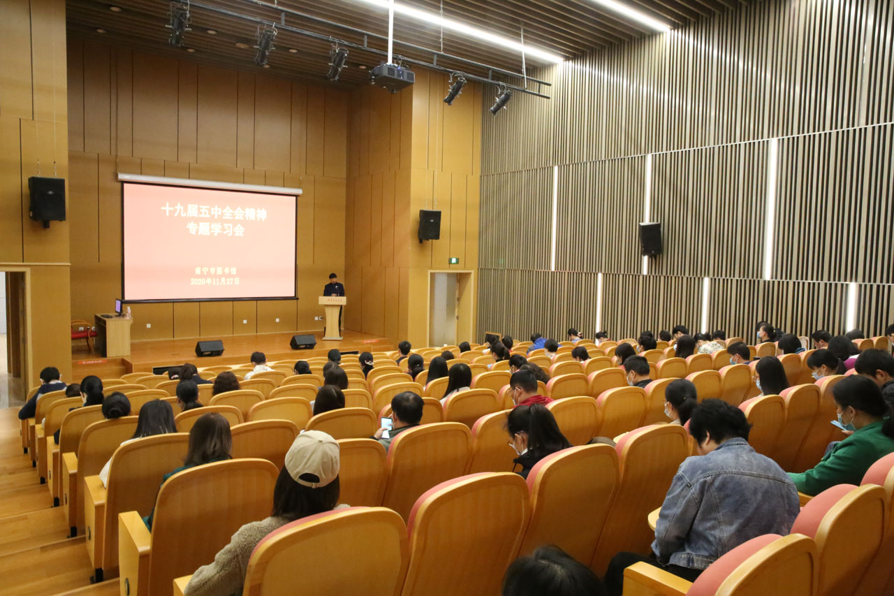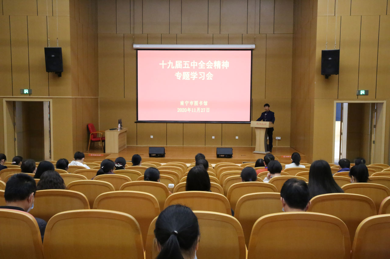 11月27日,南宁市图书馆组织全体干部职工学习党的十九届五中全会精神,本次学习邀请到南宁市社会科学院原副院长钟柳红教授授课,全体干部职工参加了学习。