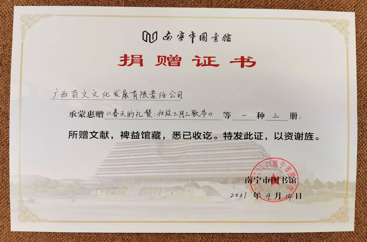 活动结束后,广西百文文化发展有限责任公司向南宁市图书馆捐赠了三册《春天的礼赞:壮族三月三歌节》,希望能有更多的读者在市图通过借阅的方式阅读到壮族文化,壮族特色,提高民族自豪感!