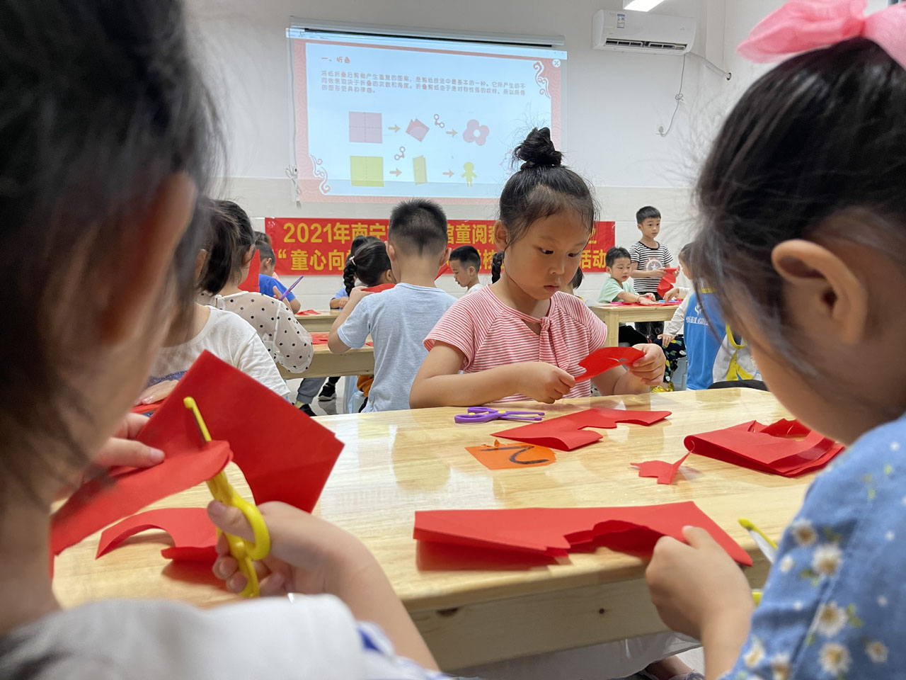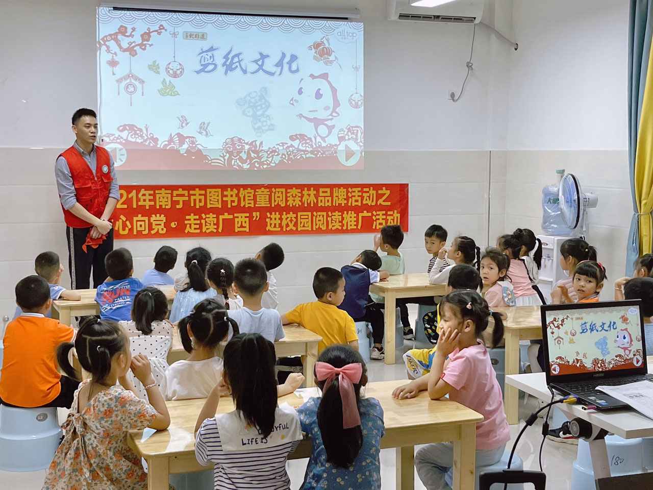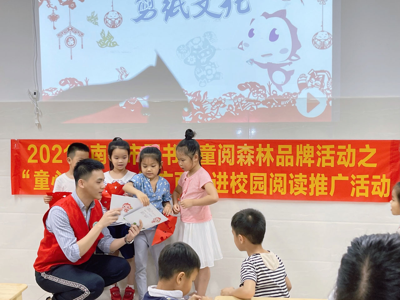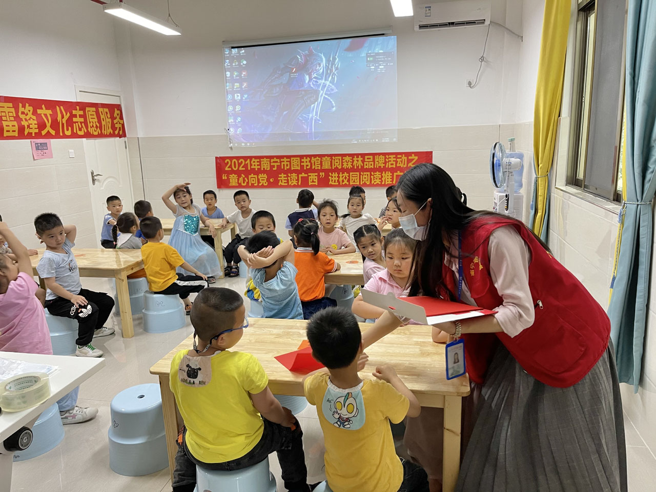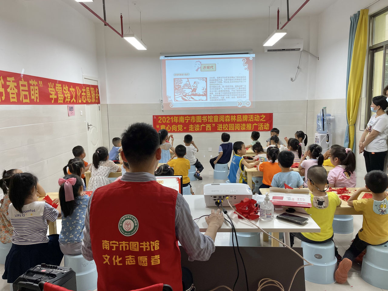 为发挥公共图书馆阅读推广职能,激发未成年人的阅读热情,同时为了传播红色书香,希望可以通过活动激发出孩子对传统技艺的兴趣,传承中华民族优秀传统文化。4.23世界读书日当天,南宁市图书馆少儿部少儿部携手南宁市图书馆文化志愿服务队带着“童阅森林·童心向党——红色书香进校园”4·23世界读书日阅读实践活动走进南宁市良庆区第四实验幼儿园。