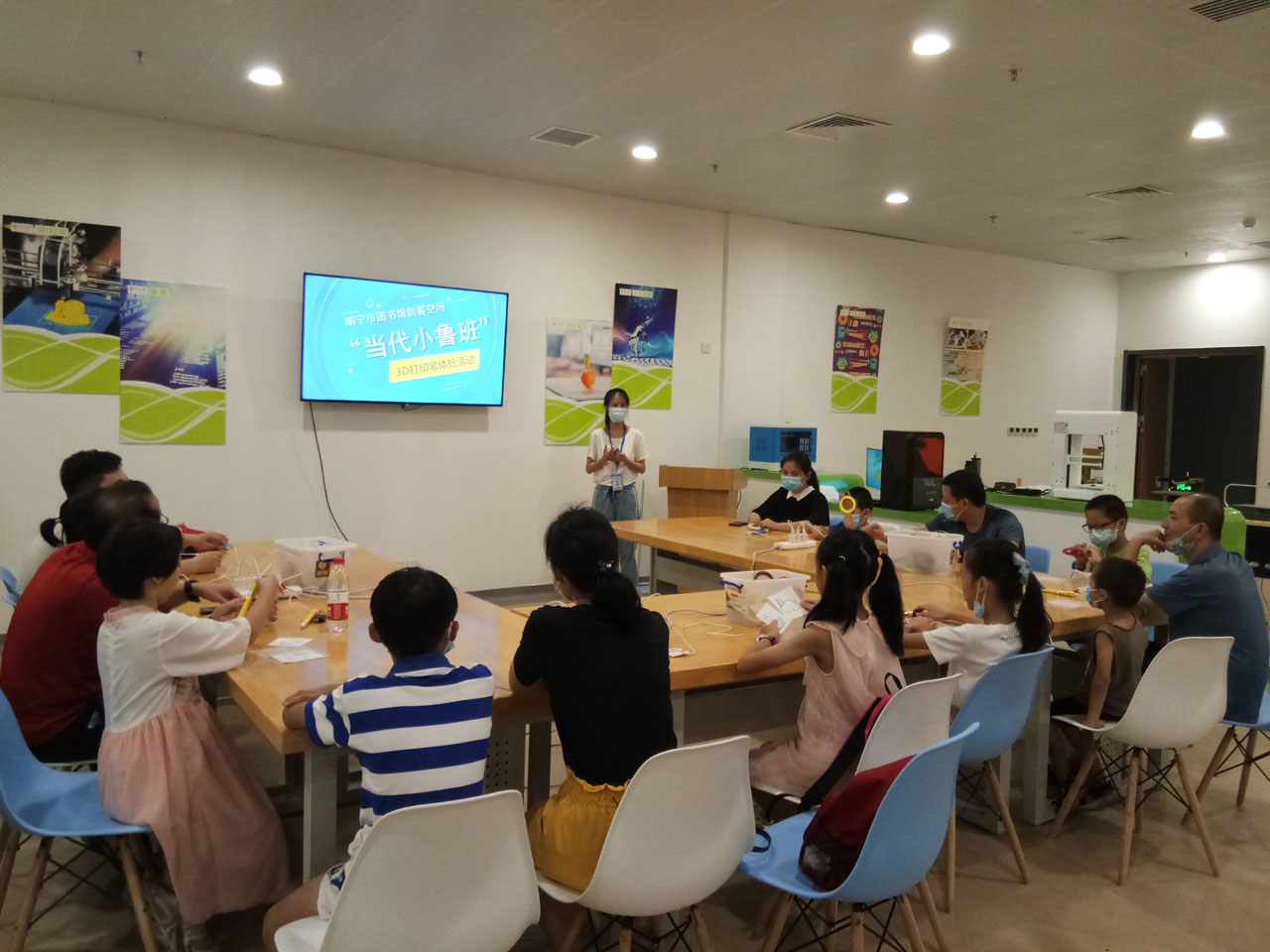 2021年7月25日上午,12组小读者家庭报名参加了在南宁市图书馆一楼创客空间举办的“当代小鲁班”系列之3D打印笔体验活动。该活动旨在培养读者们的艺术创作能力,让读者们在体验式的活动中积累知识、培养兴趣,培养创新思维。