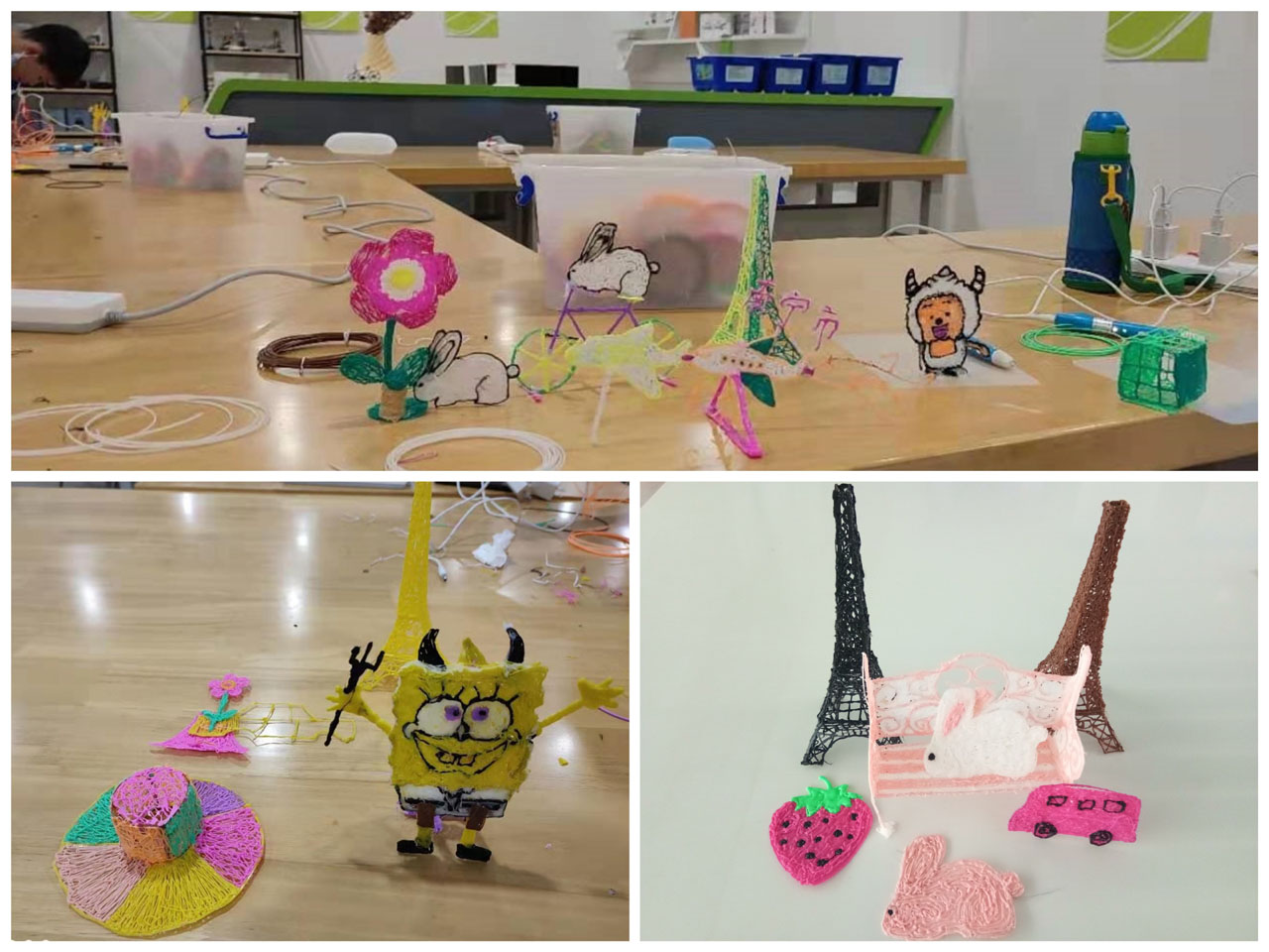 在活动现场,工作人员为读者们介绍3D打印技术,同时讲解了与3D打印相关的小知识、基本操作和注意事项。小读者和家长一起用3D打印笔绘制,把纸上的平面图形变成看得见摸得着的立体模型,展示了丰富的内心世界和无穷的创作能力。在家长的陪伴下,小读者通过自己的创新思维,用3D打印笔创作出一个个精美的作品,有花朵、兔子、铁塔等等。
