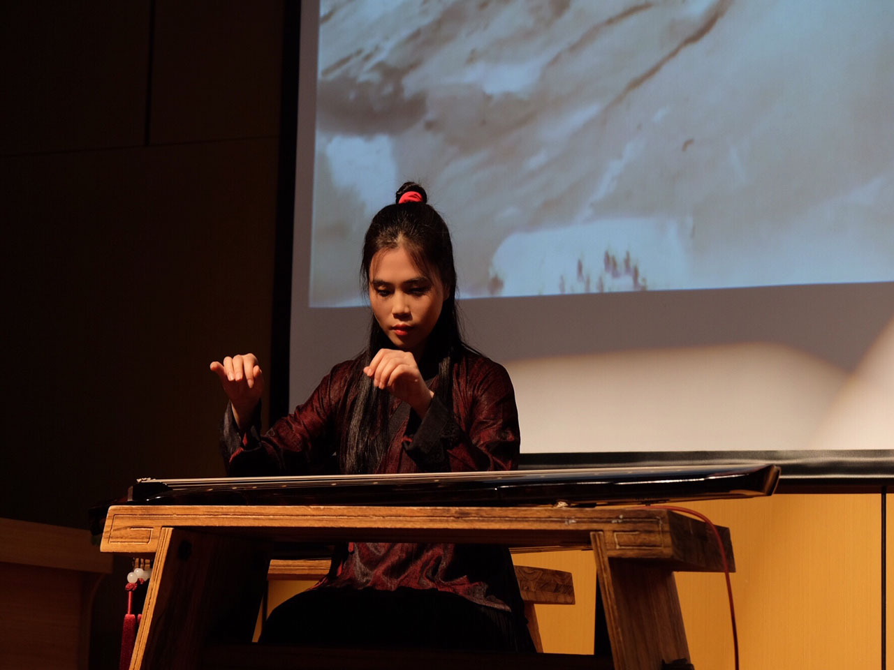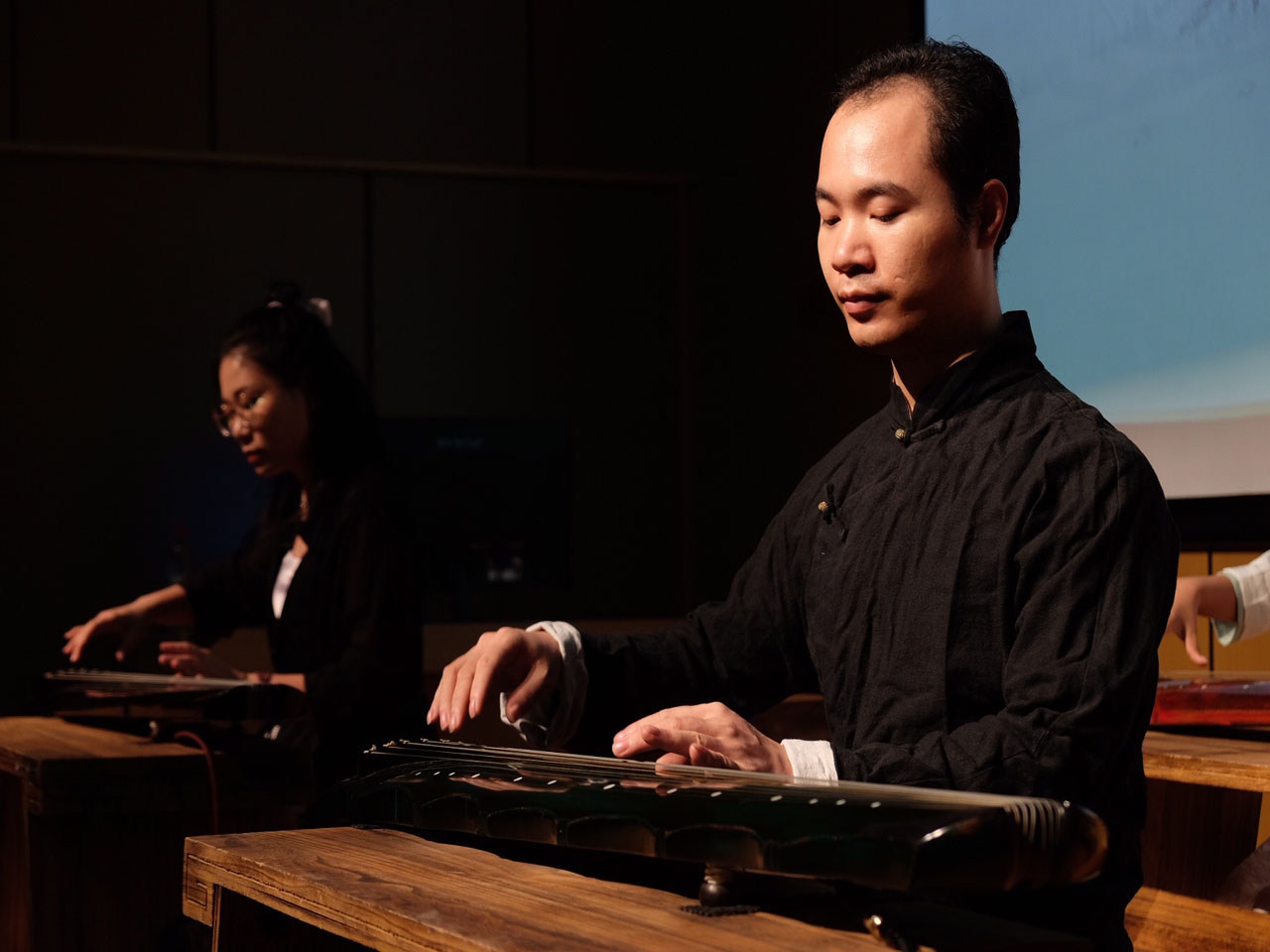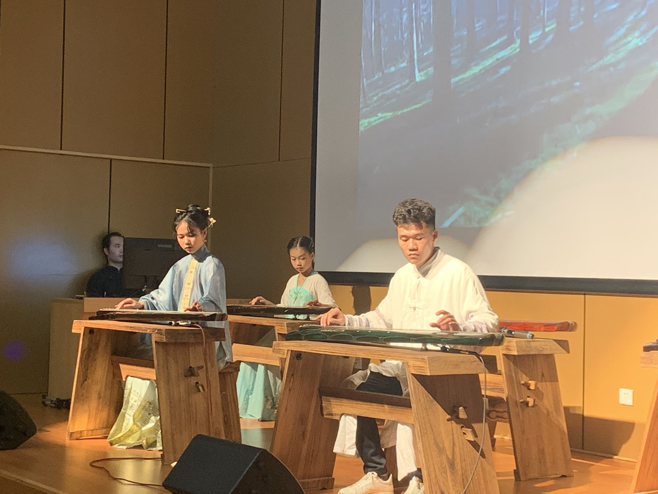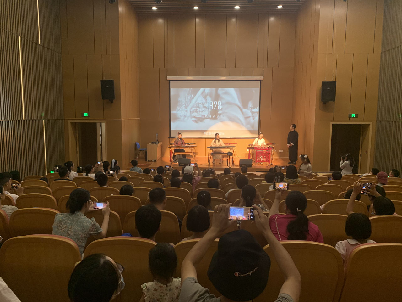 南宁市图书馆邀请易和古琴艺术中心的老师们到场演绎古琴之美,众多古琴爱好者们带着古琴、洞箫、扬琴等乐器轮番上阵,《玉楼春晓》《关山月》《兰陵王》《梅花三弄》《离骚》《渔樵问答》等独奏、齐奏、合奏等多首经典流传的演奏曲目接连不断地为广大市民读者献上了古琴盛宴;其中古琴、洞箫、扬琴合奏的《唱支山歌给党听》《歌唱祖国》节目更是将展演气氛推向高潮,读者们被精彩的演奏打动,大家纷纷举起手机记录下这美好的时刻。