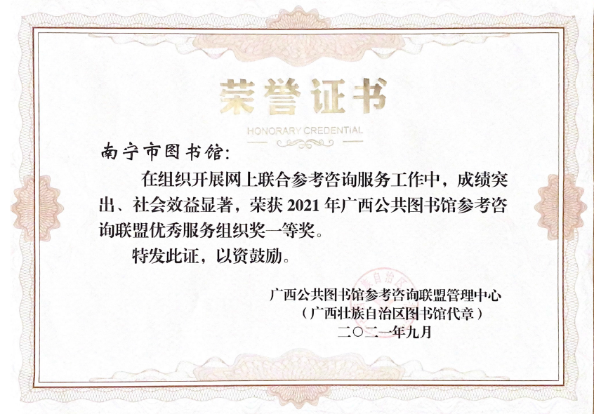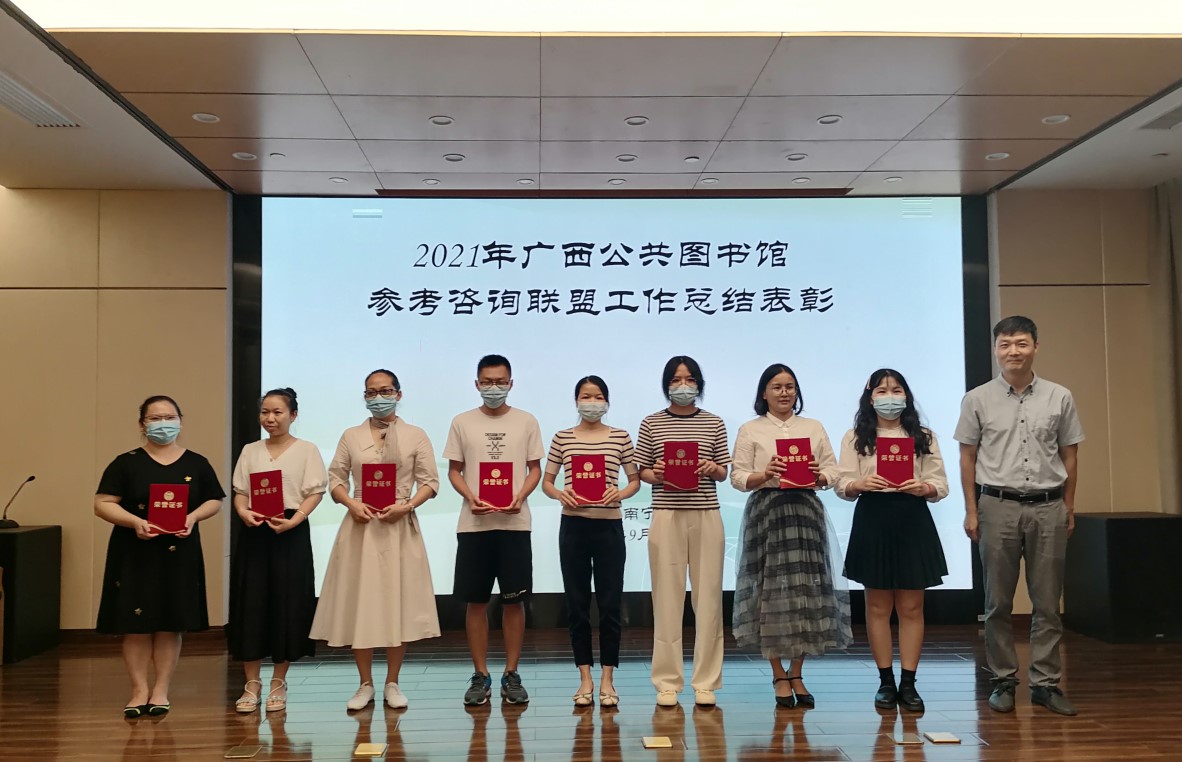 9月10日上午,在广西壮族自治区图书馆举办的2021年广西公共图书馆参考咨询联盟工作总结暨表彰大会上,南宁市图书馆以年度回复参考咨询106701条在全区地市级图书馆中脱颖而出, 荣获广西公共图书馆参考咨询联盟优秀服务组织一等奖。咨询馆员孙焕盈、刘思良、李喜宁、梁悦也因成绩突出,分别荣获个人二等奖、三等奖。