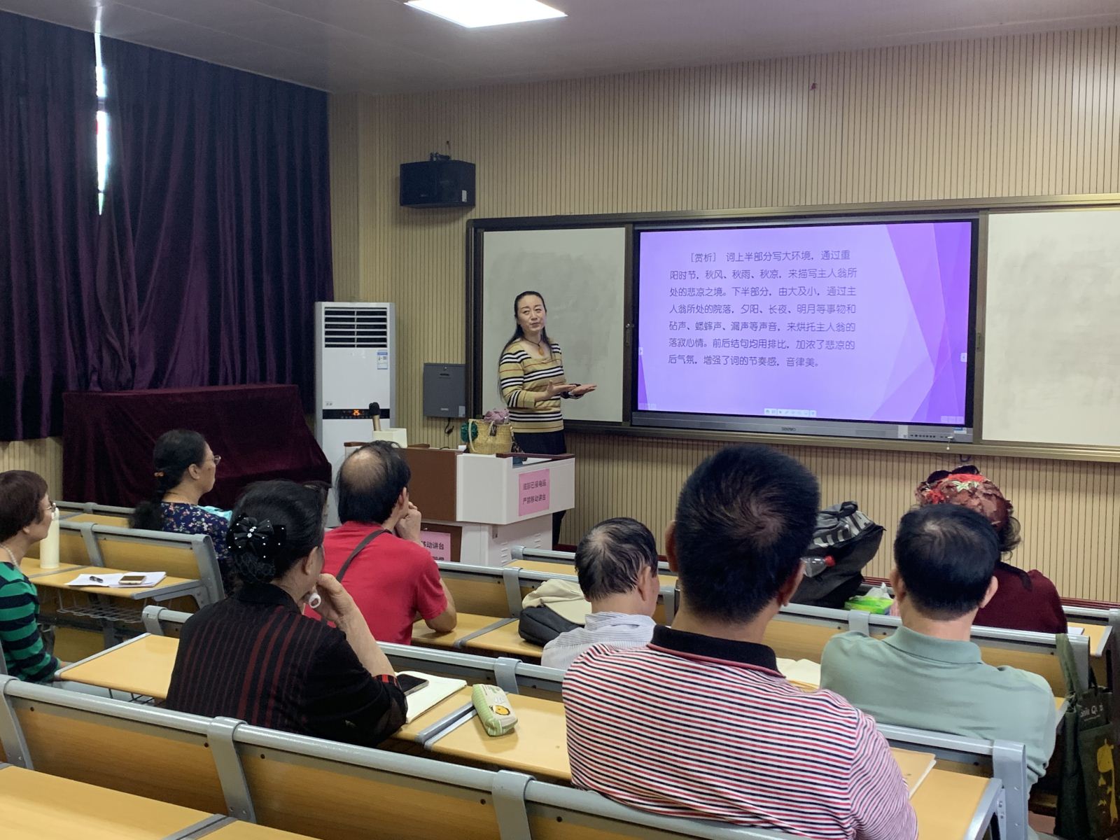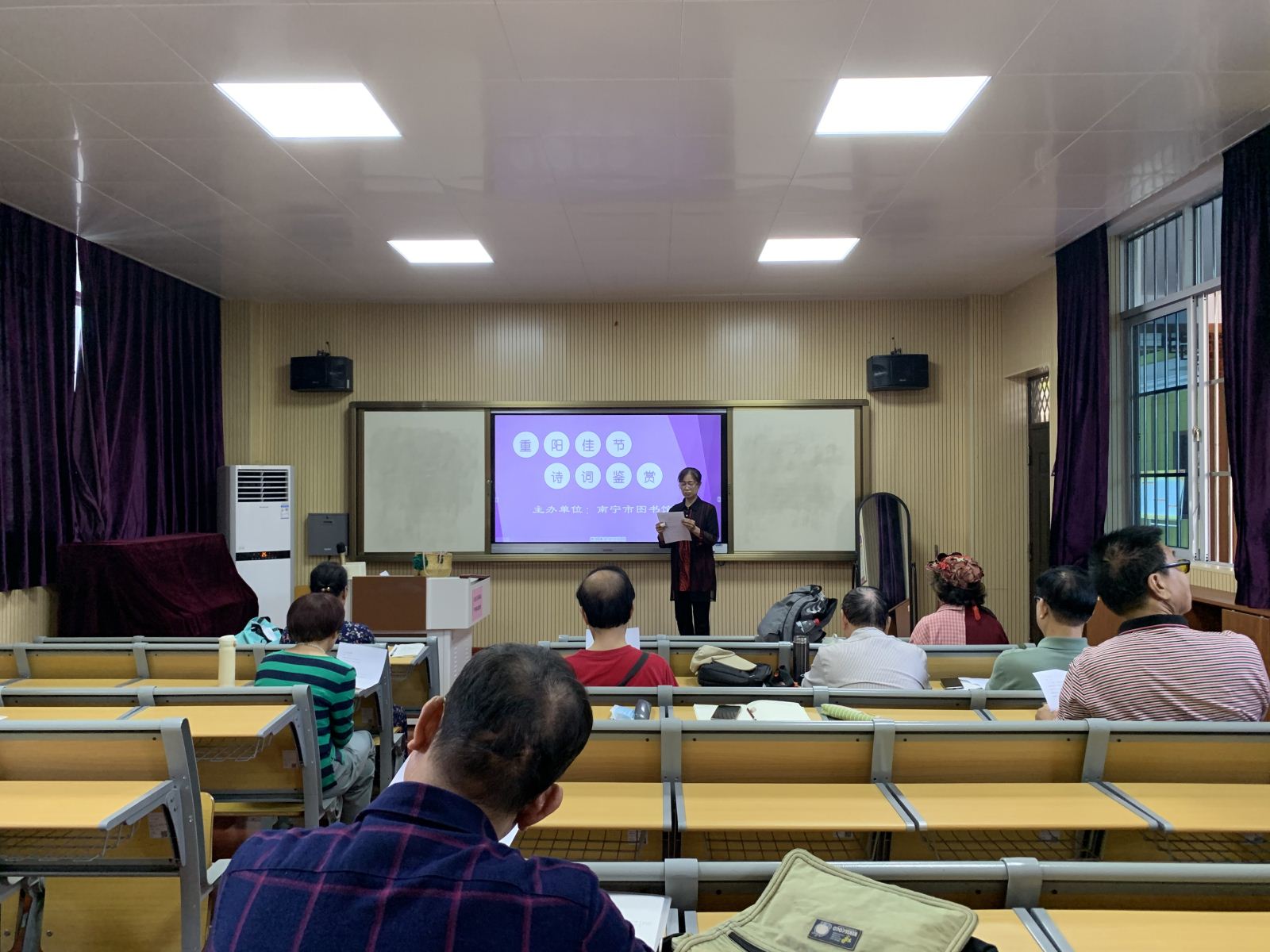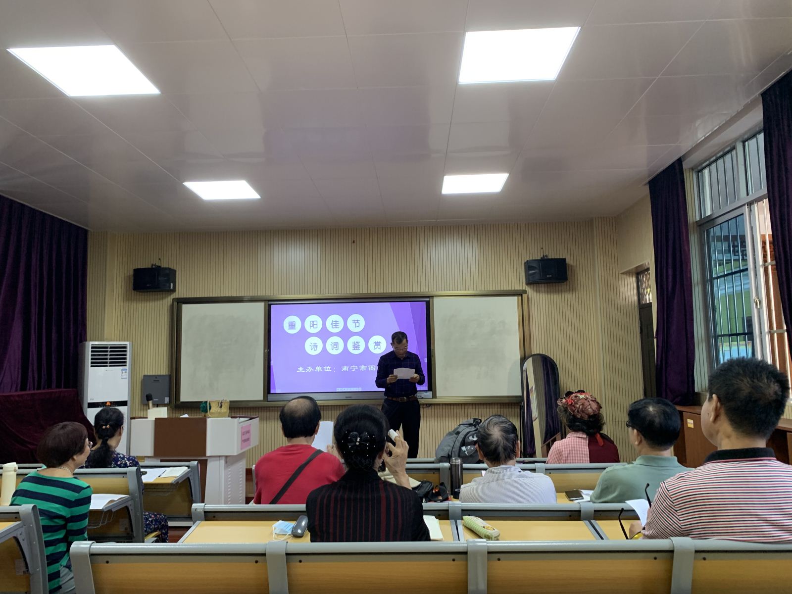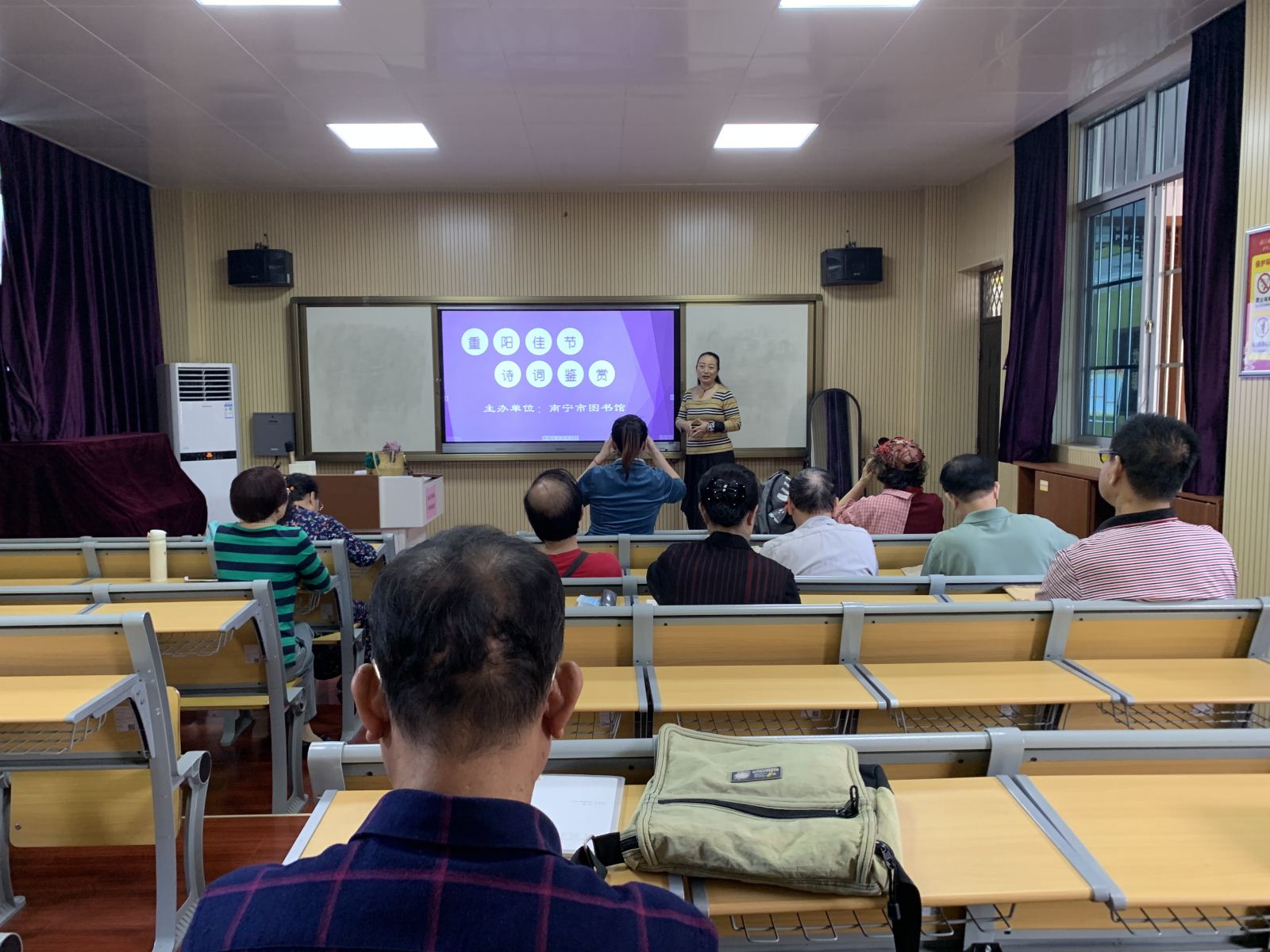 南宁市图书馆首先为老年读者朋友送上“绿城讲坛·重阳诗词鉴赏”讲座环节,读者活动部黄珂老师引导大家共同回顾了重阳节作为中国传统文化节日的来历及历史演变发展过程,并介绍了重阳节各地的传统习俗,如晒秋、放纸鸢、登高、吃重阳糕、祭祖、赏菊、佩茱萸等等,讲述人们是如何度过重阳节,并把重阳节当敬老节的历程。随后,黄珂老师又与老年读者朋友一起诵读了不同朝代有名的十首重阳节诗词如王维的《九月九日忆山东兄弟》、杜牧的《九日齐山登高》、李清照的《醉花阴·薄雾浓云愁永昼》等等,她对每一首诗词都进行了深入浅出的赏析,让大家领略到这些诗词的意境之美、精练的文字之美以及感受诗词作者所要表达的情感等等。在场的老年读者朋友对这些诗词都很感兴趣,忍不住纷纷上台吟诵起这些重阳主题诗词,加深了对古诗词文化的学习兴趣。