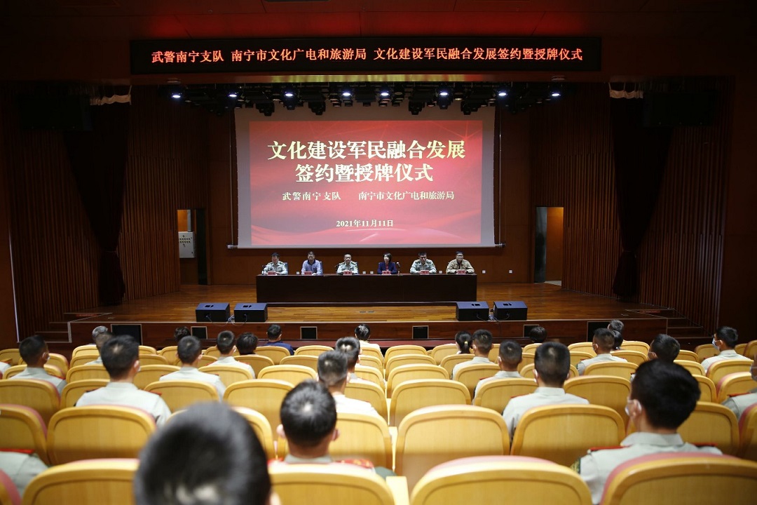 11月11日,南宁市文化广电和旅游局与武警南宁支队文化建设军民融合发展签约仪式在南宁市图书馆举行,武警南宁支队政委徐勇、副政委刘烜、政治工作部主任胡少林、副主任罗瑞炎,南宁市文化广电和旅游局局长韦娜、副局长、党组成员俞军荣,南宁市群众艺术馆、南宁市图书馆、南宁市民族文化艺术研究院、南宁市博物馆等相关负责同志和武警南宁支队90余名官兵出席签约仪式。