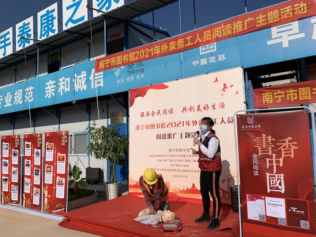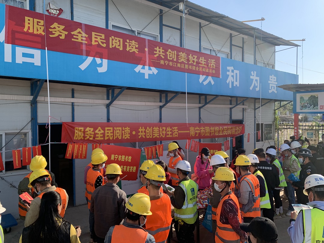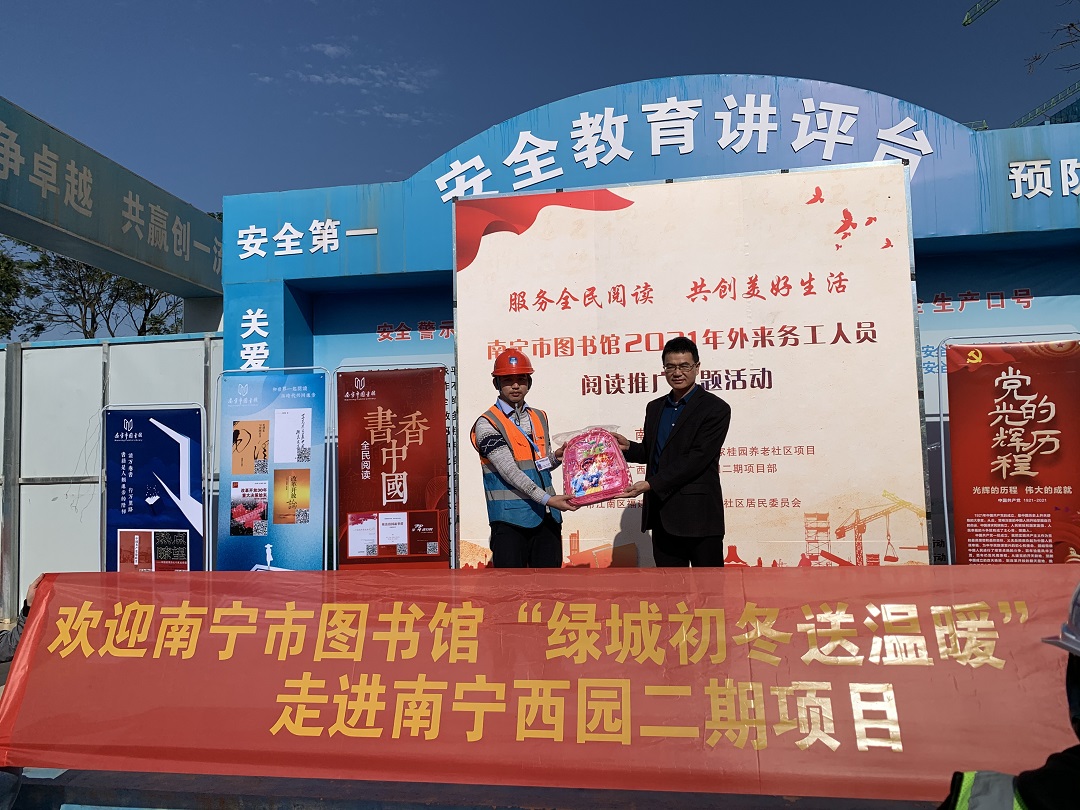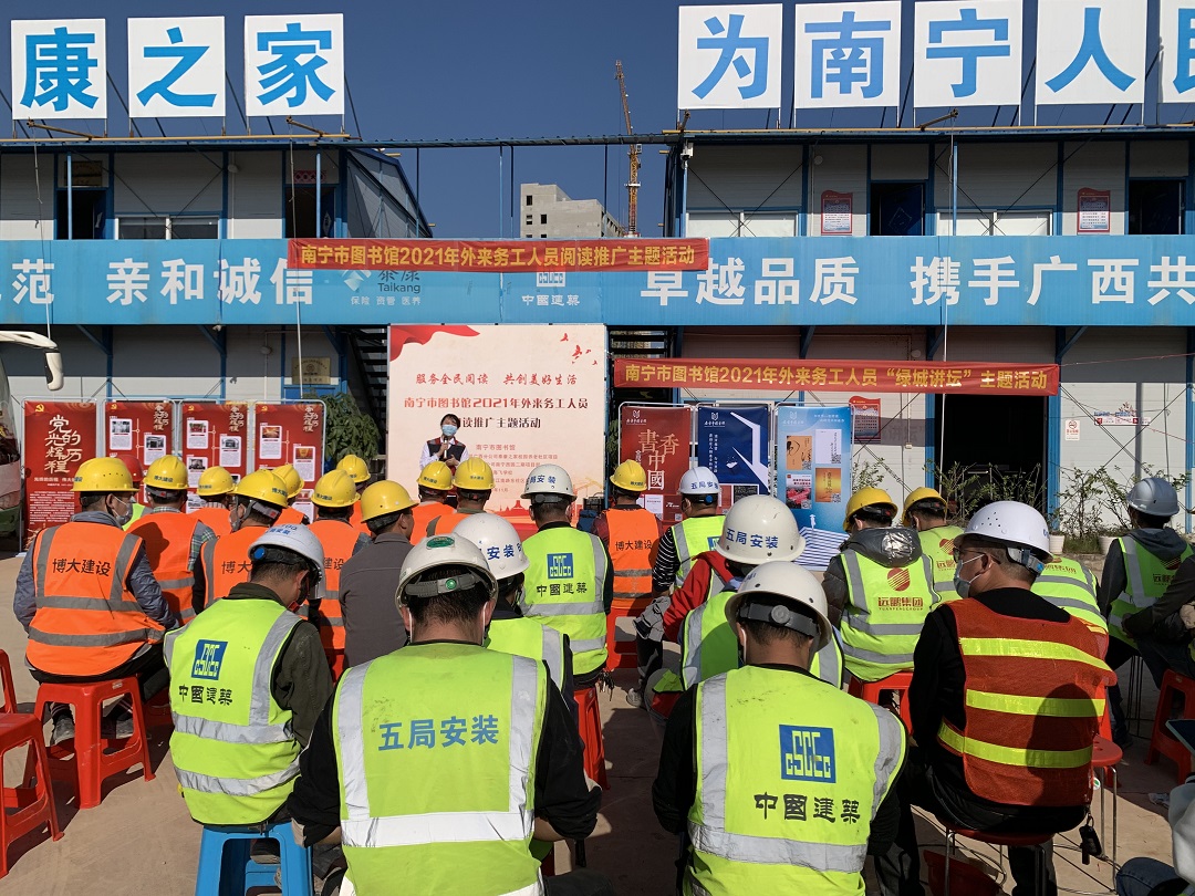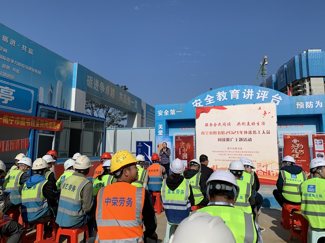 为充分发挥公共图书馆在阅读推广工作中的重要阵地作用,完善公共文化服务体系建设,深入实施文化惠民工程,丰富外来务工人员的精神文化生活,推动首府群众文化建设,在南宁市文化和广电旅游局的指导和支持下,南宁市图书馆以“服务全民阅读·共创美好生活”为主题,以推进全民阅读为重要任务,于2021年11月18日、23日、25日先后走进南宁市海飞学校、中建五局华南公司泰康之家桂园项目和中建七局广西分公司南宁西园二期项目部,开展2021年外来务工人员阅读推广主题活动,旨在大力弘扬中华优秀传统文化和社会主义先进文化,培育社会主义核心价值观。