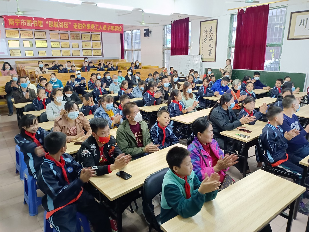 在这次活动中,“绿城讲坛”进学校、进工地分别邀请到广西壮族自治区图书馆办公室主任兼广西图书馆学会秘书长贾莹,在外来务工子弟学校——南宁市海飞学校主讲。