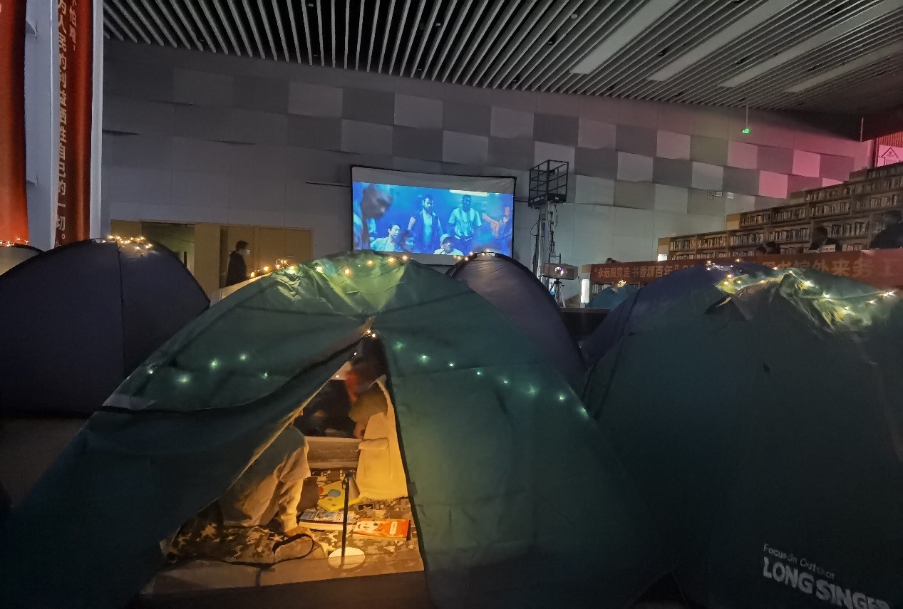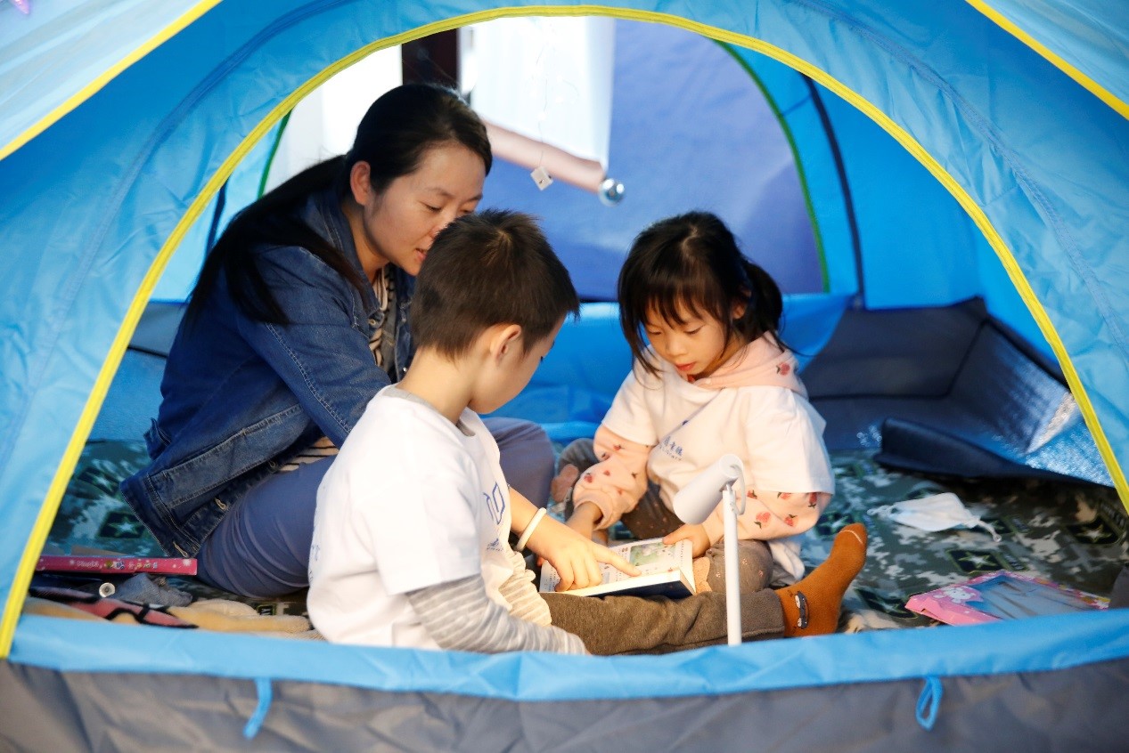 傍晚时分,30组家庭亲子协作,在城市客厅将帐篷搭建起来,一同体验了团结协作的乐趣,一切安顿好之后,奇妙的晚间活动拉开帷幕。“星空剧场”活动,在星空夜幕下、星光帐篷里,家长和孩子们一起“穿越”到2075年,体验“流浪地球”,学会勇于承担责任。在“书香启萌 阅读分享”活动中,家长们、孩子们奔赴在小小的帐篷里,彼此交换自己喜欢的图书,并在帐篷里借着灯光,有滋有味的享受着亲子阅读的乐趣。在一片温馨祥和的阅读氛围中,活动渐渐接近尾声,孩子们纷纷在图书馆专属明信片上写下心里话,向父母诉说感恩,向老师表达感谢……夜色渐浓,一天的活动也伴着书香落下帷幕。