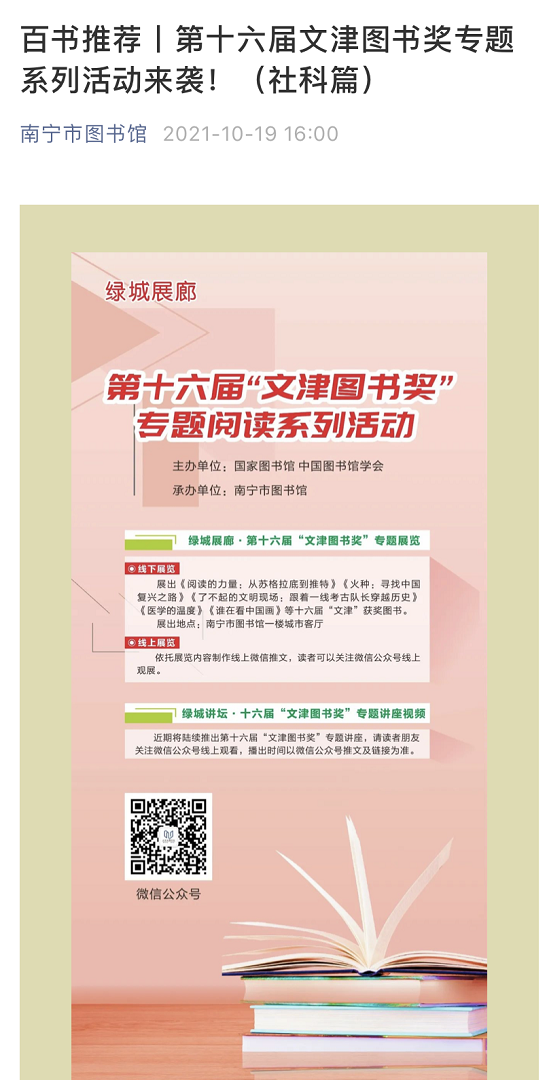 为深入贯彻落实习近平总书记给国图老专家回信精神,坚持正确政治方向,弘扬优秀传统文化,推动全民阅读,将优质展览资源和讲座资源惠及全国图书馆和广大读者,更好满足人民精神文化需求,在国家图书馆和中国图书馆学会的支持下,南宁市图书馆在2021年10月到12月期间举办了第十六届“文津图书奖”专题阅读系列活动。