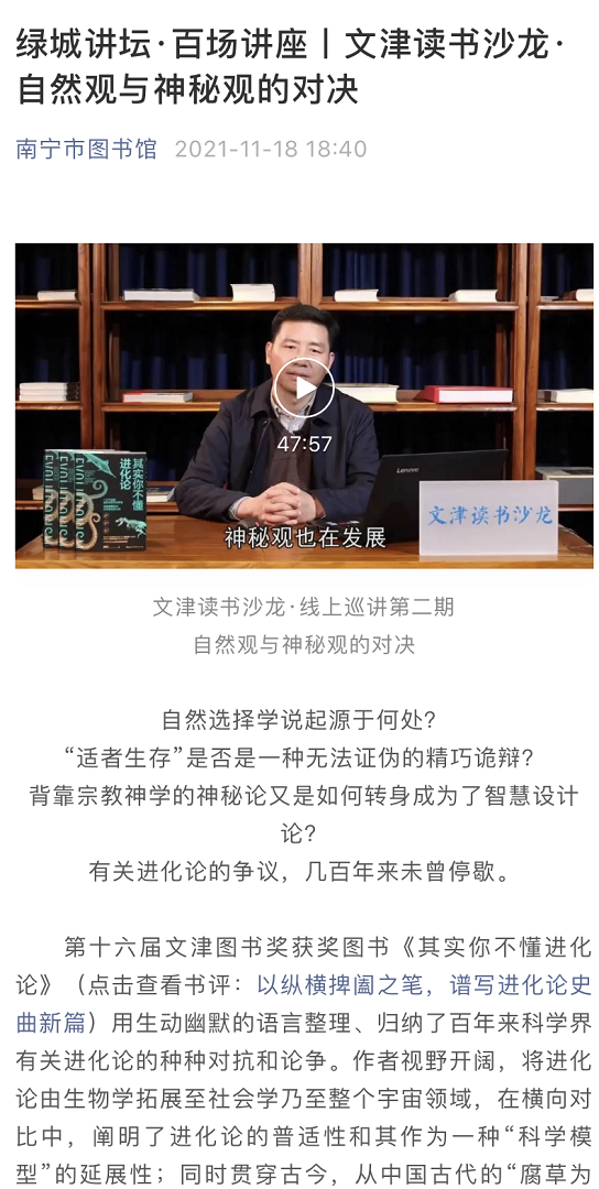 “绿城讲坛·十六届文津图书奖”专题线上视频讲座邀请书籍作者亲自解读书中奥秘,更是在人与书之间搭建桥梁,带领读者穿越历史、探索自然、关注人文,在阅读中获取智慧与力量。如《了不起的文明现场:跟着一线考古队长穿越历史》作者之一刘斌老师带领读者探幽良渚古城,认识考古学还原真实之道;《汉字就是这么来的·走进汉字世界》的作者、北京师范大学文学院副教授孟琢老师担任主讲人围绕经典著作《说文解字》,从“因形求义”“古代经典”和“文学词章”三个部分解读汉字里的文化内涵,让读者更深入地了解古老汉字提供启发。