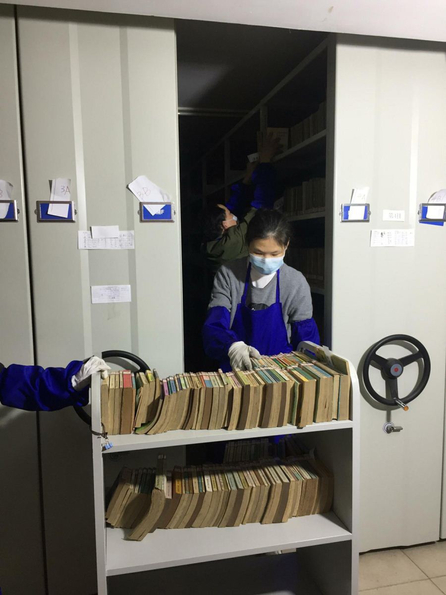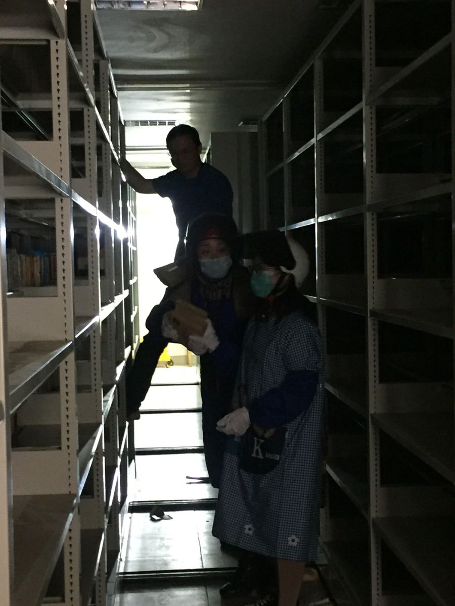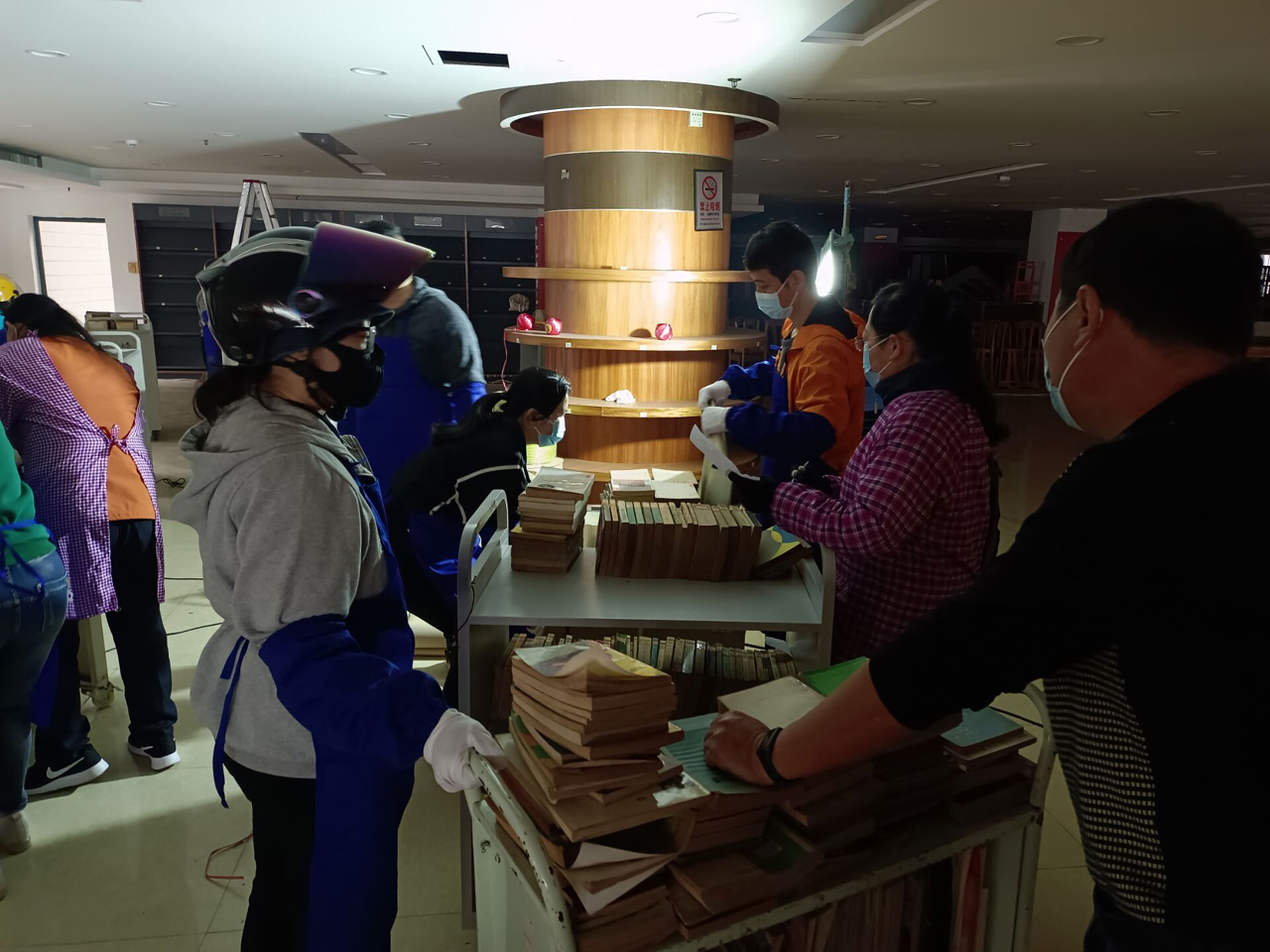 星光旧馆目前处于装修改造中,现场环境恶劣,尘土满天飞,拆到一半的天花板摇摇欲坠,由于之前的电路几乎全部切断,密集库内一片黑暗,书架紧密排列,仅剩狭窄的过道可供通行,没有足够的空间容纳人员与打包机器,所以密集库图书撤下书架后,只能转移到一旁场地较为开阔的市民阅读中心进行打包,等候运至玉洞大道新馆存放。