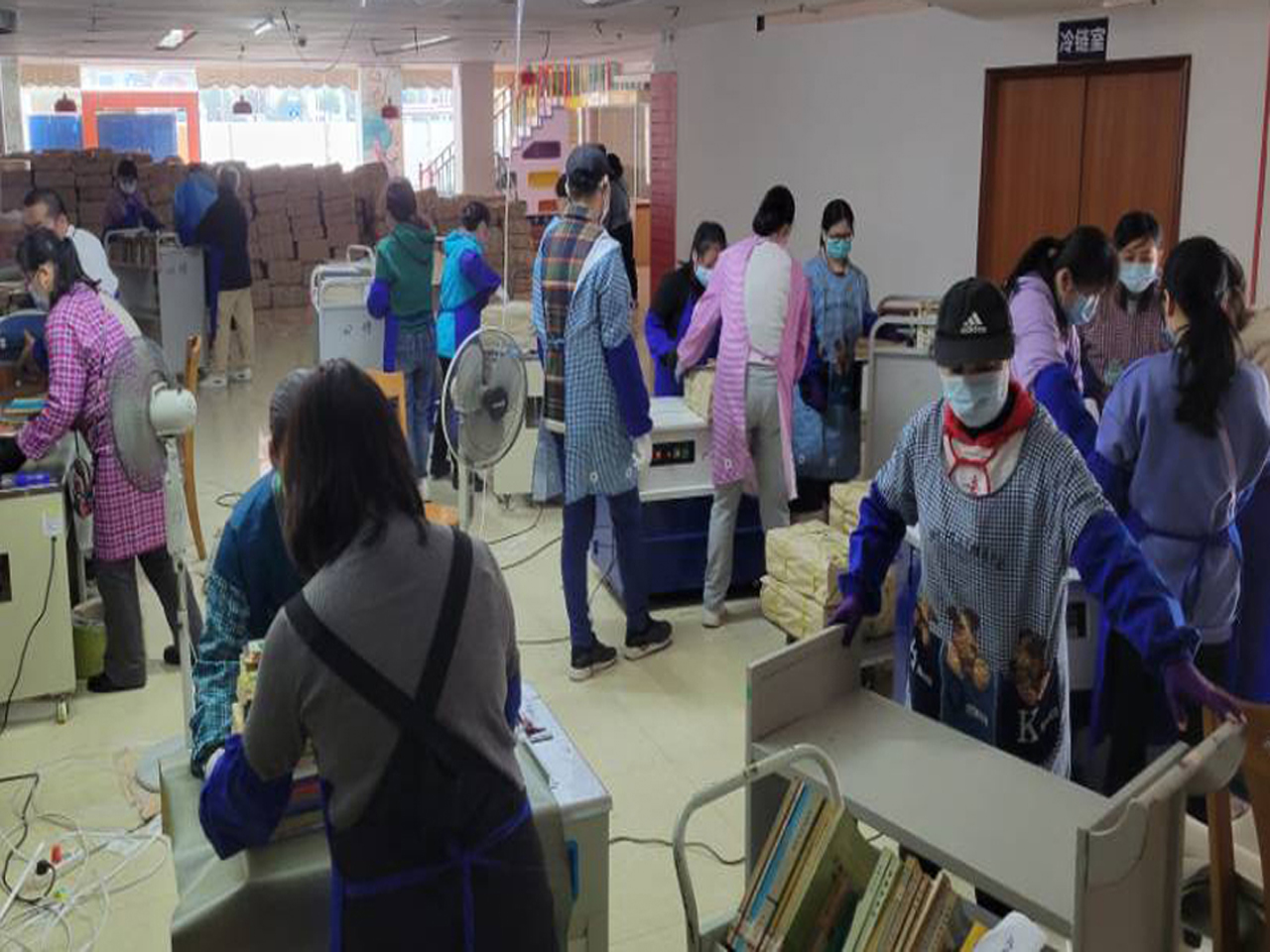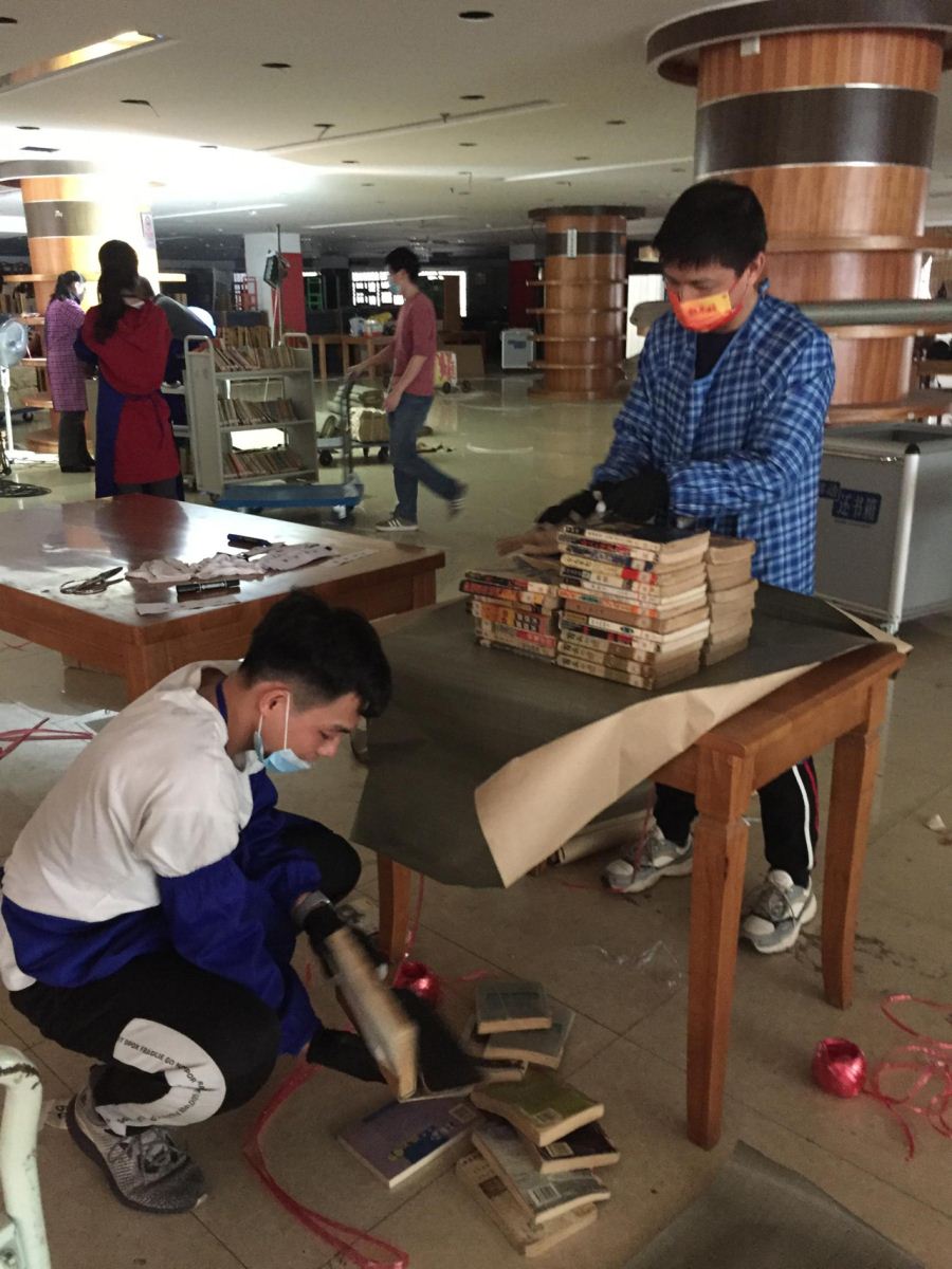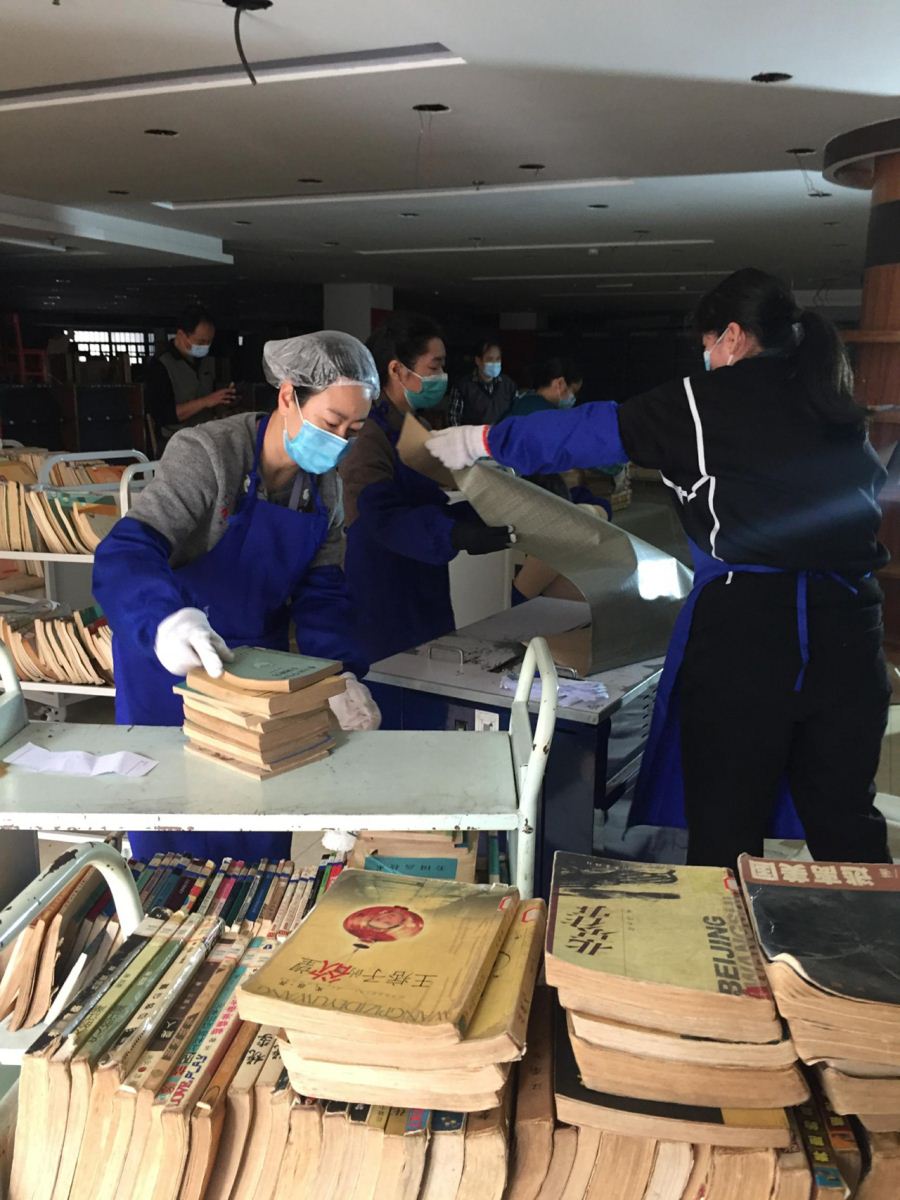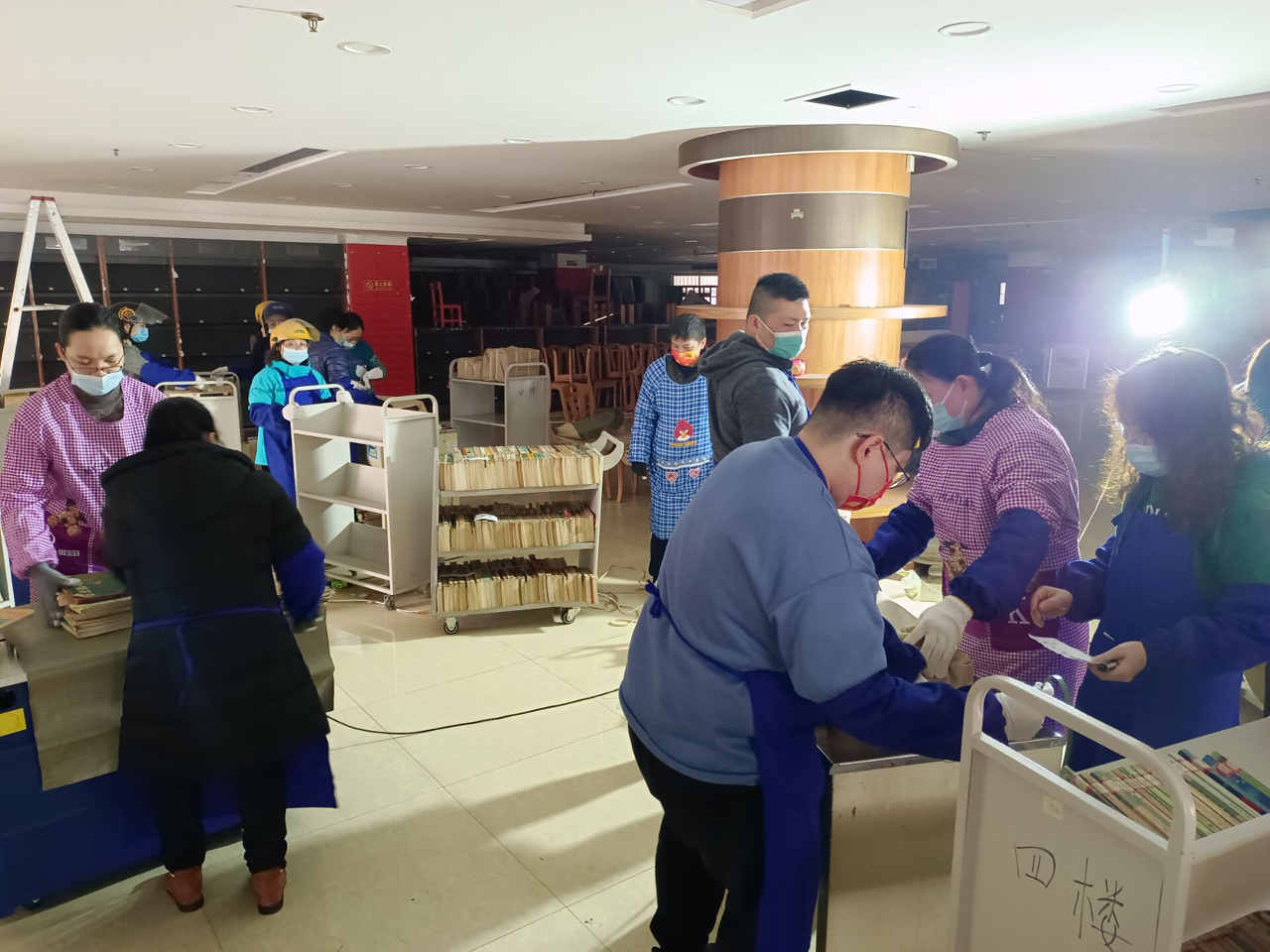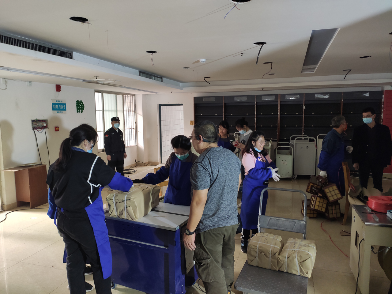 现场装修施工声、打包机工作声、书车滚轮声混杂。在一片嘈杂声中,全体人员紧凑而有序地工作着。大家铆足了劲儿、打起十二分精神与时间竞速,争取按期、按质、按量完成此次大规模图书搬运任务。