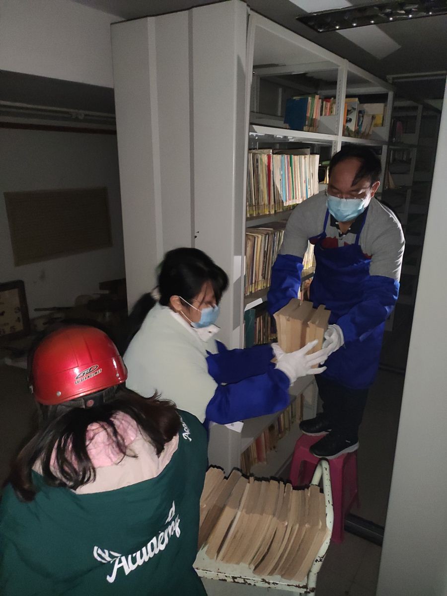 物业部工作人员抵达旧馆后,立即接通临时照明灯;办公室人员分配书车,发放手套、围裙、安全帽等物品;清理地上的尘土碎砖,拉起警戒带,迅速清出一条运输通道。“图书搬运队”分为下架、运输、打包共3组,下架组负责从书架上依次取下图书并标架位号,运输组将图书按序转移至市民阅读中心,交由打包组在该处进行打包并标号。由于书车无法进入密集库的书架之间,下架时只能通过人工接龙把书递出,放到车上;打包设备不够用,工作人员只能又再调配了一台打包机,并且当场组建了手工打包组加快打包进度,运输组成员戴着安全帽,推着书车在施工现场旁穿行,并将打包好的图书拉到一旁的空地集中堆放。
