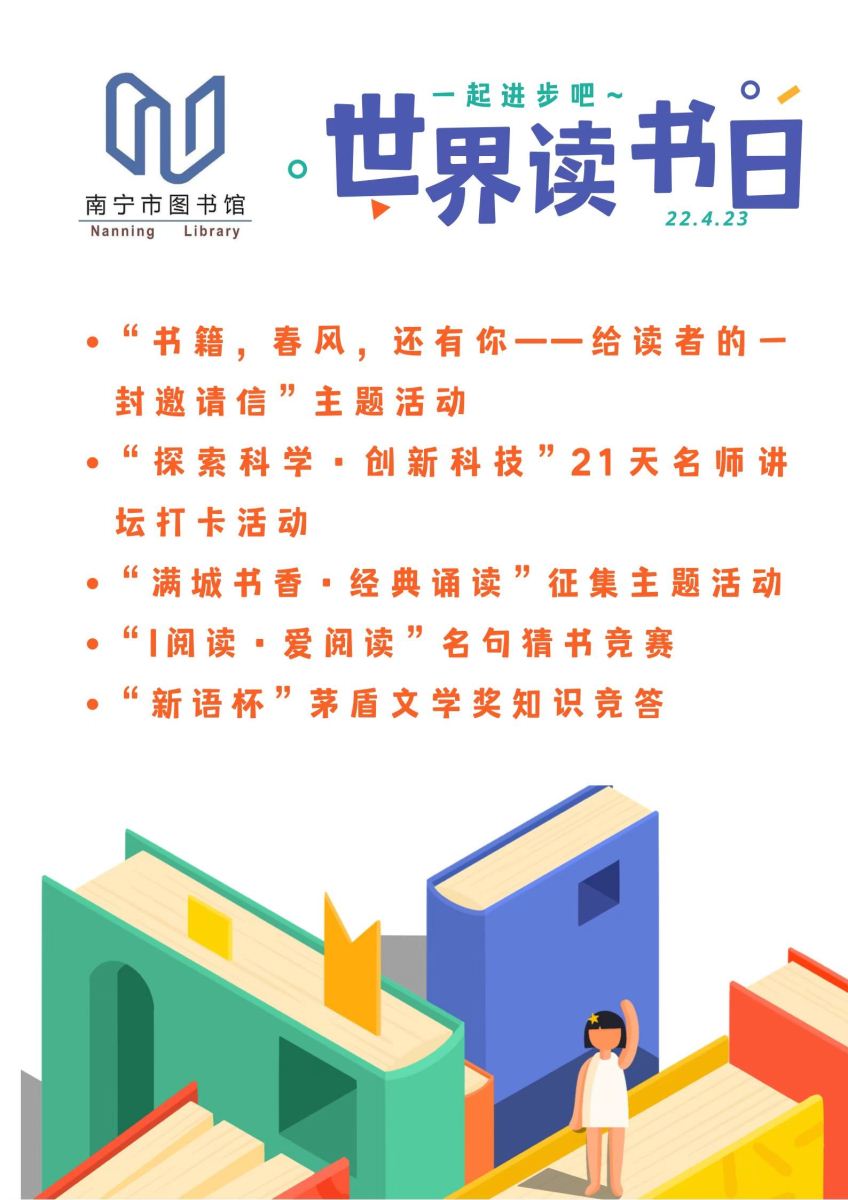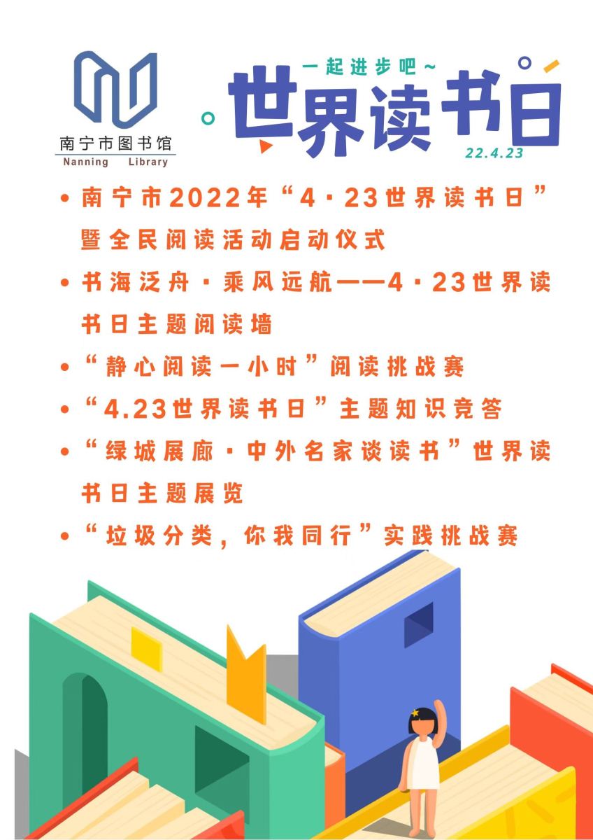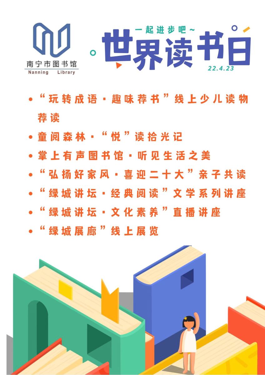 2022年4月23日是第27个“世界读书日”,南宁市图书馆作为开展全民阅读工作的重要阵地,积极联合社会力量,以“奋战新征程 绿城品书香”为主题,结合党史学习教育,全力迎接、学习、宣传党的二十大,重点推进习近平新时代中国特色社会主义思想读物在广大读者群众中的宣传普及,从4月18日起陆续为读者送上线上线下形式内容丰富多彩的“阅读”大礼包。
