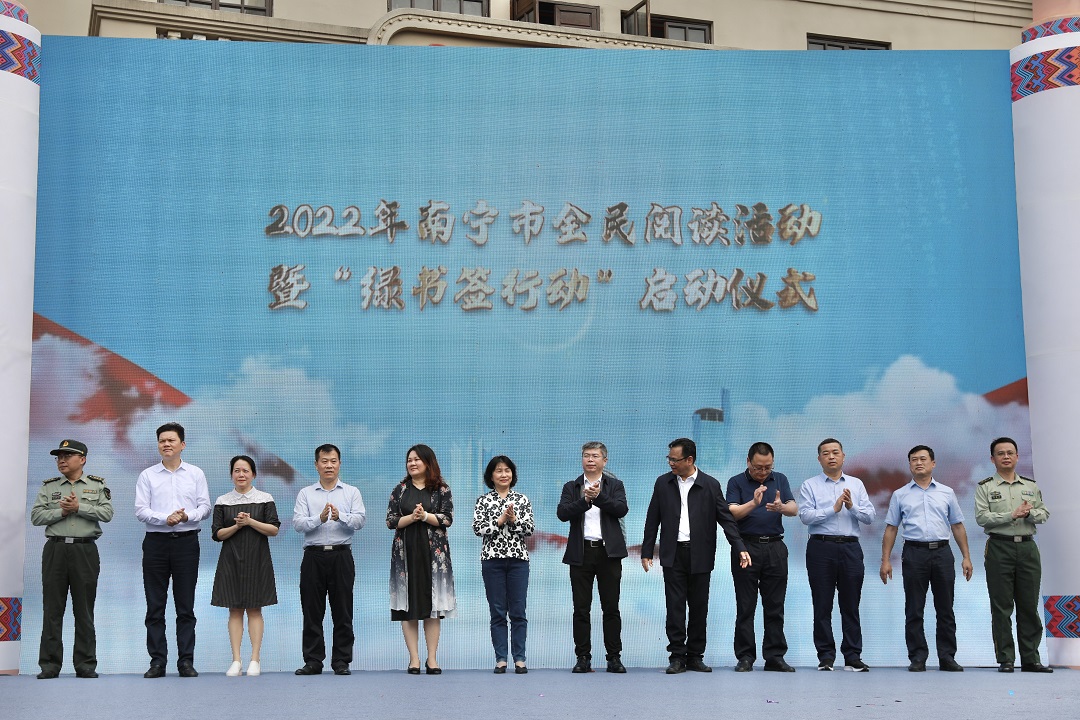 启动仪式上,领导嘉宾共同按下手印,正式启动南宁市2022年全民阅读活动暨“绿书签行动”。随后,会场内外共同唱响歌曲《领航》,嘹亮的歌声汇聚成对党和祖国最美好的祝福。仪式结束后,领导嘉宾向市民群众赠送《习近平新时代中国特色社会主义思想大家学》口袋书。活动现场还举办“漂流书香·阅读共享”图书漂流活动、“绿城讲坛”喜迎二十大主题讲座和“绿城展廊”世界读书日·中外名家谈读书展览等活动。