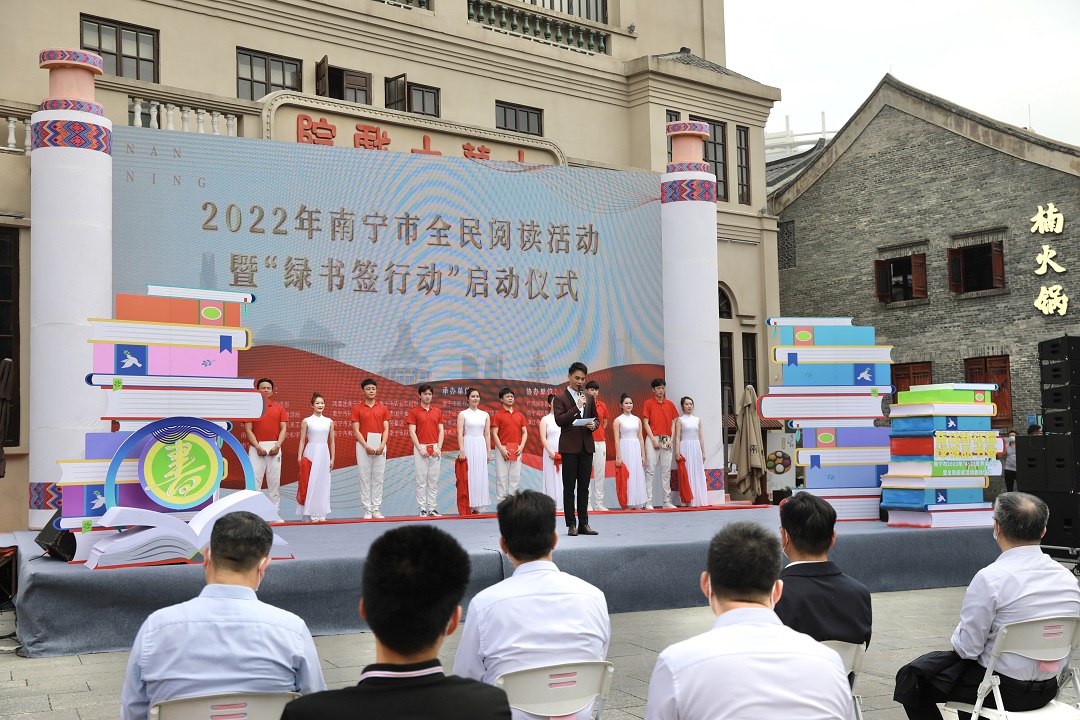 2022年4月23日是第27个“世界读书日”。当天上午,由中共南宁市委宣传部、市文化广电和旅游局等单位主办,市图书馆,兴宁区、江南区、青秀区文化广电体育和旅游局承办的2022年南宁市全民阅读活动暨“绿书签行动”启动仪式在兴宁区三街两巷历史文化街区拉开帷幕。活动围绕“奋战新征程 绿城品书香”主题,创新性引入情景式阅读体验、实景表演和经典诵读相结合的方式,大力推动习近平新时代中国特色社会主义思想读物在市民群众中的宣传普及,为迎接党的二十大召开营造浓厚氛围。