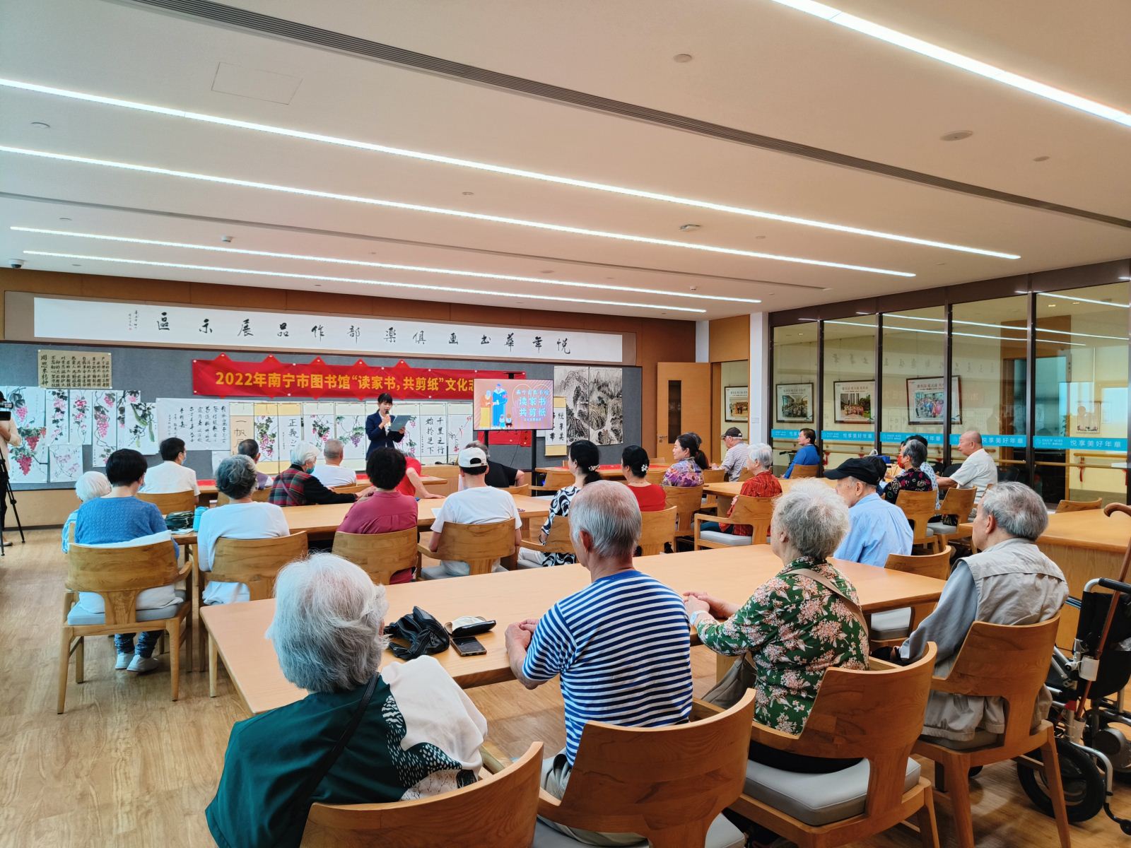 活动一开始,南宁市图书馆的阅读推广人熊堃玲为大家诵读了《习近平给父亲的一封生日贺信》。这封信既充满了对父亲生日的祝福,也有不能亲临父亲身旁的遗憾,但更多的是对父亲人格与品德,胸怀与作风,信仰与追求的崇敬之情,表达了将父亲的好作风、好家风世代相传,投身于共产主义事业,投身于人民的坚定决心。熊堃玲老师饱含深情的诵读让大家感受到了“天下之本在国,国之本在家”,而家风则正是一个家庭或家族在长期共同生活中形成的较为稳定且世代承袭的价值观共识,优良的家风如春风化雨,潜移默化地影响着家庭成员正确的价值追求和良好的精神面貌。随后,广西工艺美术大师、南宁剪纸非物质文化遗产代表性传承人钟昀睿老师带领现场的老年朋友们以“喜迎二十大”为主题共同体验非遗剪纸艺术。大家发挥奇思妙想,通过一幅幅生动的剪纸作品向祖国表达了祝福,传递着晚年美好生活的感悟。活动最后,现场老年朋友通过交流剪纸体验心得,畅聊中国优秀传统文化之美。