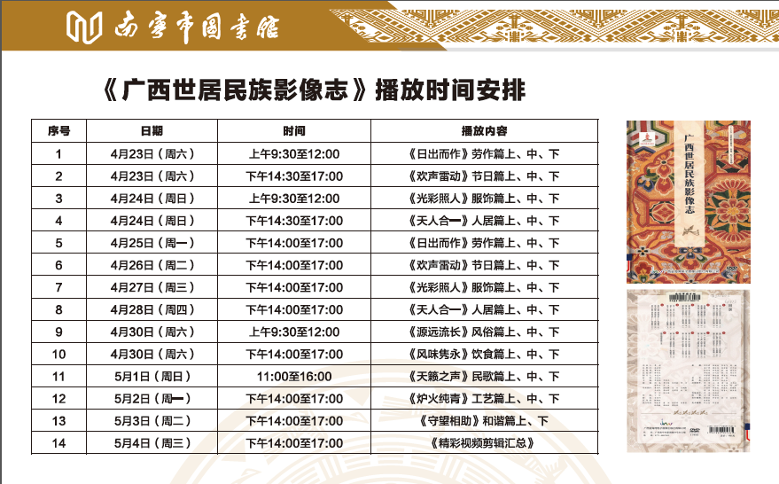 在第27个“世界读书日”期间,南宁市图书馆在三楼音乐图书馆播出纪录片《广西世居民族影像志》,自展播以来颇受读者喜爱,仅在读书日当天两个场次都座无虚席。