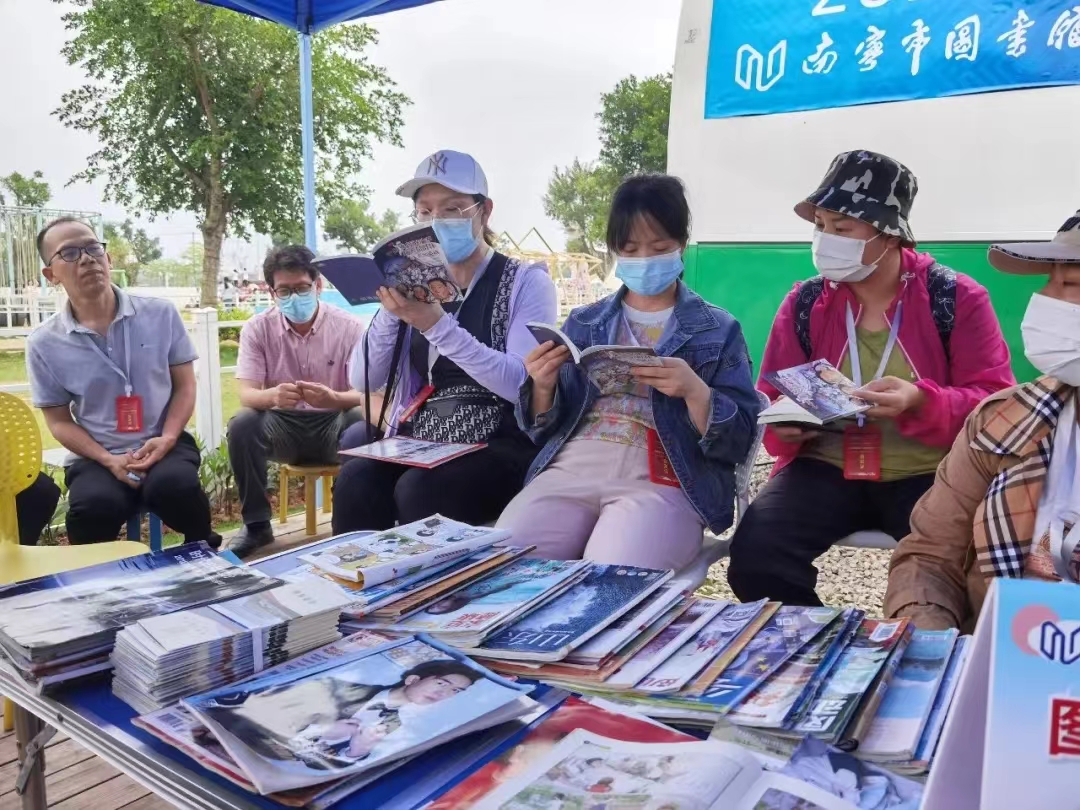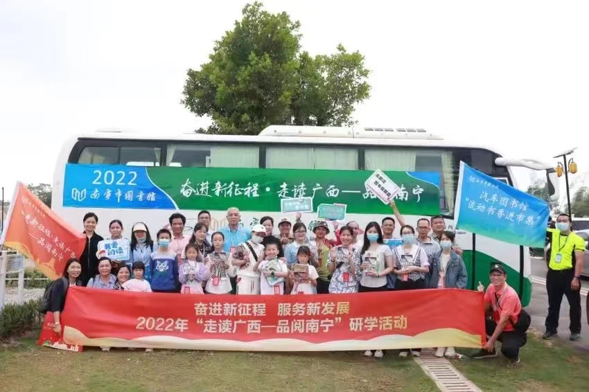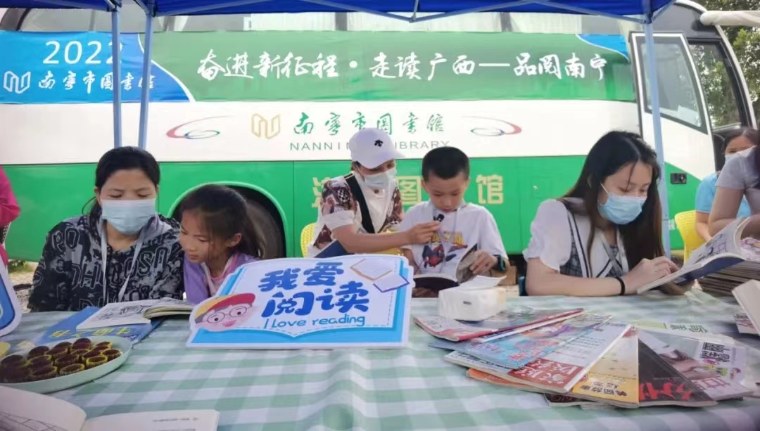 2022年5月21日,南宁市图书馆的流动图书车满载着2000册类型丰富的图书开进南宁顶蛳山汽车营地,开展形式多样的图书馆服务宣传活动,与顶蛳山汽车营地正在举办的中国旅游日“向野行·趣广西”生活节相互融合,为广大市民读者提供汽车图书馆服务。