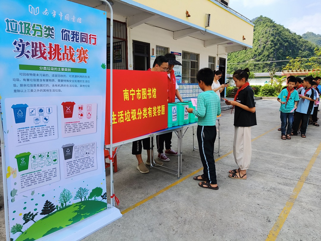 南宁市图书馆为全面落实强首府战略,因地制宜地推进农村生活垃圾分类工作,加快完善分类投放、分类收集、分类运输、分类处理的农村生活垃圾分类体系,提升农村生活垃圾分类工作水平,进一步优化农村人居环境打基础——开展提升乡村面貌的志愿服务活动。党员、志愿者一起走进村屯、走进课堂,推进乡村小学生活垃圾分类教育,提高乡村学校生活垃圾分类普及率,扩大农村生活垃圾分类覆盖面,努力搞好乡村垃圾分类,让南宁文明城市与上林美丽乡村相得益彰、共同发展。