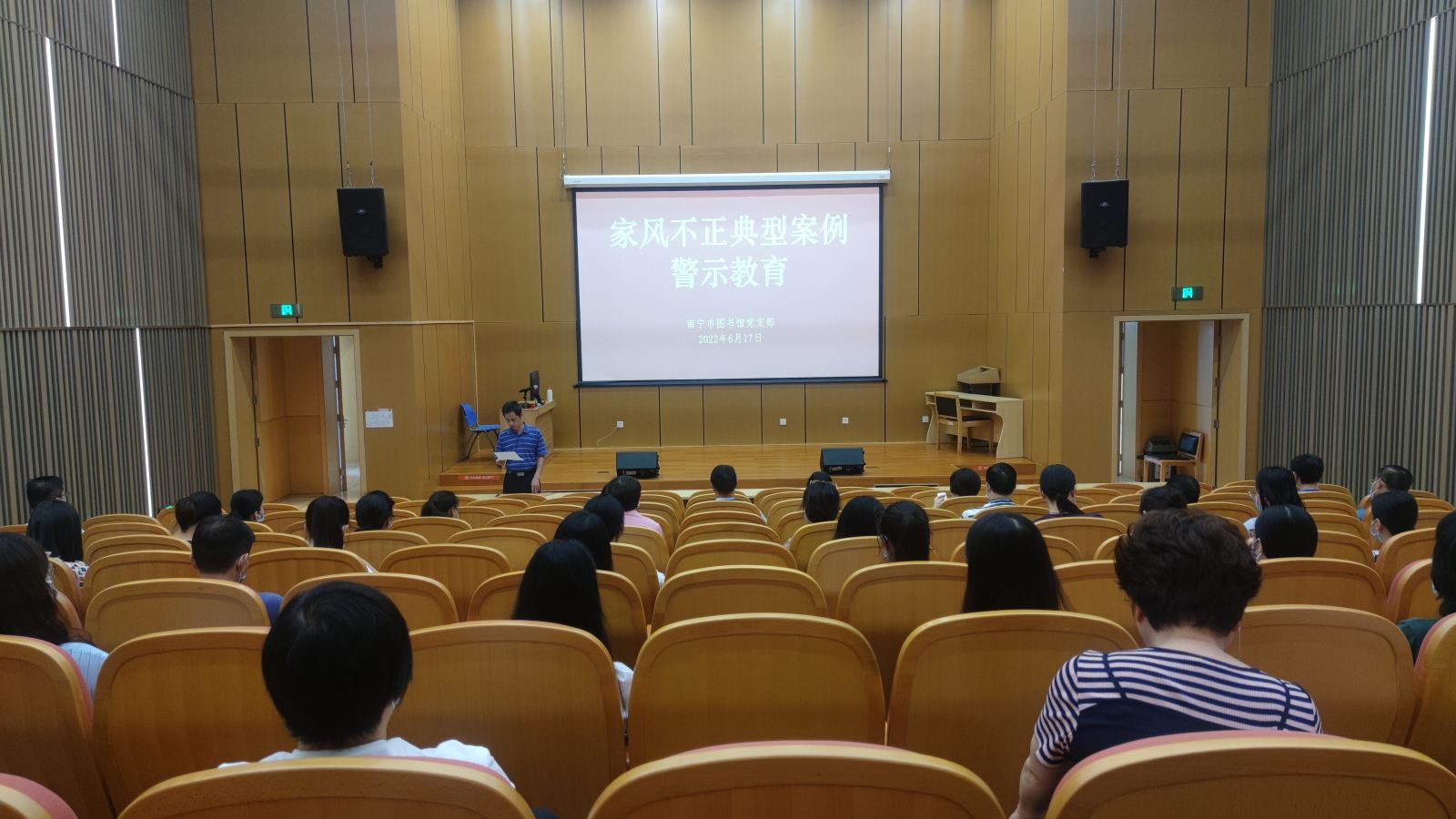 为深入开展以案为戒、以案促改、以案施教,引导全体干部职工牢记初心使命,永葆清正廉洁政治本色,6月17日下午,南宁市图书馆组织党员和干部职工80多人集中观看领导干部家风不正典型案例警示教育片,开展党风廉政教育。