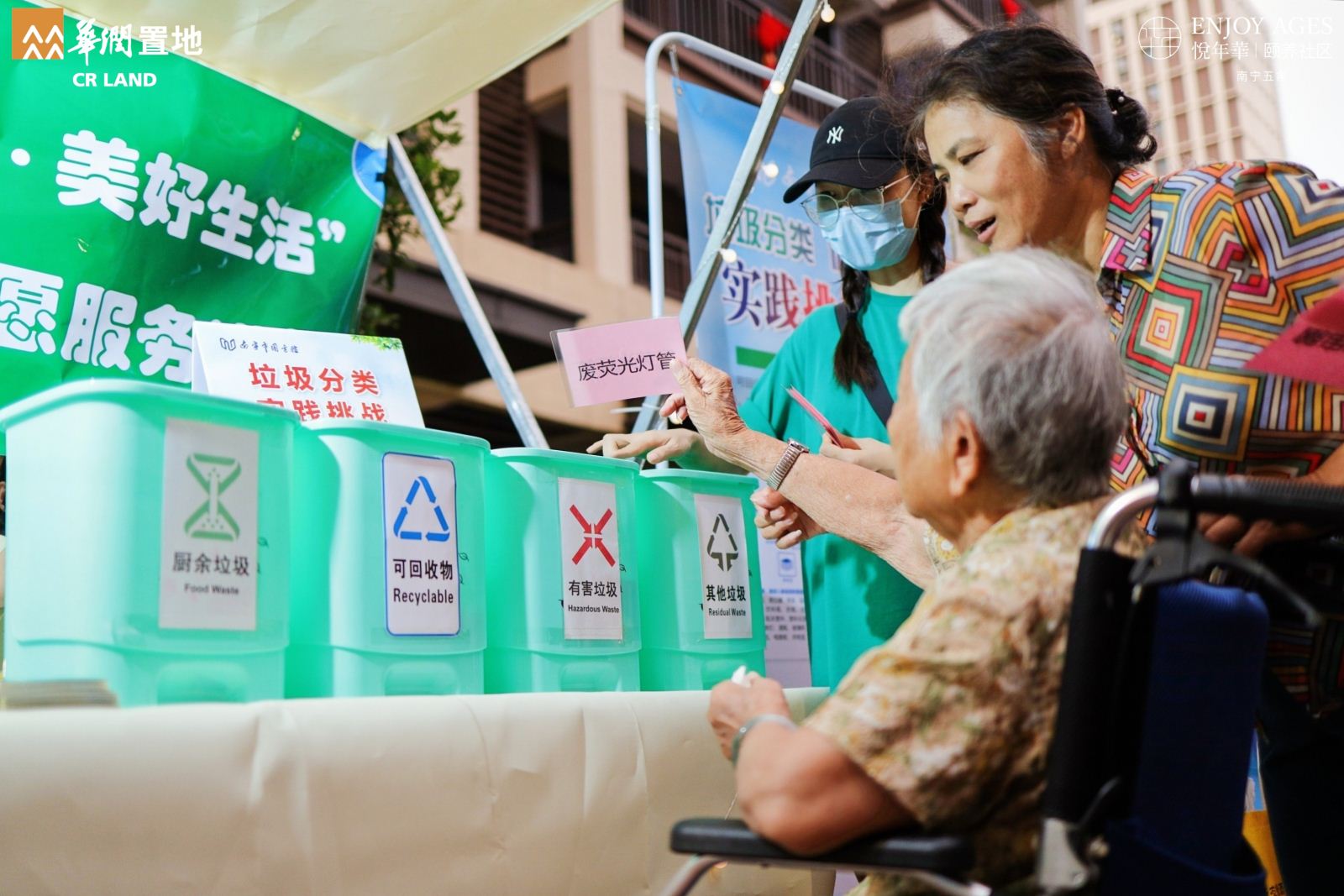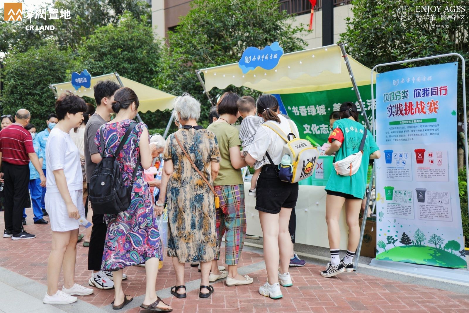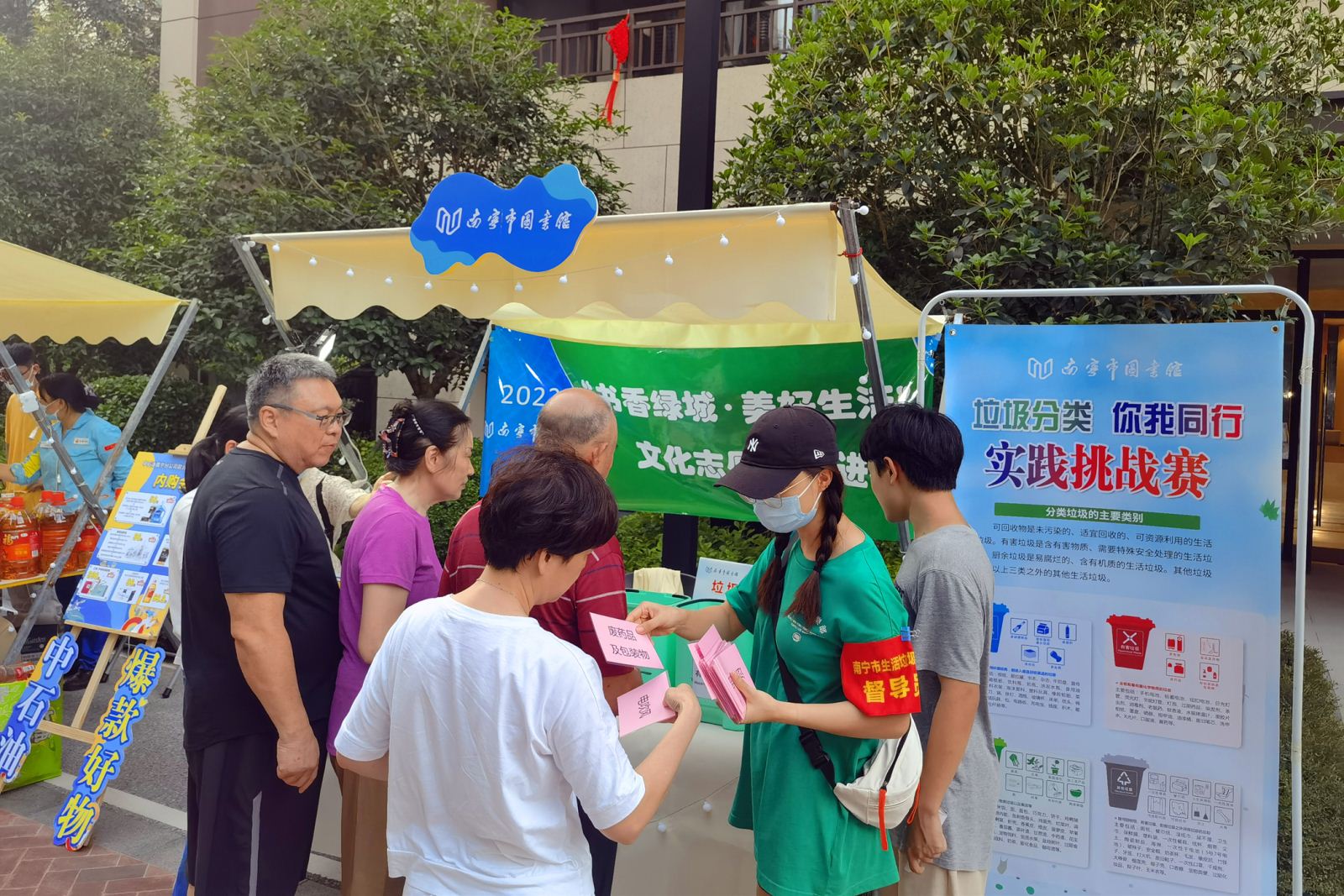 华润悦年华颐养社区“夏日理想生活节”集合惠民市集、互动游园、露天舞会等活动形式,旨在增强社区居民、社区会员与社区的粘性,营造欢乐、趣味的颐养社区生活。南宁市图书馆以文化志愿服务活动的形式加入华润颐养社区生活节的惠民市集,提供社保卡免押金办理借书证、图书馆服务宣传咨询、垃圾分类实践挑战和“老友读书会”图书漂流等4项文化服务活动,吸引了众多社区居民积极参与。现场共办理社保卡免押借书证2张,服务咨询20人次,图书漂流50册,最受欢迎的“垃圾分类实践挑战”活动参与居民约200人次,不仅向居民们科普了垃圾分类知识,还广泛宣传了图书馆全方面的社会教育职能。有居民好奇地提问:“你们是来自环保部门的吗?为什么推广垃圾分类知识?”我馆志愿服务队员非常自豪的回答:“我们来自南宁市图书馆,宣传垃圾分类是我们普及科学知识工作的一部分。垃圾虽小,却牵着民生,连着文明。科学的垃圾分类方法,将会改善我们的生活环境,减轻地球负担,为实现可持续发展做出贡献。希望大家人人动手,从小事做起,守护我们共同的家园。”
