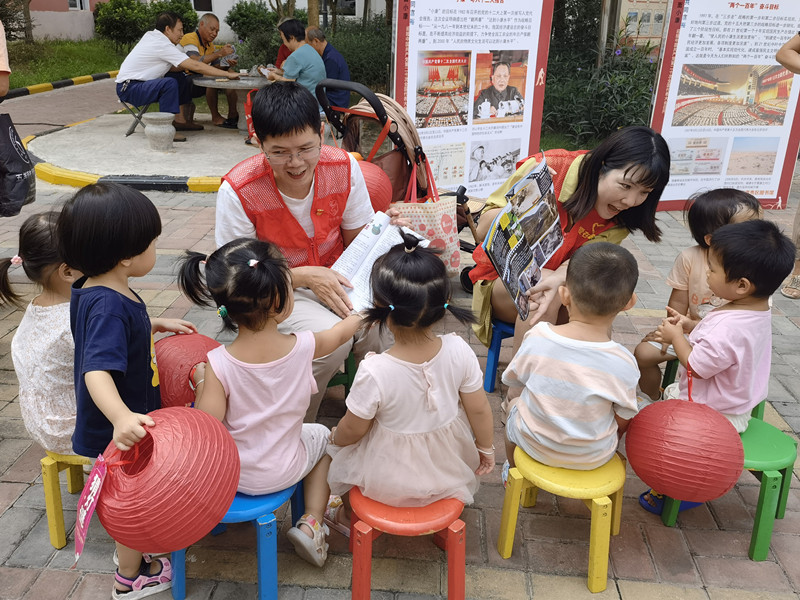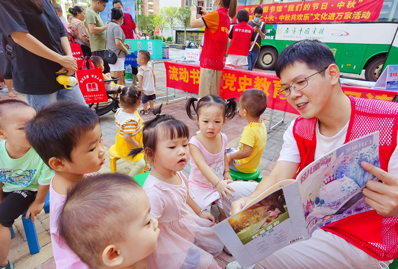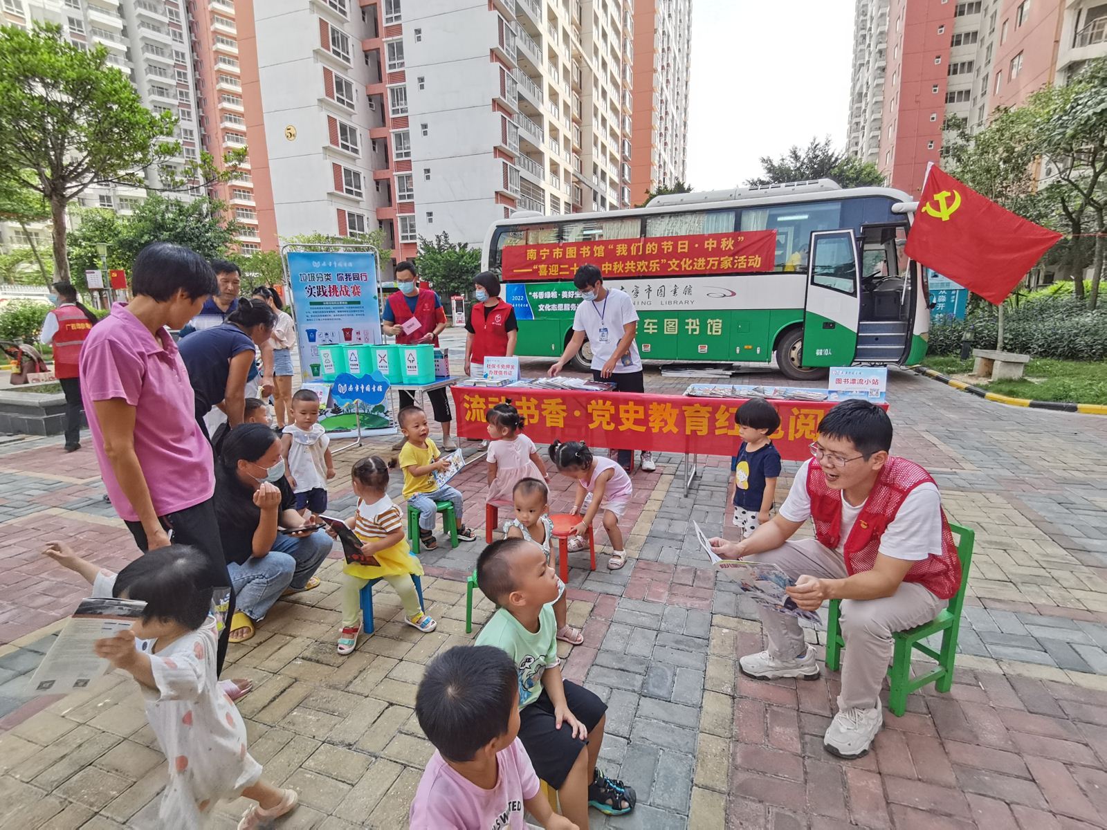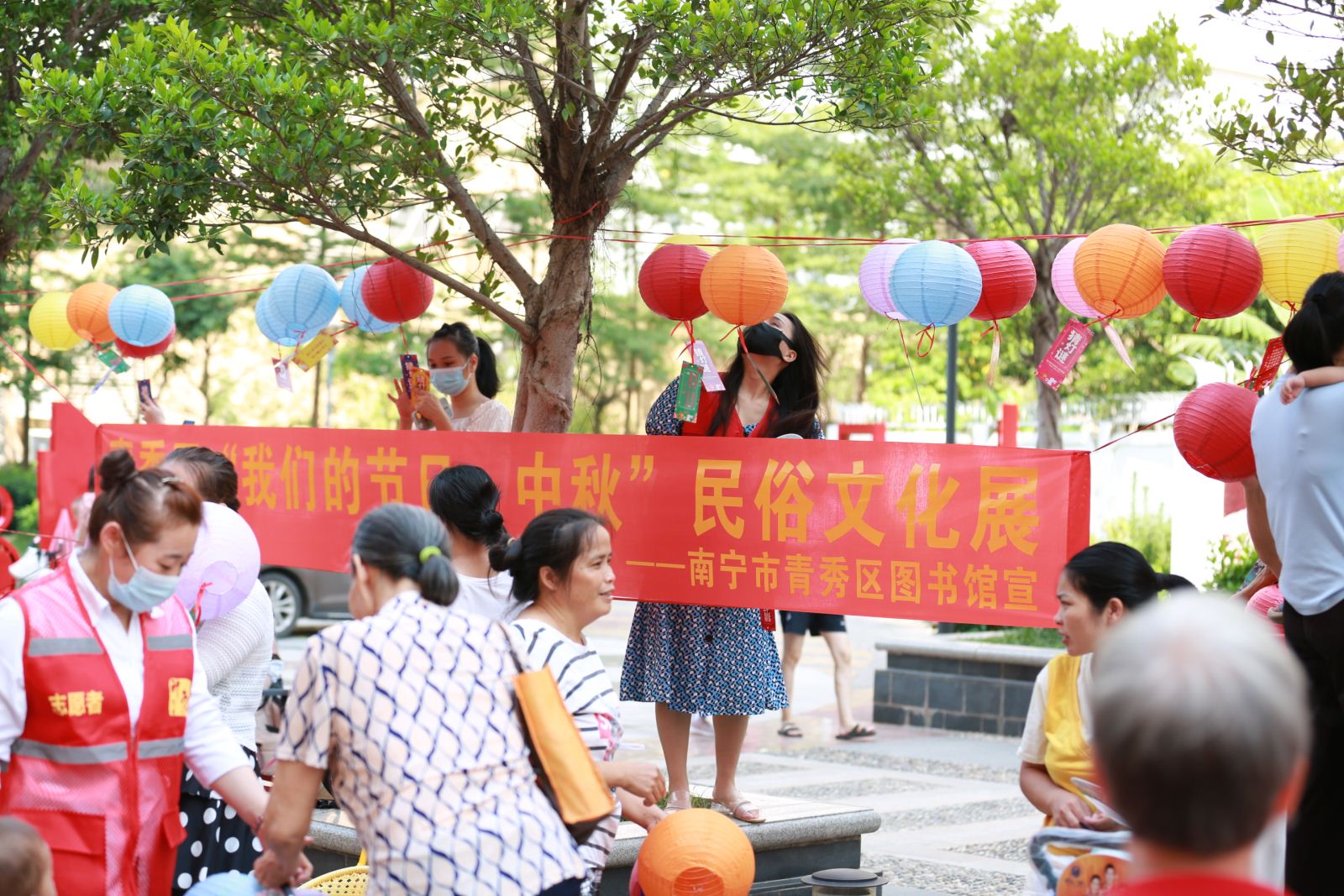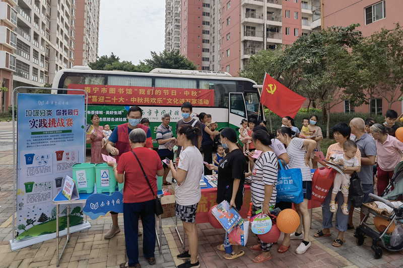 在活动现场,南宁市图书馆将流动图书车开进高坡岭人才公寓,为社区居民带去文学历史、医药养生、休闲旅游、少儿读物等多种类图书,方便社区居民零距离阅读;市图书馆党员先锋服务队与社区的学龄前儿童围坐在一起,生动讲述红色故事《一封鸡毛信》,小朋友们听得津津有味;在垃圾分类实践挑战赛台前,社区居民排起长龙,踊跃参与垃圾分类有奖答题,市图书馆文化志愿服务队为居民们耐心细致地讲解垃圾分类常识,让大家不仅在实践活动中学到知识,还收获满满。青秀区图书馆举办的中秋有奖灯谜让居民们感受到了浓厚的传统节日氛围,彩色灯笼高高挂,灯谜巧妙趣味多,猜完灯谜还能收获灯笼,传统文化活动受到社区居民的一致好评。活动现场还展出“决胜全面小康,奔向共同富裕”喜迎二十大主题展览,让广大群众共同见证久经磨难的中华民族从站起来、富起来到强起来的伟大飞跃历程,增强广大市民对中华文化的认同感和团结奋进的凝聚力。