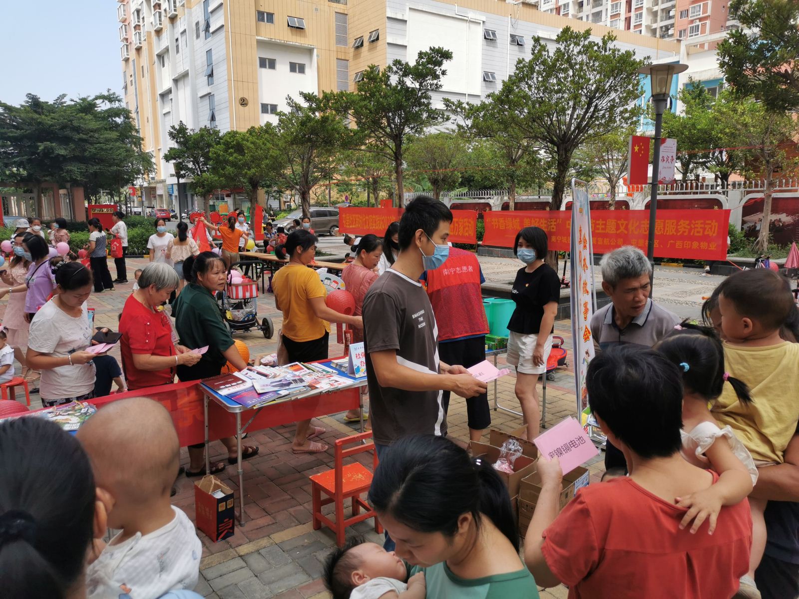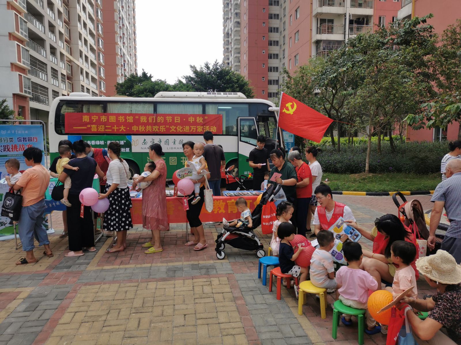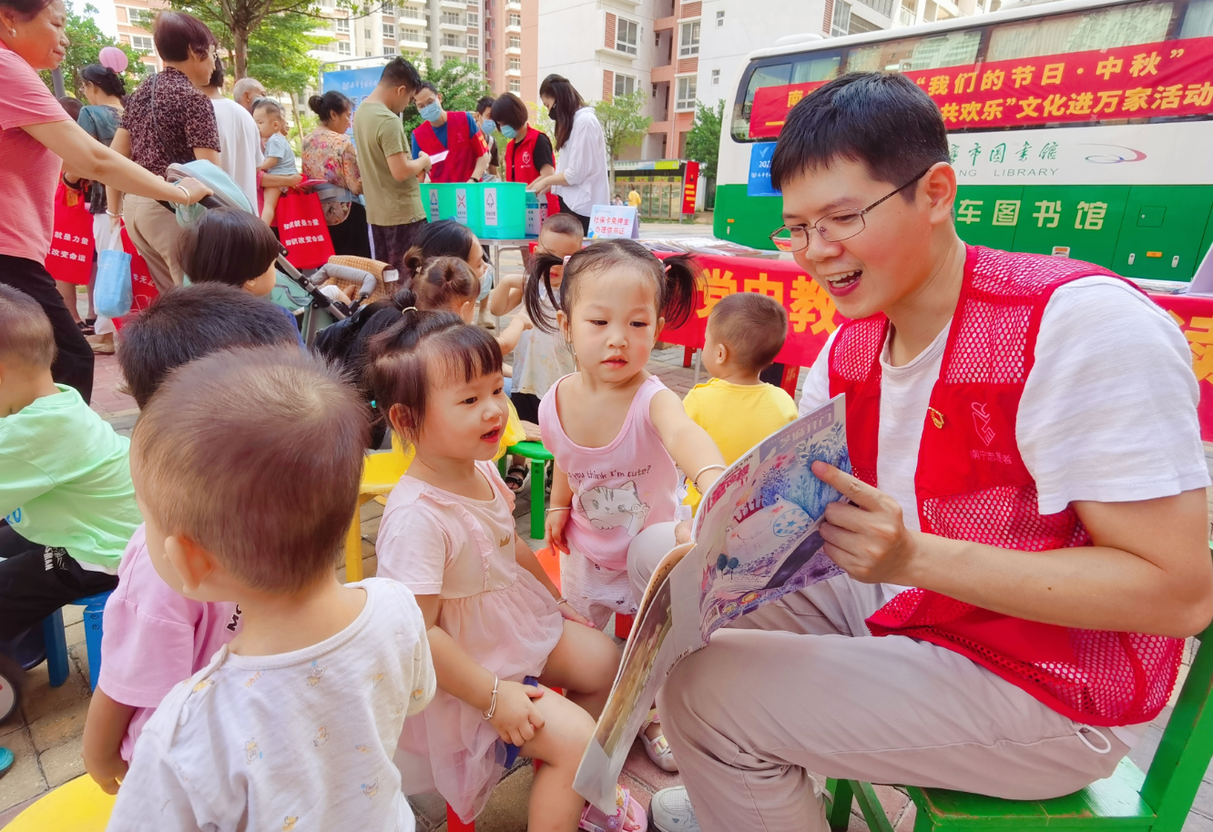 2022年9月7日,南宁市图书馆党支部组织党员会同相关部室、青秀区图书馆前往南宁市高坡岭人才公寓,开展“书香绿城·美好生活”文化志愿服务活动。本次活动主要围绕中秋节相关主题,开展汽车图书馆进社区、现场办证咨询、党史宣传教育、图书漂流、垃圾分类实践挑战等5项服务活动。其中党史宣传教育服务将党史小故事通过生动的讲解,寓教于乐,融学于趣,化教于心,吸引了大量小朋友围观聆听。