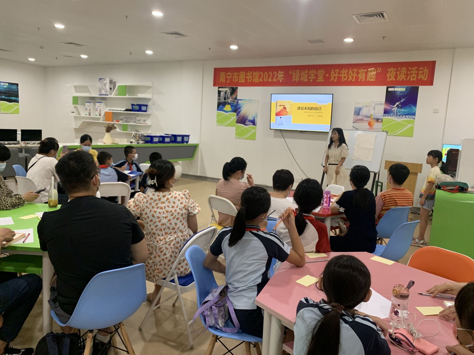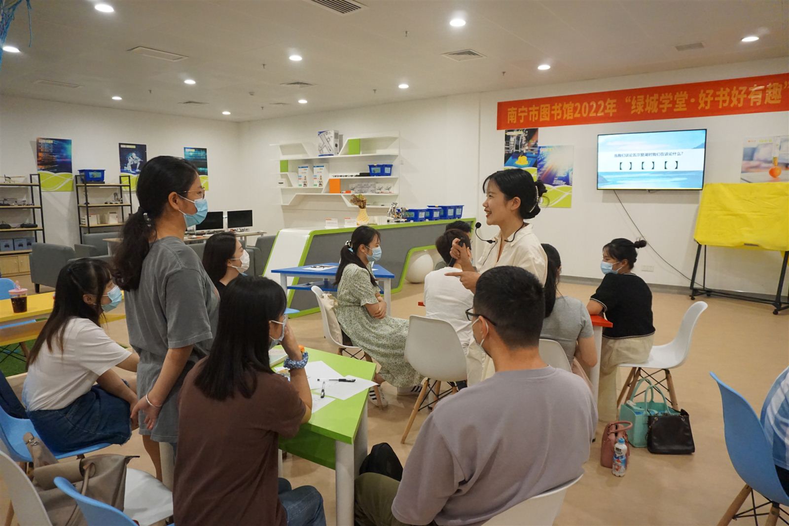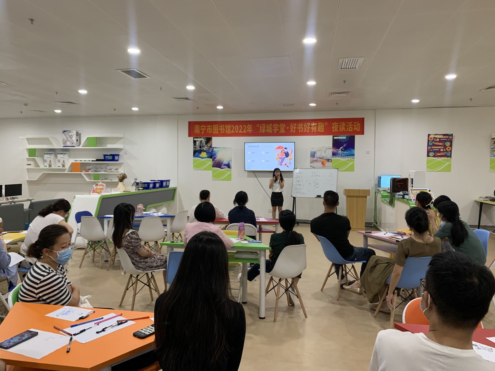 为满足广大市民群众夜间文化需求,助力“夜读南宁”城市文化品牌打造,不断丰富“绿城学堂·好书好有趣”的品牌内涵,2022年9月期间,南宁市图书馆每周三晚上与读者相约市图一楼创客空间,精选一本优质好书,围绕读者感兴趣的话题,用翻转课堂把书籍里的知识点用好玩有趣的互动式教学方式呈现,让更多读者燃起对阅读的热情,在分享中不断激发对自我思考。