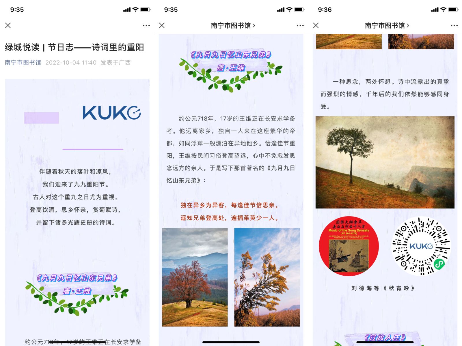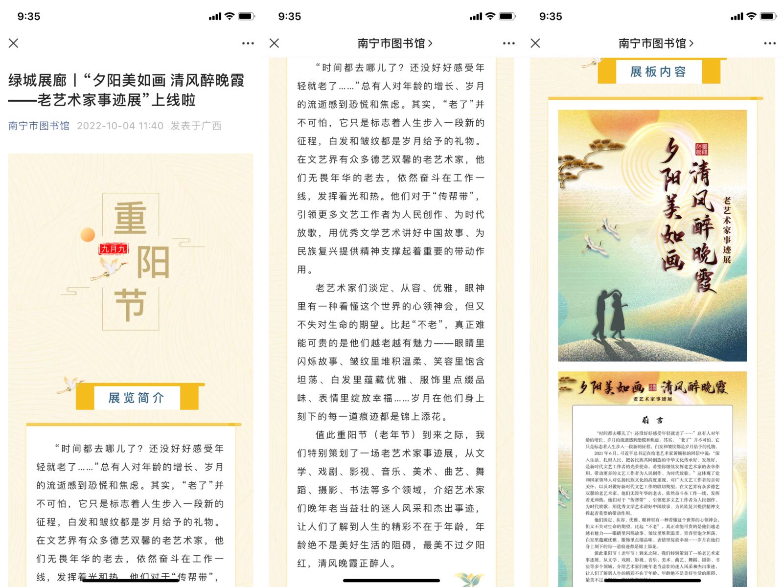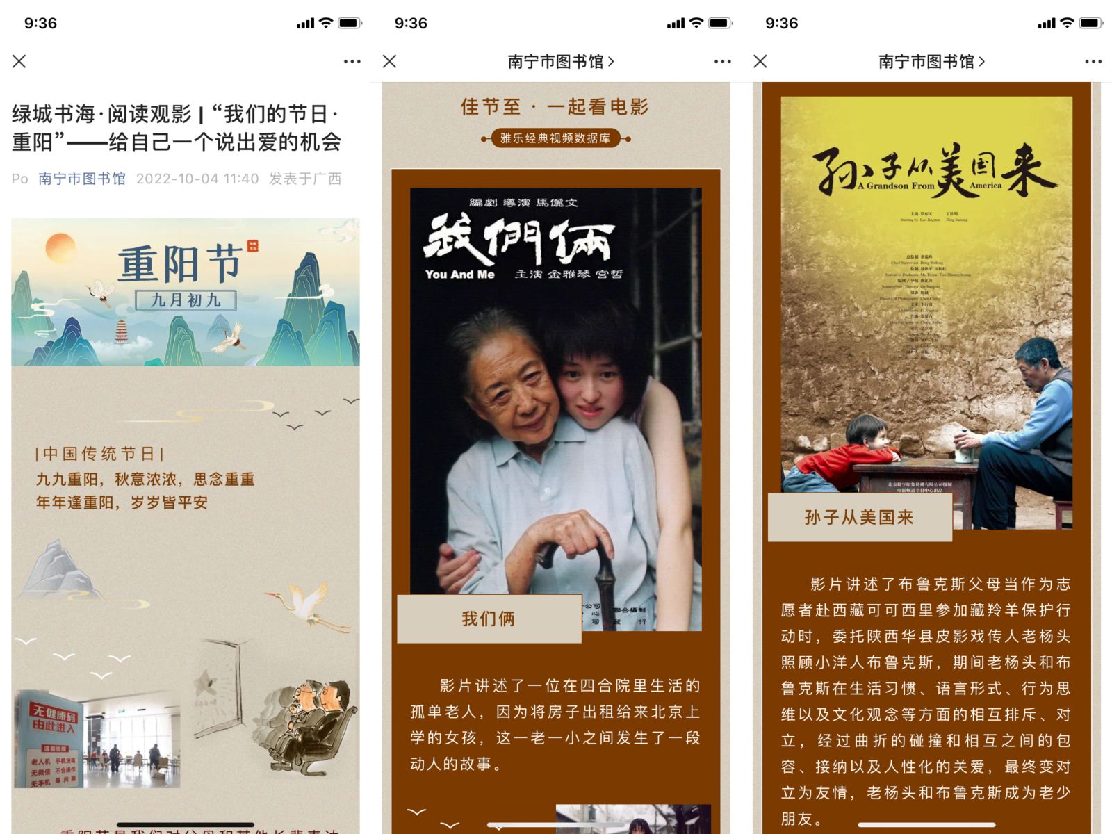 为传承中华民族爱老敬老的传统美德,弘扬社会主义核心价值观,倡导老有所为、老有所学、老有所乐的生活理念,传播家庭美满、社会和谐的文明风尚,南宁市图书馆阅读推广部在2022年重阳节期间,策划举办了4场重阳节主题线上活动,为老年读者朋友们送上祝福。