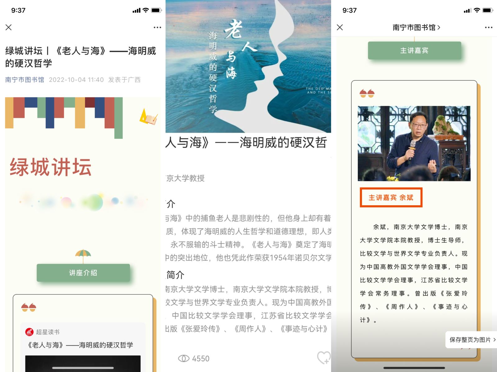主题线上活动包括文化展览、文学讲座、阅读观影和音乐赏析等,形式多样,内容精彩,吸引市民读者在线参与约200人次。文化展览“绿城展廊·夕阳美如画 清风醉晚霞——老艺术家事迹展”从文学、戏剧、影视、音乐、美术、曲艺、舞蹈、摄影、书法等多个领域,介绍艺术家们晚年老当益壮的迷人风采和杰出事迹,展现“最美不过夕阳红”的人生精彩;文学讲座“绿城讲坛·《老人与海》——海明威的硬汉哲学”由南京大学文学院博士生导师余斌教授讲述世界名著诺贝尔文学奖作品《老人与海》,剖析海明威的人生哲学和道德理想;阅读观影活动“我们的节日·重阳——给自己一个说出爱的机会”点播《我们俩》《那人那山那狗》《孙子从美国来》等影片,让青年读者们陪伴长辈看看电影,学习操作智能手机,借重阳节表达平日里说不出口的心意;音乐赏析活动“绿城悦读·节日志——诗词里的重阳”从传统诗词和有声音乐的分享中感受重阳佳节的氛围。