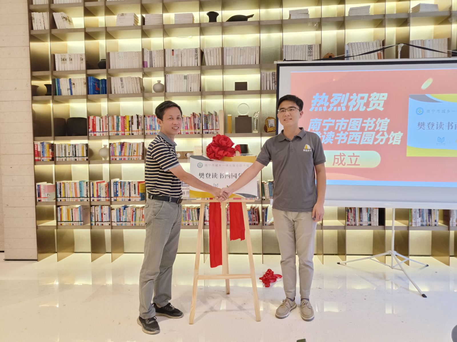 2022年10月12日,南宁市图书馆樊登读书西园分馆揭牌成立,南宁市图书馆党支部副书记廖集光、樊登读书广西联合创始人张志金共同为西园分馆揭牌,双方业务骨干和读者代表参加了签约揭牌仪式。