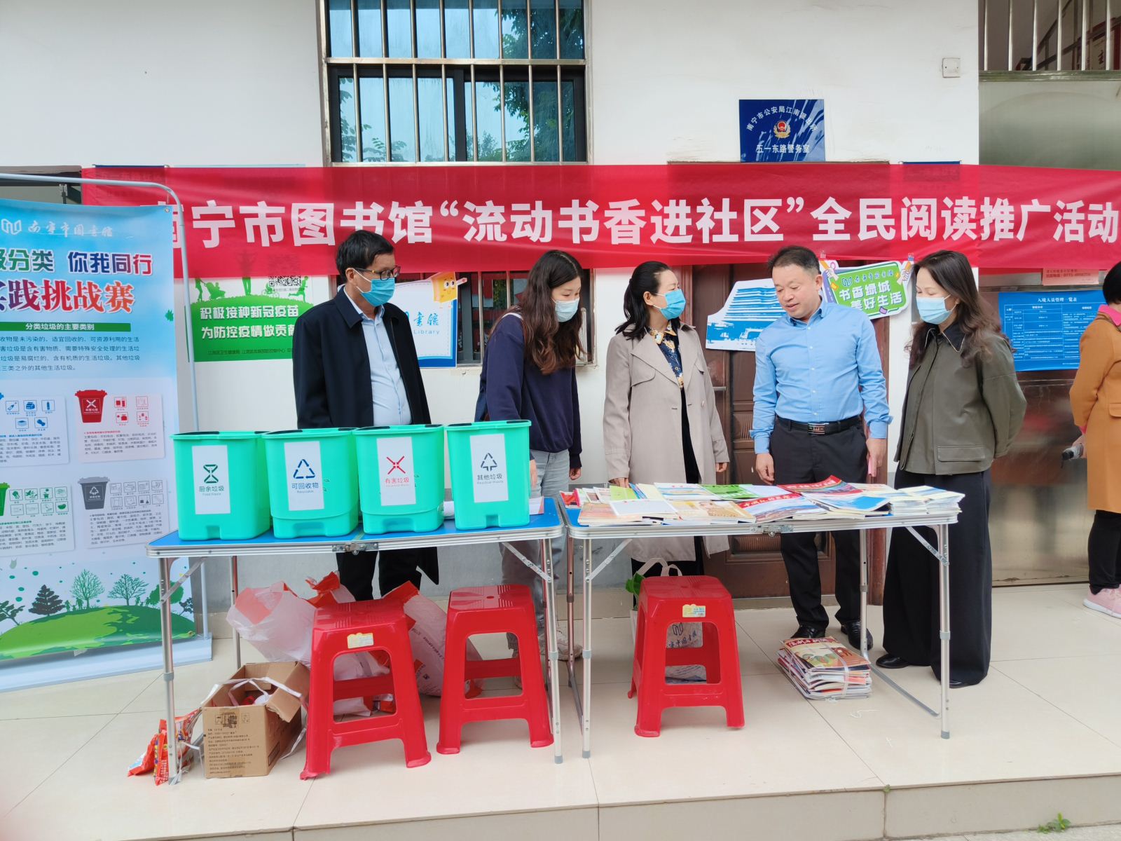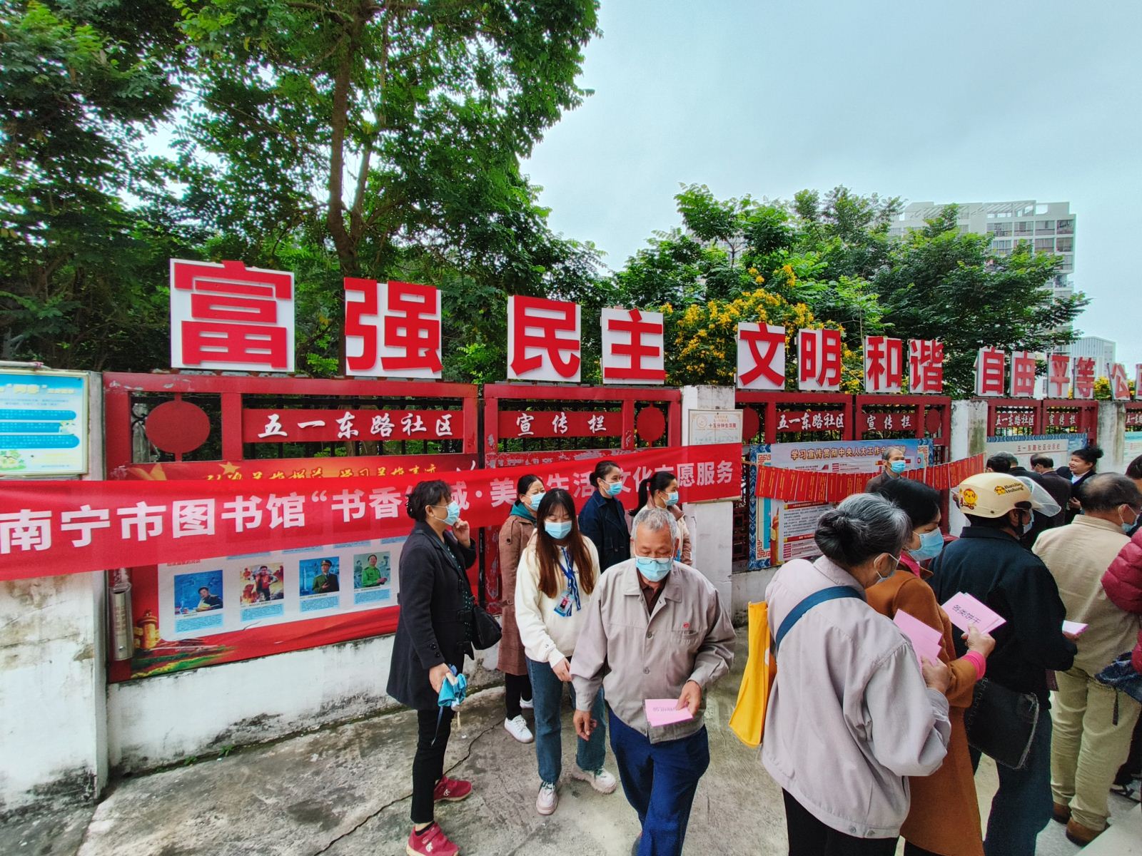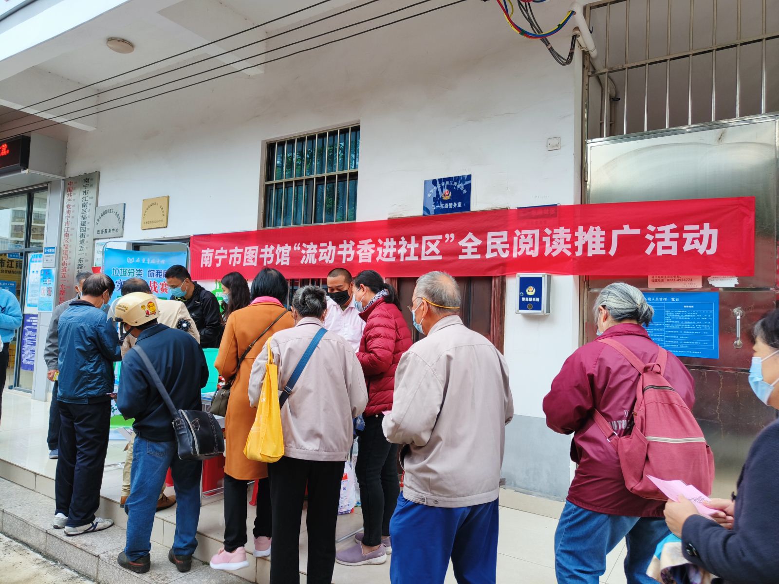 2022年11月30日下午,南宁市图书馆走进江南区五一东路社区开展“书香绿城·美好生活”系列文化志愿服务进社区活动。活动现场,南宁市图书馆文化志愿服务队为社区居民提供图书馆服务宣传、学习党的二十大精神知识有奖竞答、垃圾分类实践挑战赛、图书漂流和社保卡免押办证等5项文化惠民服务和阅读推广活动,把贴心服务送到居民身边,不仅为居民读者送上切实福利,还广泛宣传了图书馆全方面的社会教育职能。