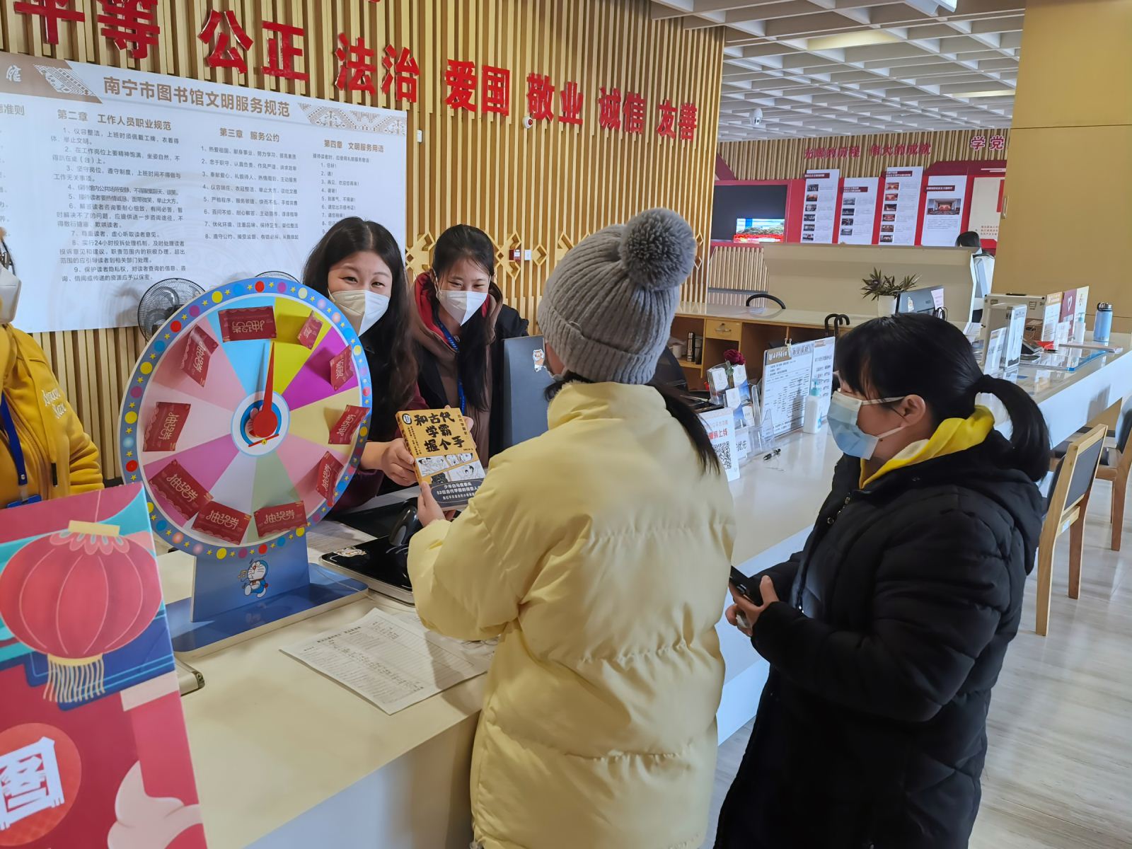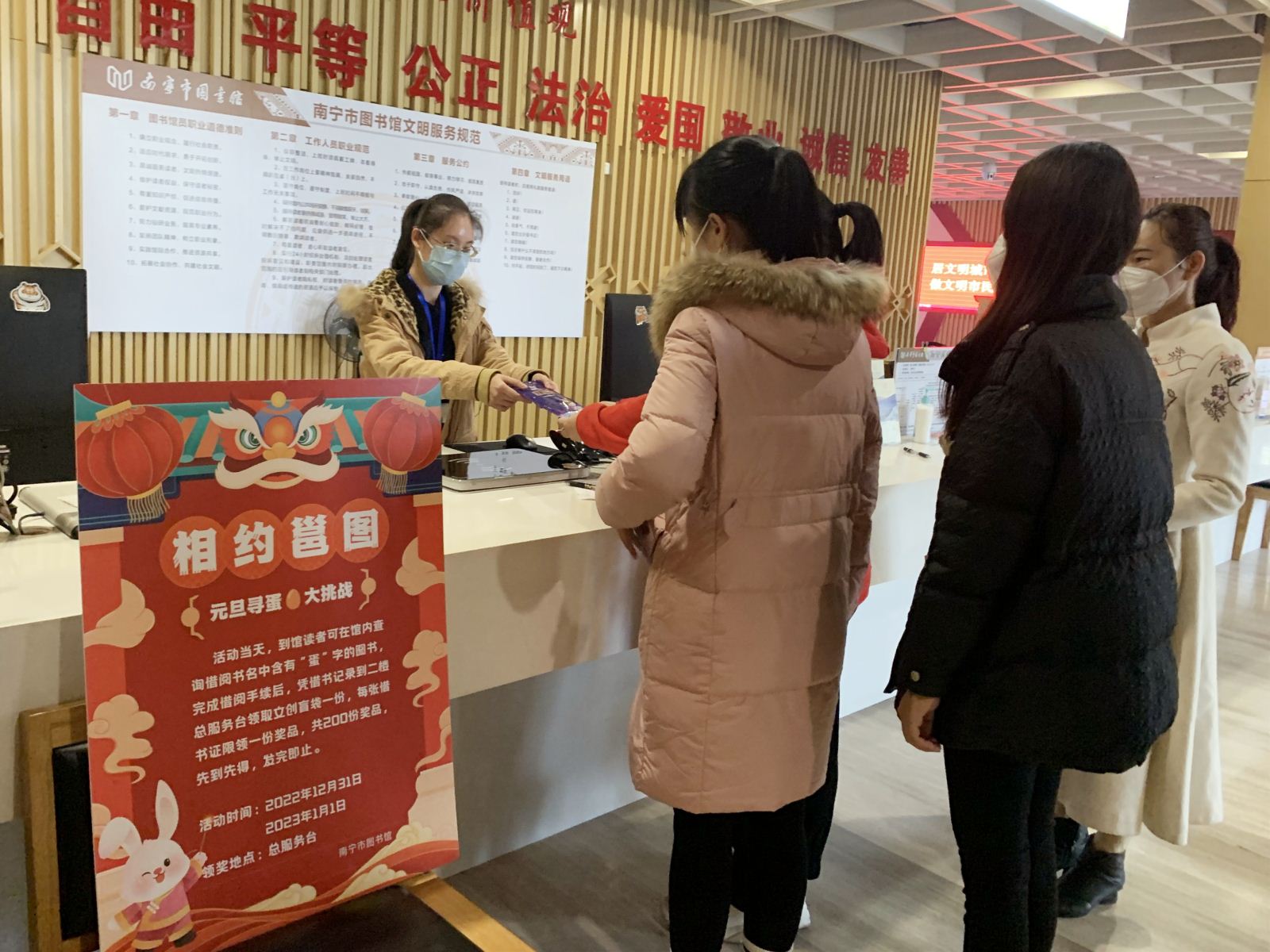 二楼总服务台前也热闹非凡,2022年12月31日至2023年1月2日,新办证读者可获得一次转盘抽奖资格,抽取“学霸奖”“盲盒奖”“徽章奖”等不同奖项,领取图书《和古代学霸握个手》、文具盲盒和文创徽章等不同奖品。同时,元旦假期到馆读者可在馆内查询借阅书名中含有“蛋”字的图书,完成借阅手续后凭借书记录到二楼读者总服务台领取文具盲盒一份。不同的活动形式满足不同类型读者的需求,让读者在新年的欢乐中收获来自南宁市图书馆充满书香的独家祝福。