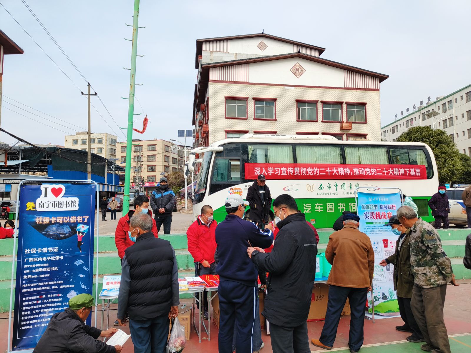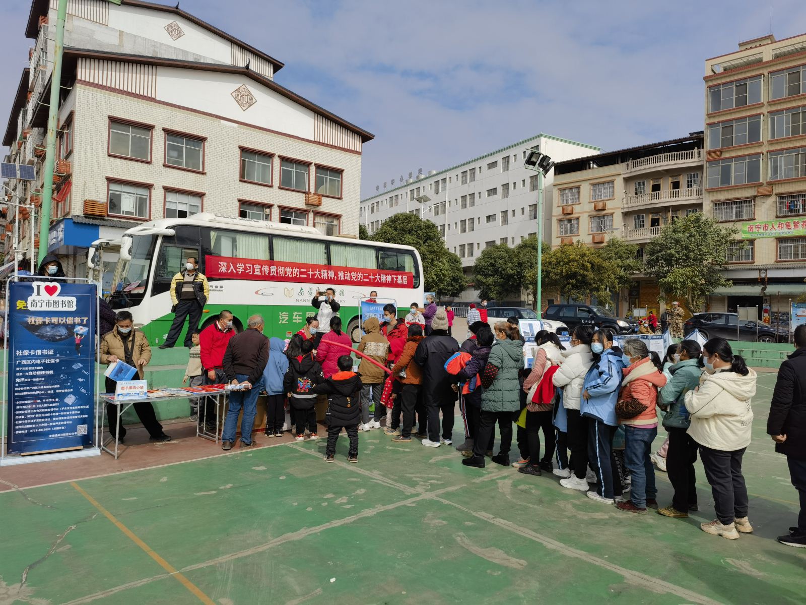 为深入学习宣传贯彻党的二十大精神,推动党的二十大精神下基层,2023年1月3日,南宁市图书馆党支部副书记廖集光带领阅读推广部到邕宁区中和镇开展“流动书香·助力乡村振兴暨文化志愿服务进社区活动”。本次活动作为南宁市政协“我为群众办实事 送文艺下乡 助乡村振兴”活动的配套内容之一,市图书馆与市群众艺术馆共同为邕宁区中和镇干部群众送上丰盛的文化大餐。