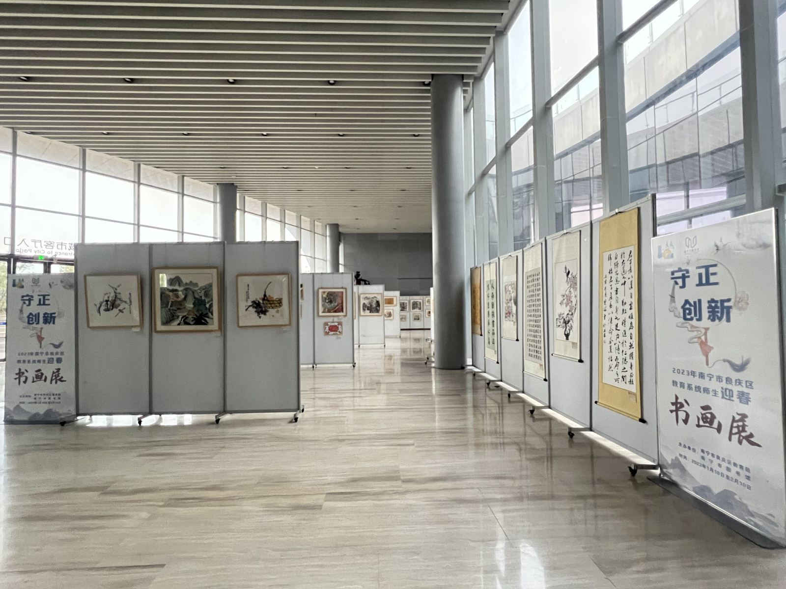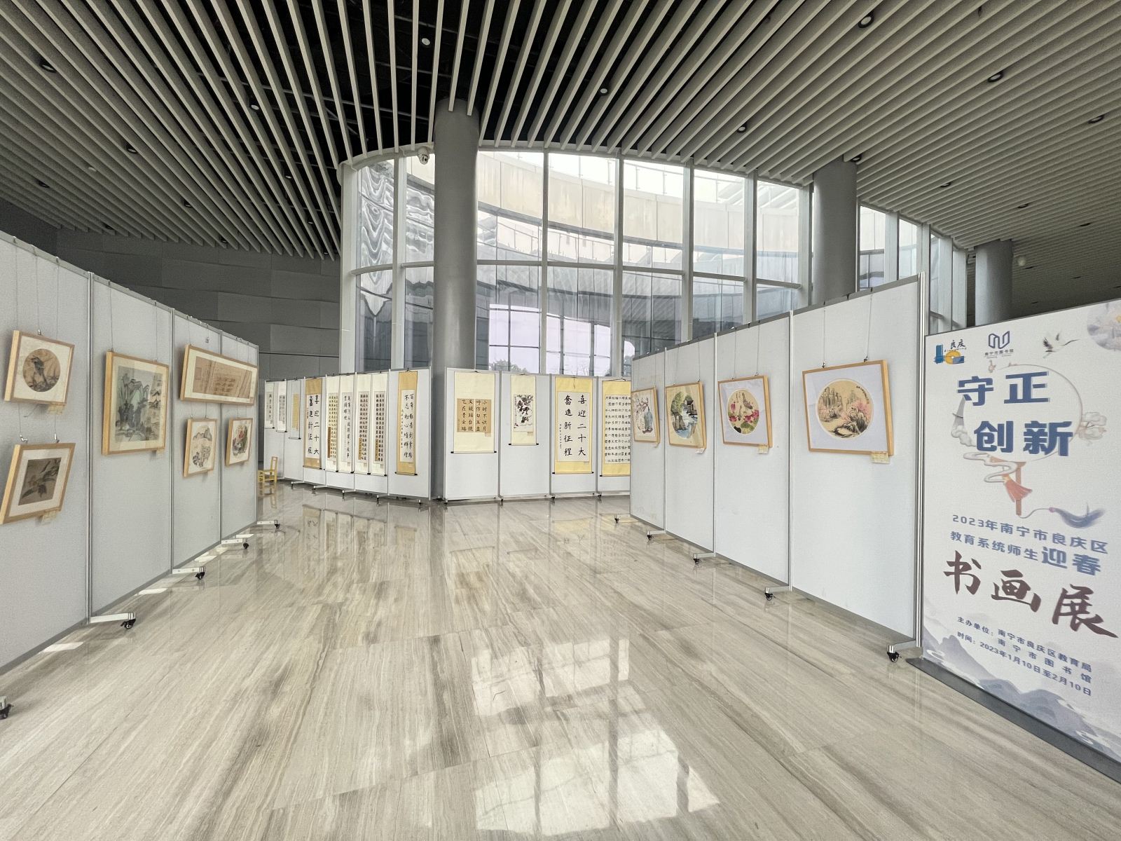 为深入贯彻落实《关于推动广西公共文化服务高质量发展的实施意见》,推动公共文化服务与教育融合发展,拓展阵地服务功能,充分发挥图书馆平台作用,进一步强化美育育人功能,推动区域艺术教育发展,南宁市图书馆联合南宁市良庆区教育局在2023年元旦春节期间举办“绿城展廊·守正 创新”迎新春书画展活动。